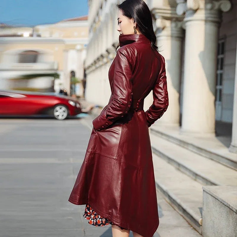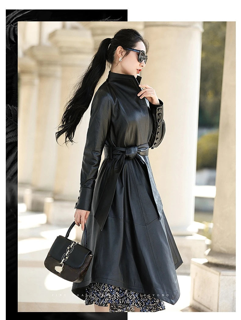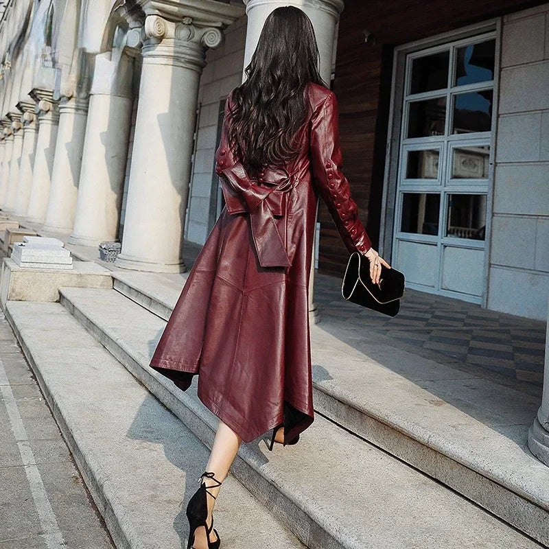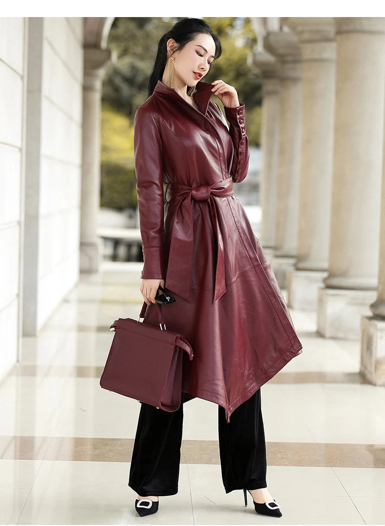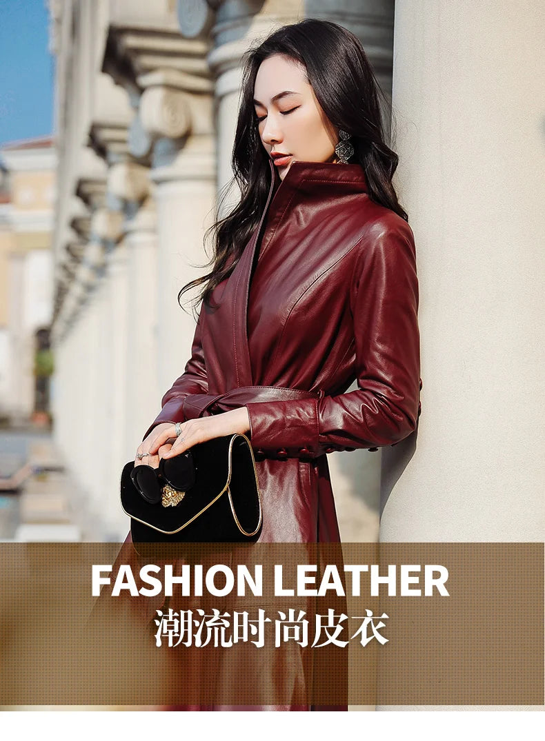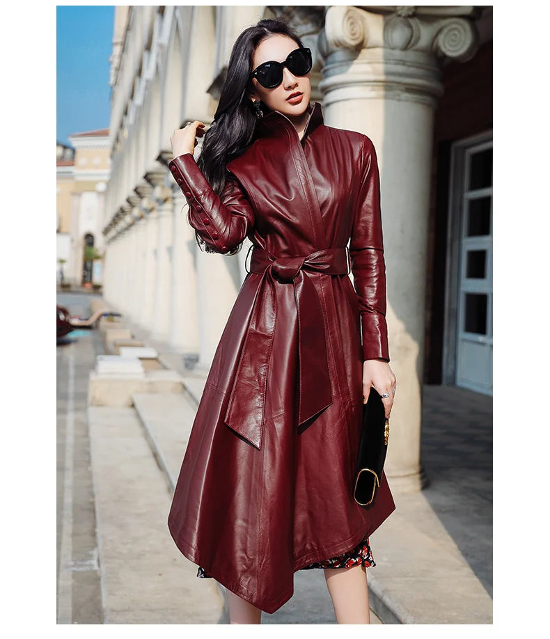 Autumn Fashion Genuine Leather Long Trench Coat for Women