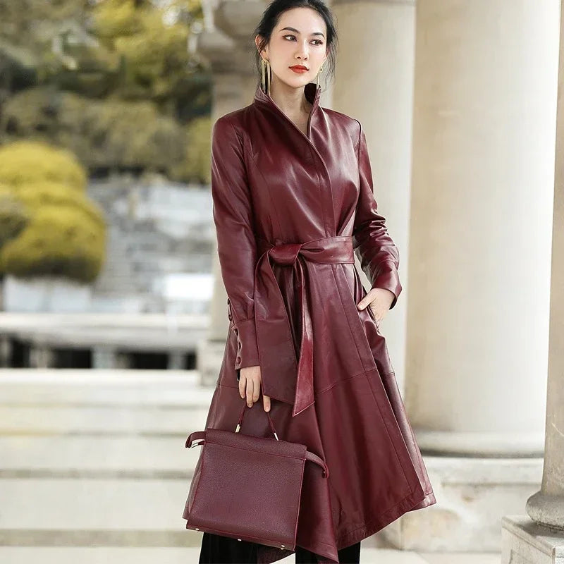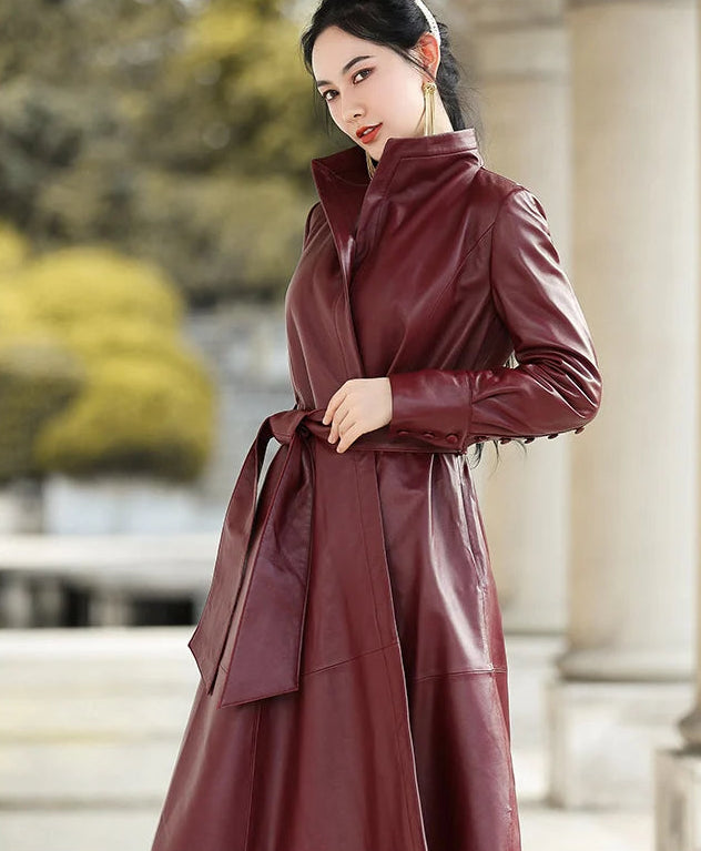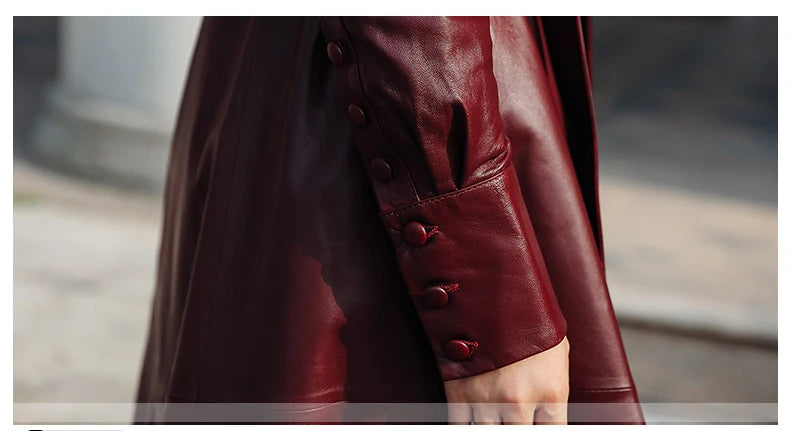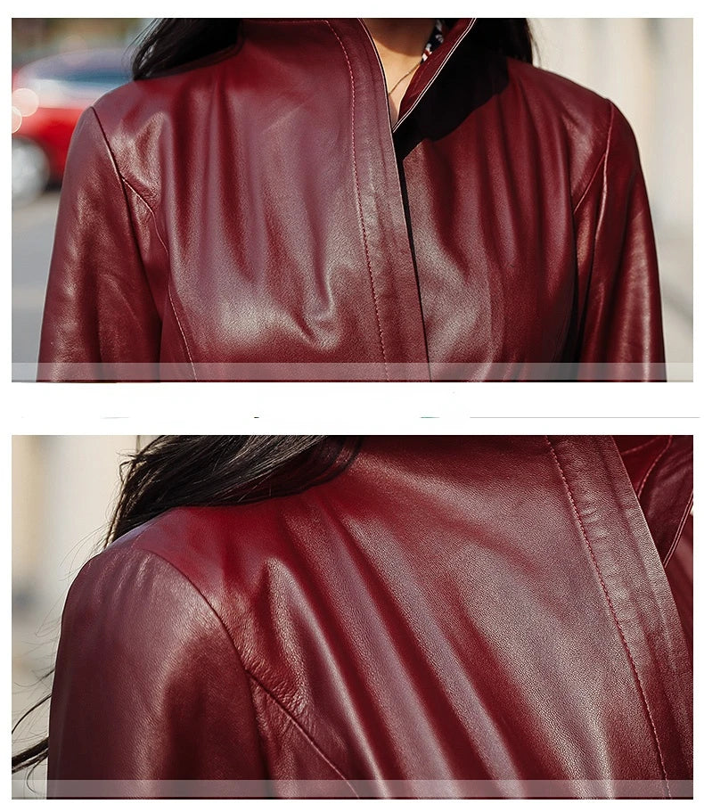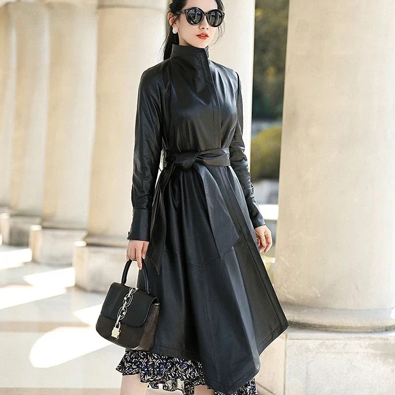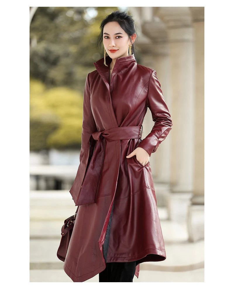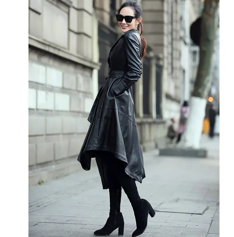 Autumn Fashion Genuine Leather Long Trench Coat for Women
