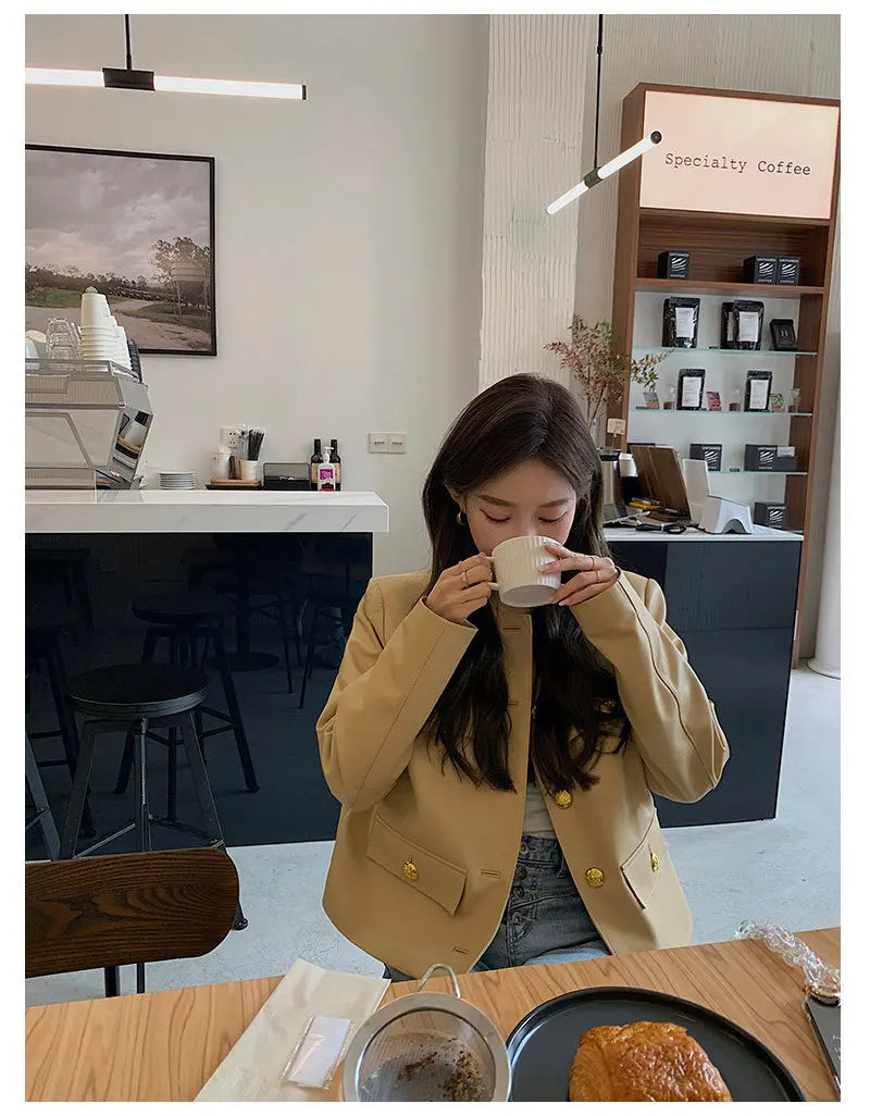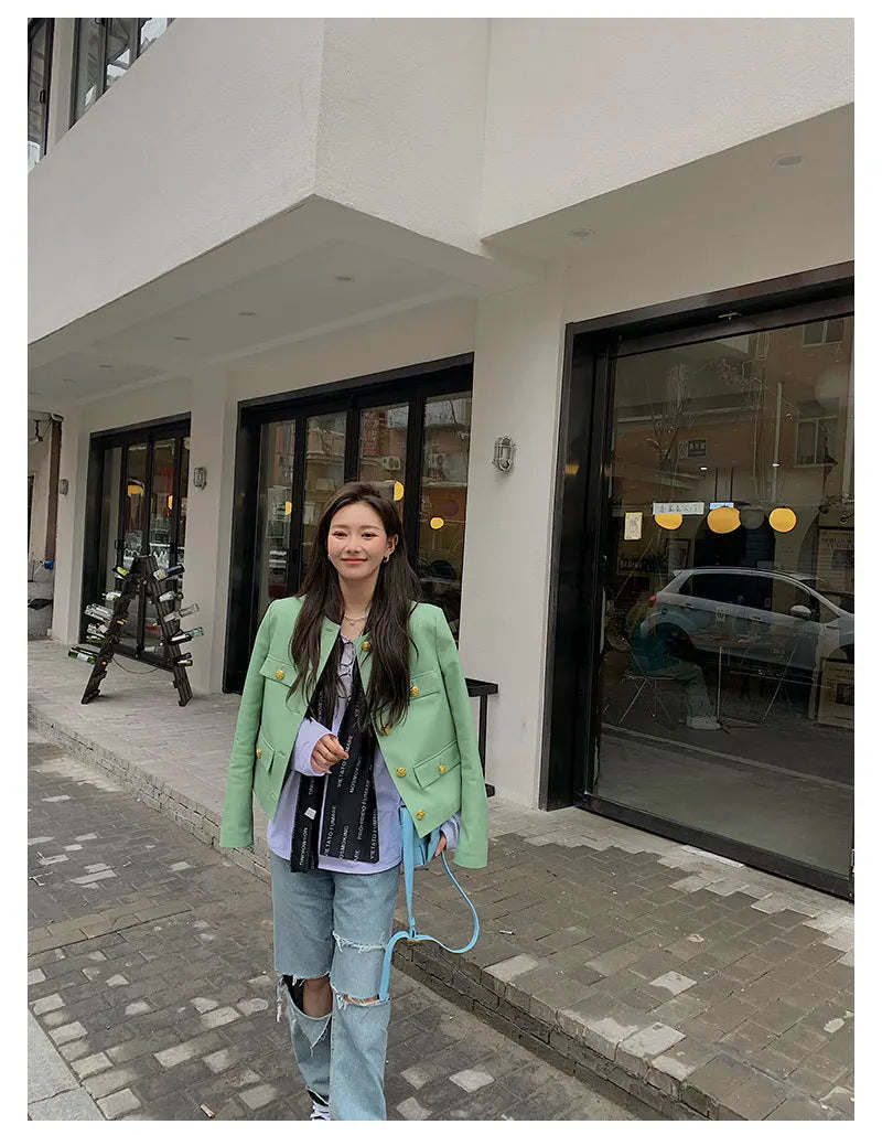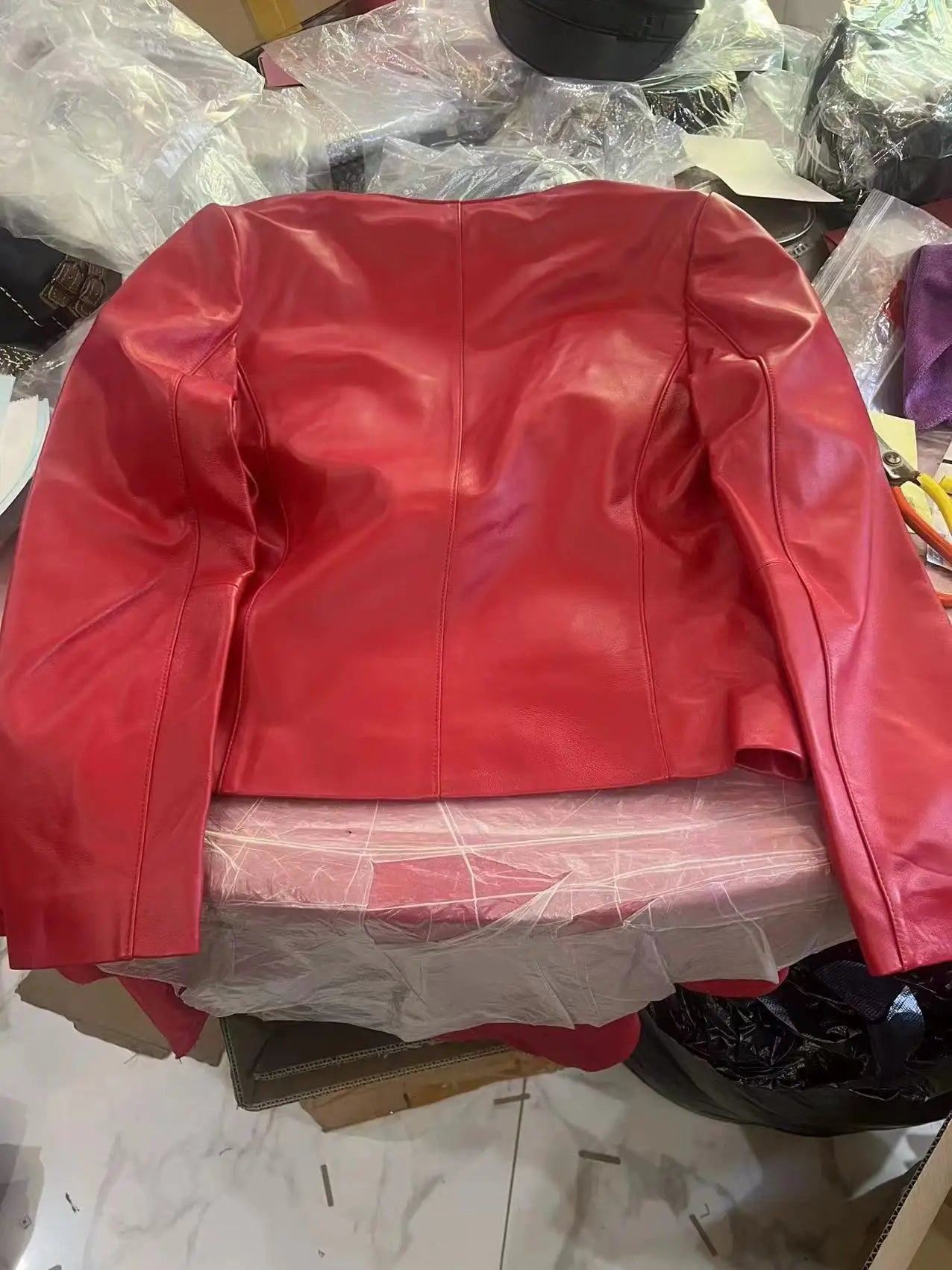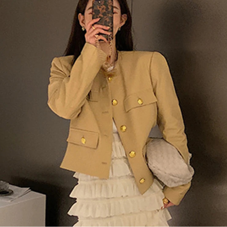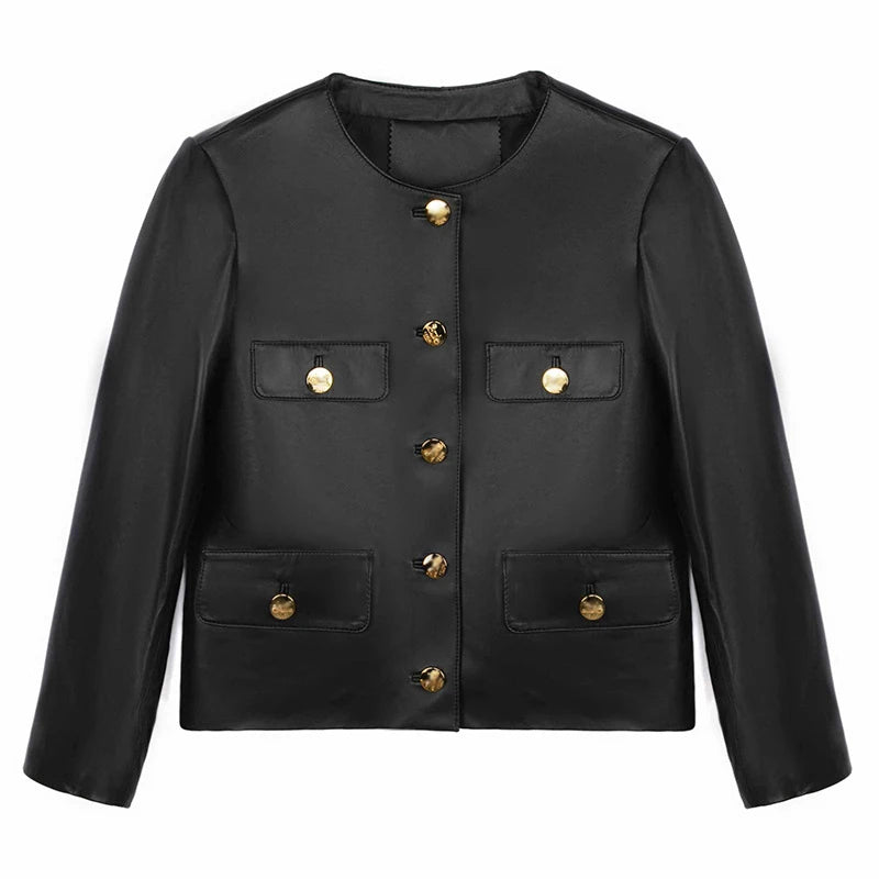 Looking for an elegant and stylish women's jacket? Then this is for you. Made of sheepskin leather, this short jacket has gold buttons that give it a luxurious look. Designed with pockets, it is convenient. Wear it to amp up your style. Order now!