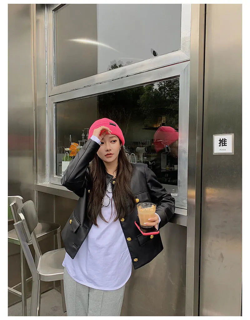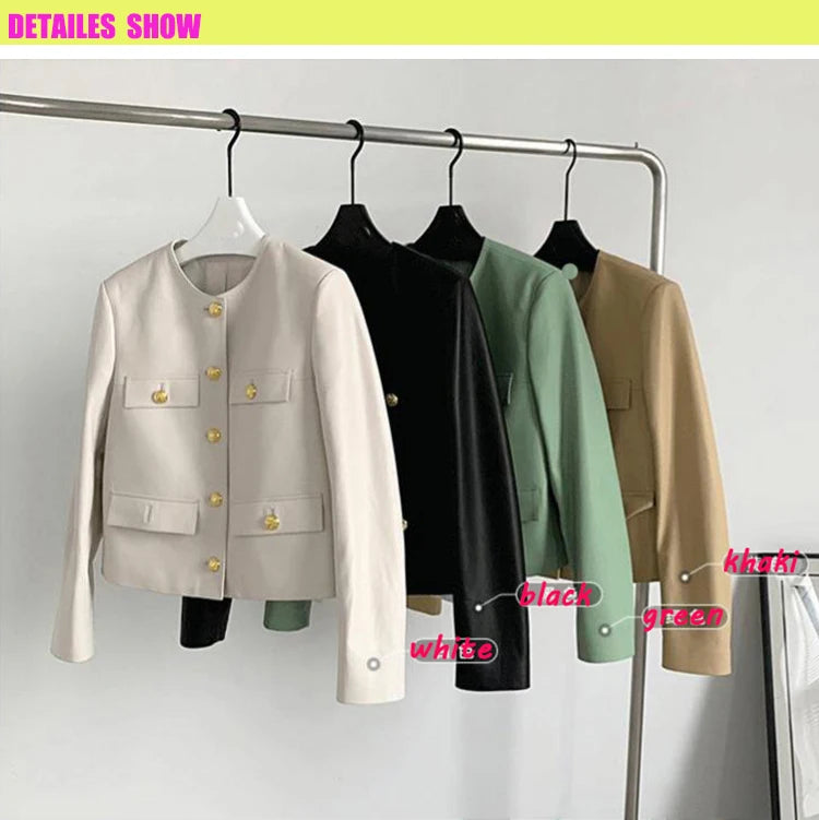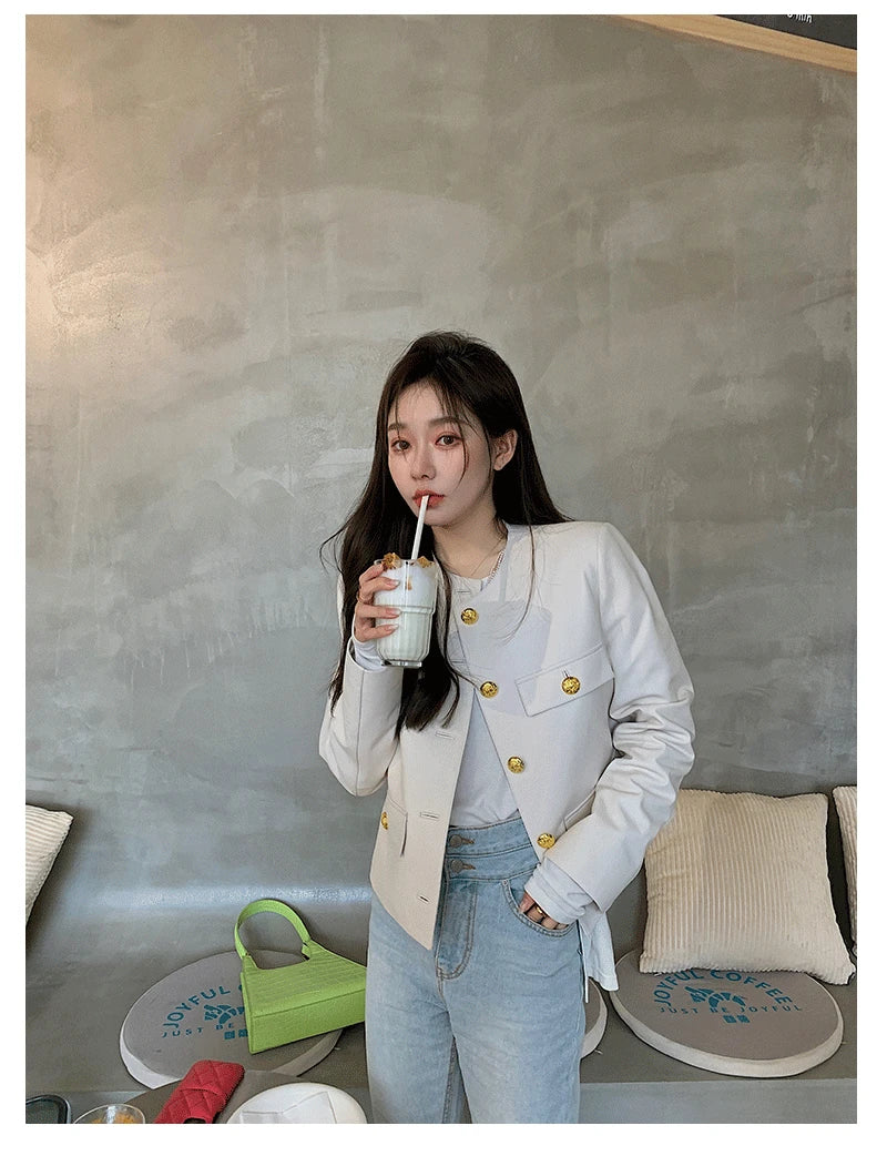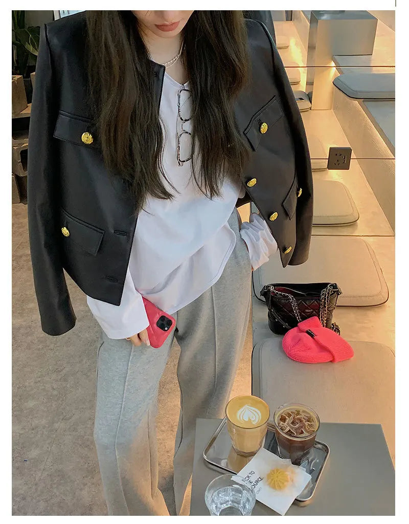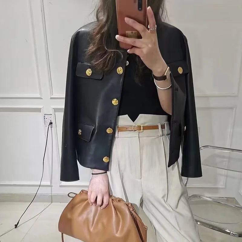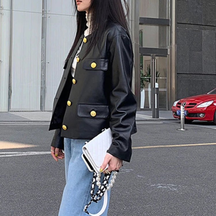 Autumn Sheepskin Leather Retro Gold Button O-neck Pocket Short Jacket