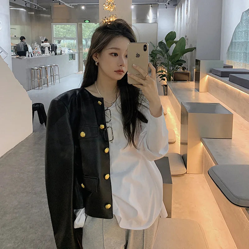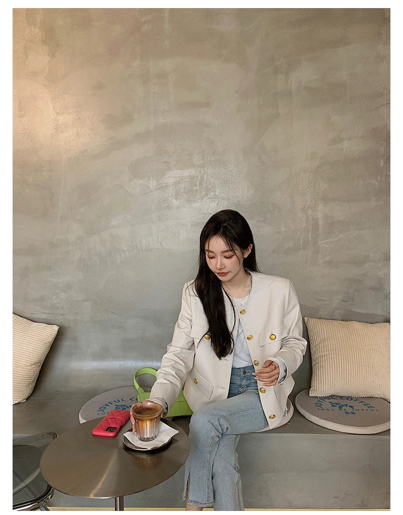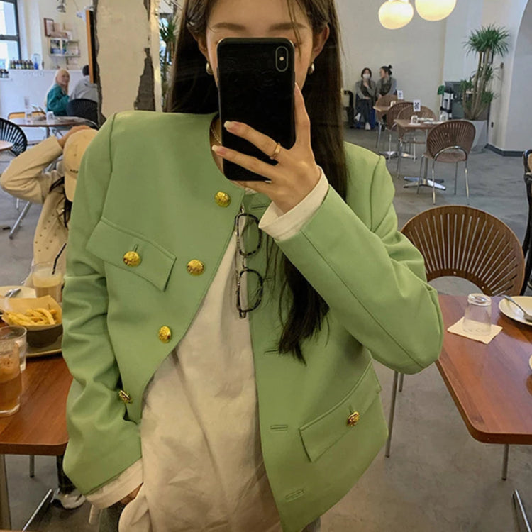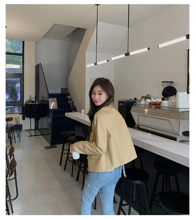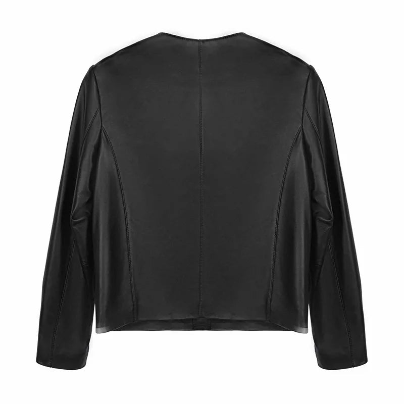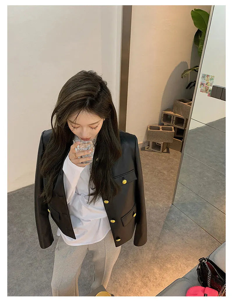 Autumn Sheepskin Leather Retro Gold Button O-neck Pocket Short Jacket