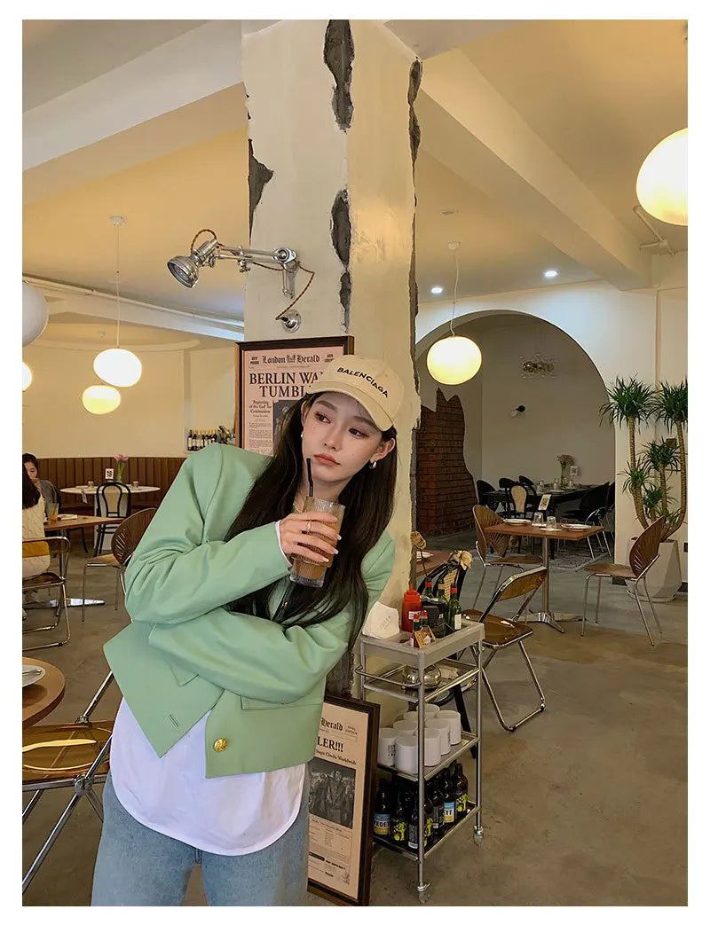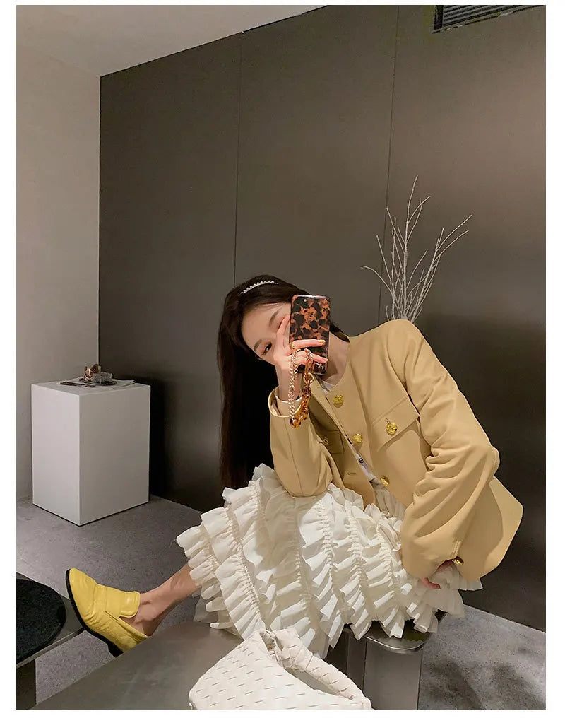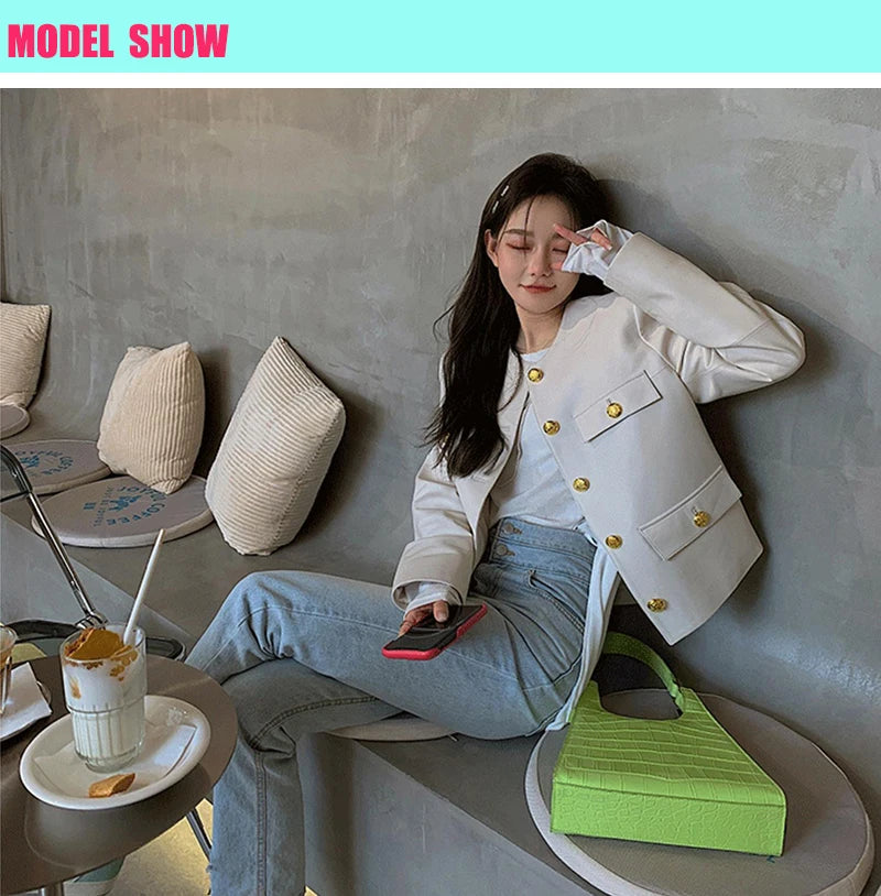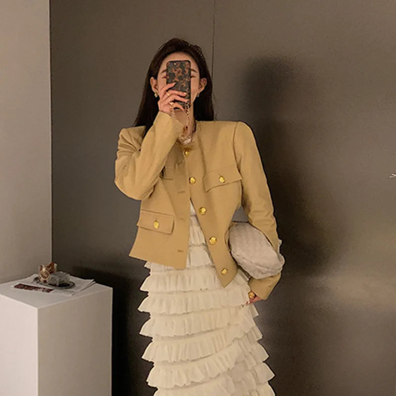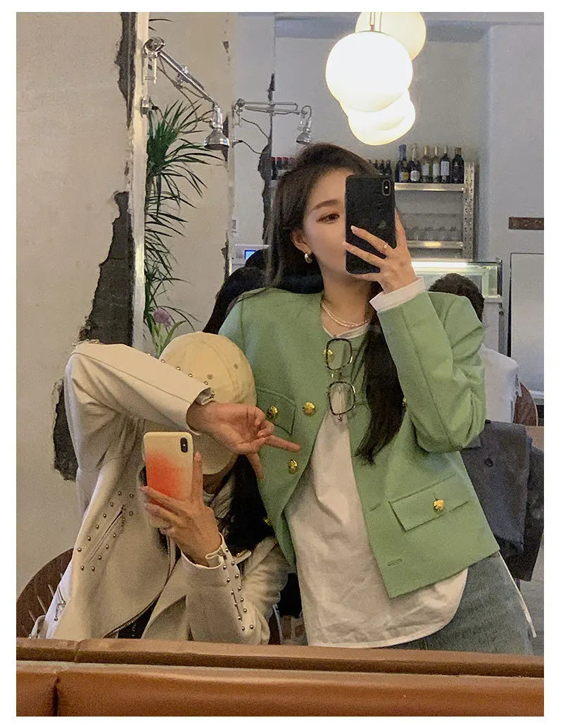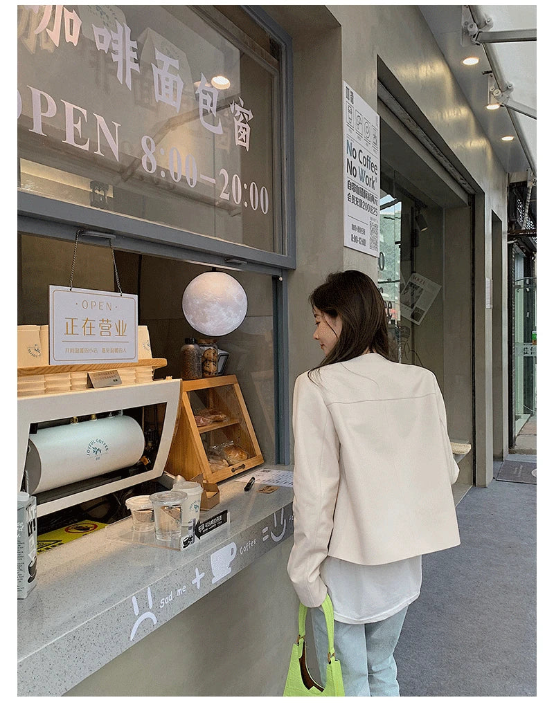Autumn Sheepskin Leather Retro Gold Button O-neck Pocket Short Jacket