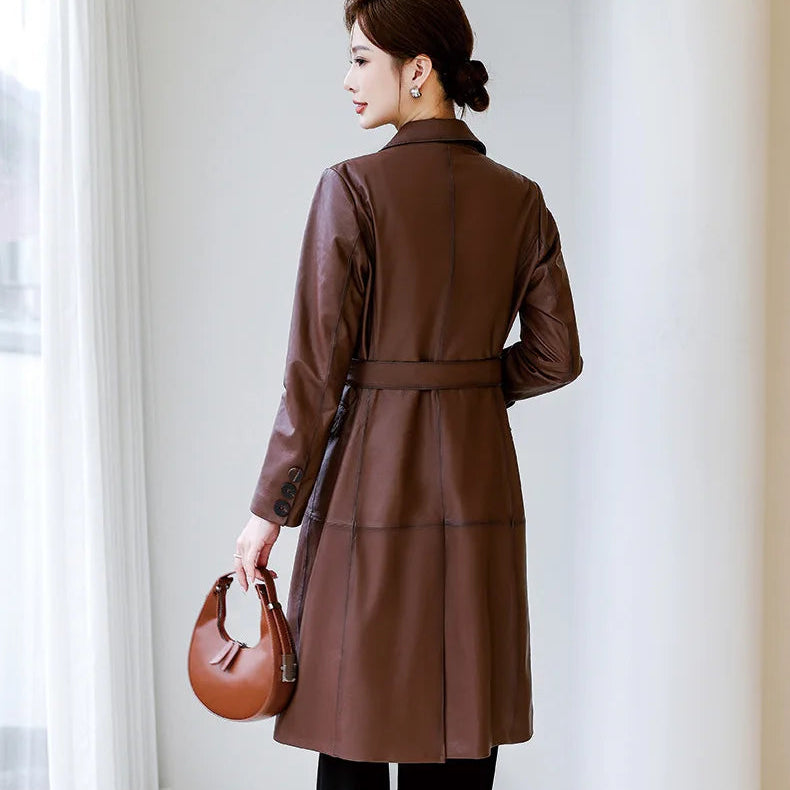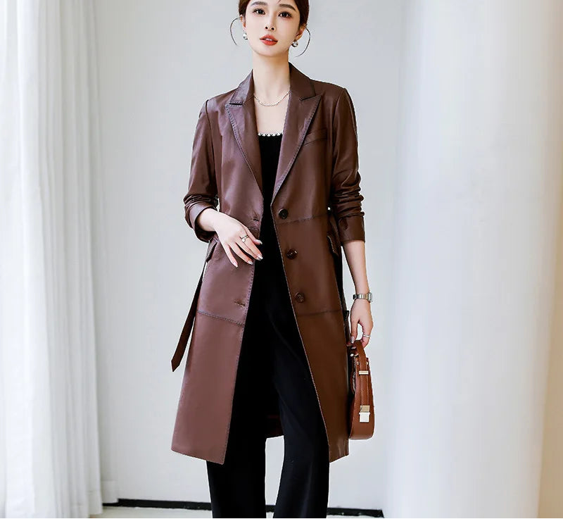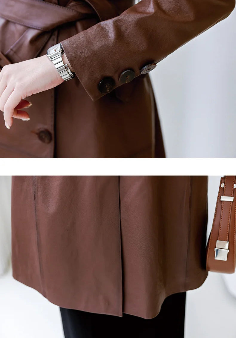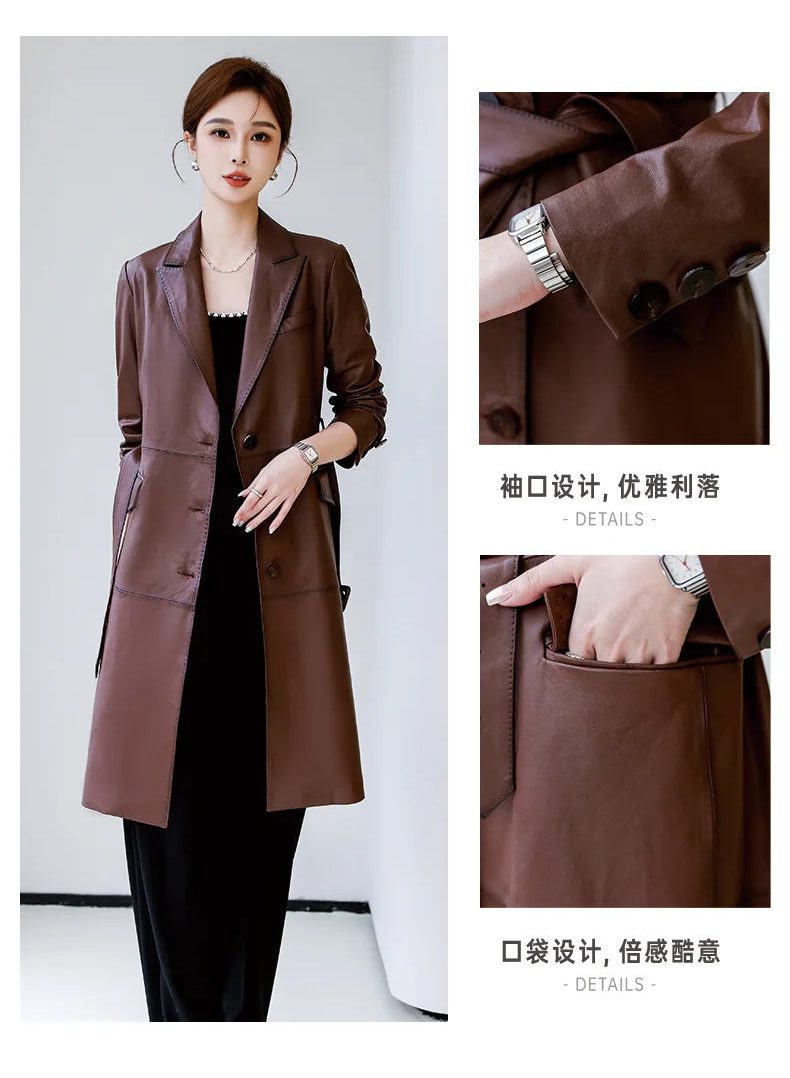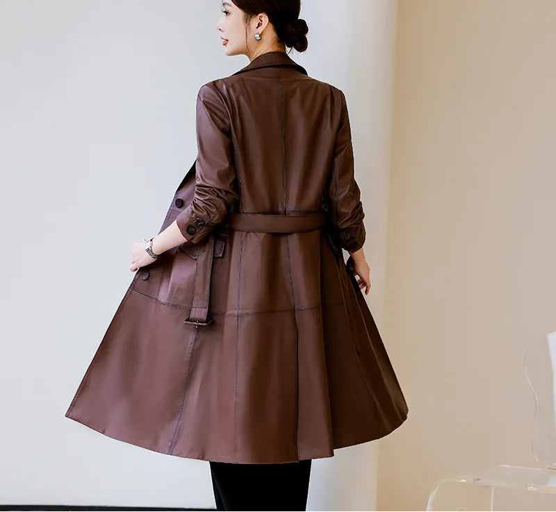 Luxury Mid-Length Genuine Sheepskin Leather Trench Coat for Women