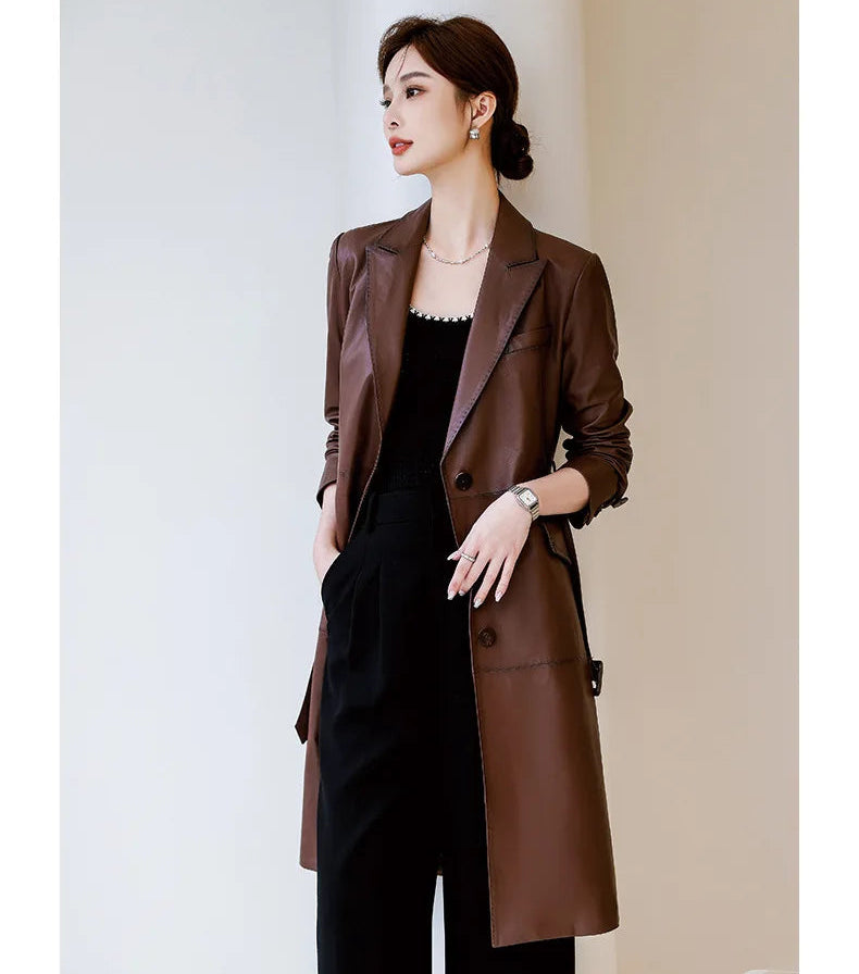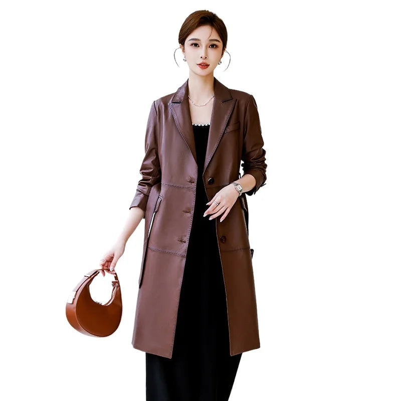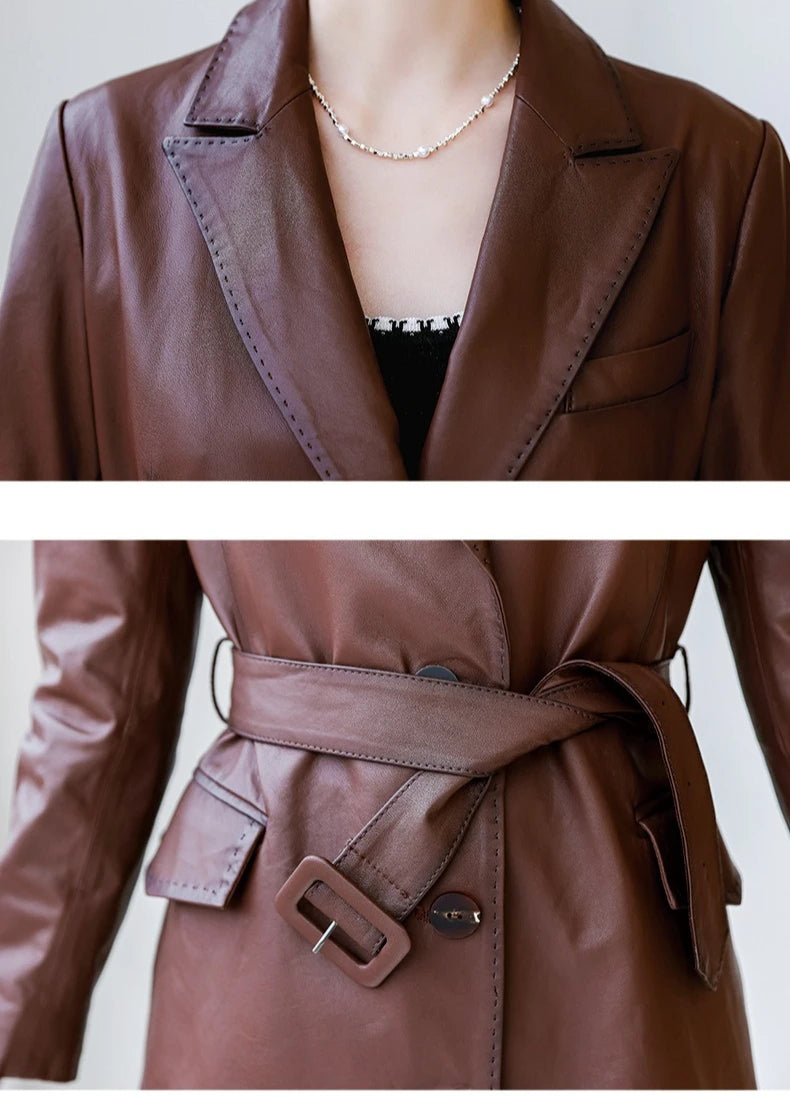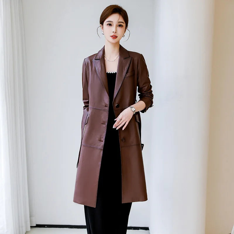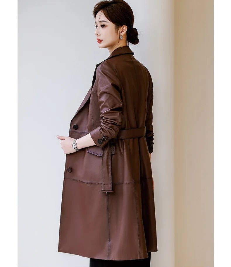Luxury Mid-Length Genuine Sheepskin Leather Trench Coat for Women