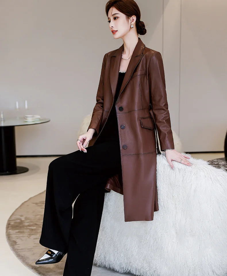 This stunning women's trench coat is a fashion statement and an epitome of comfort that keeps you cozy and stylish. Designed with genuine leather, offering both durability and style, this brown mid-length coat will add that extra style to your look. The button detailing adds elegance to the coat. Grab your now!