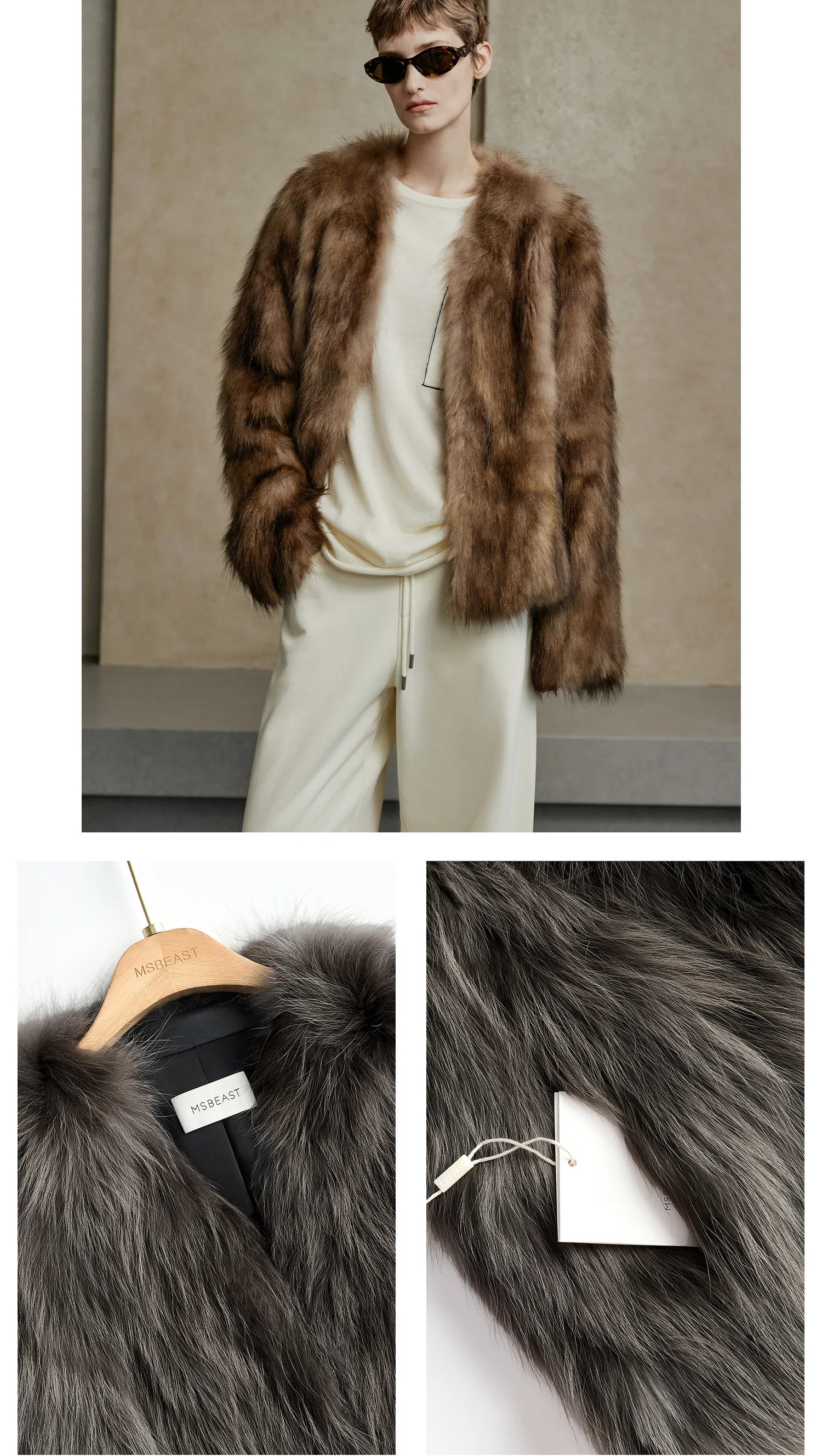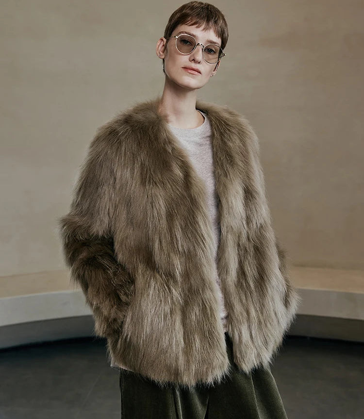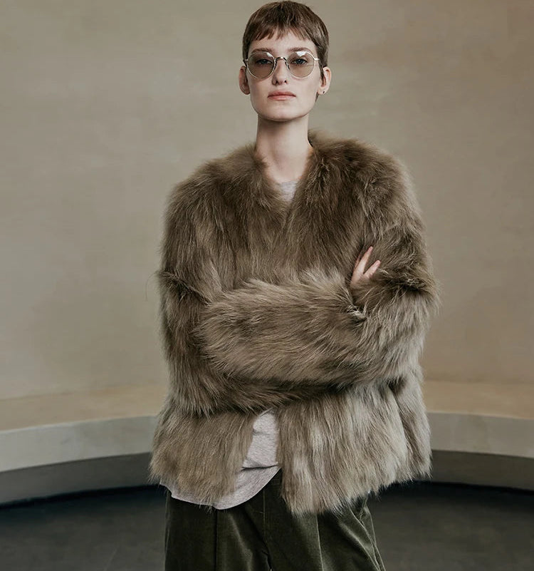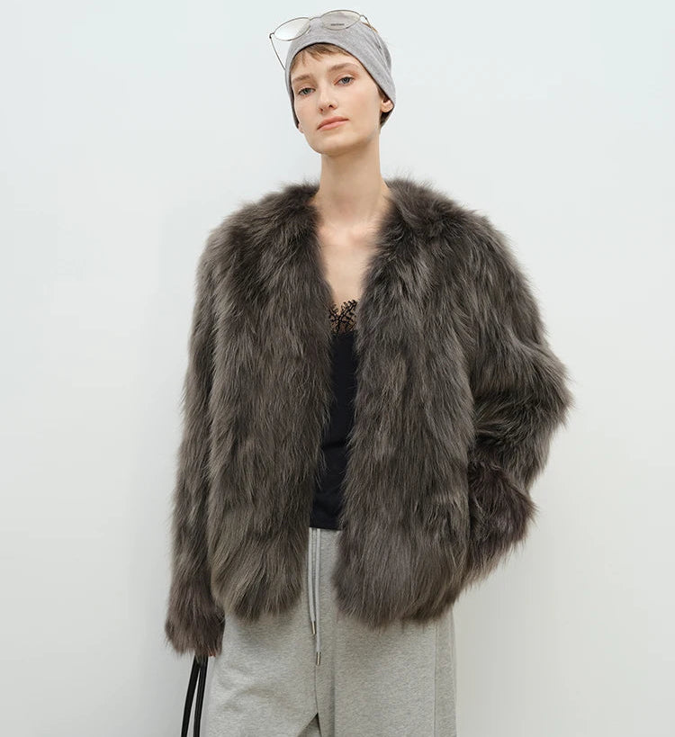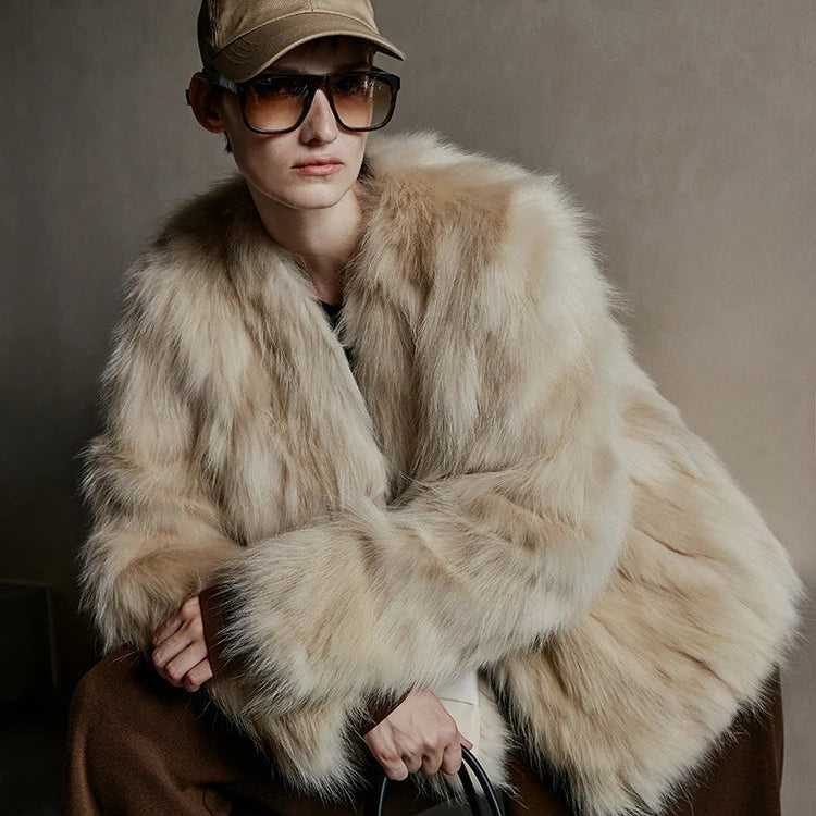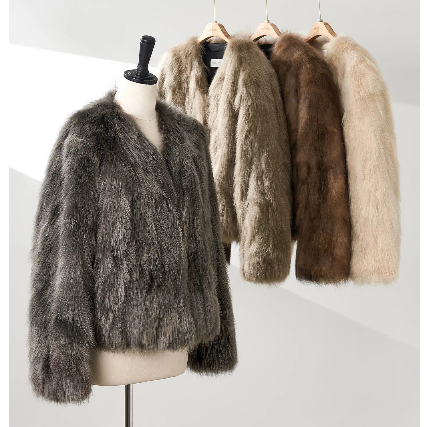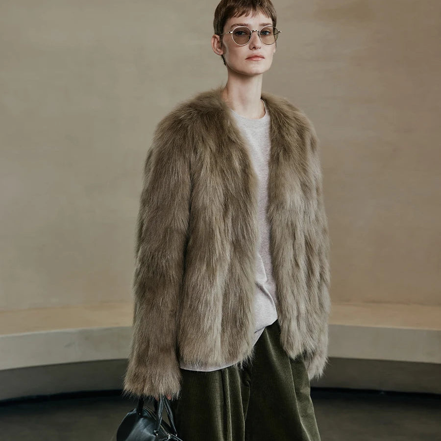 Luxury V-neck Natural Raccoon Dog Fur Winter Coat for Women