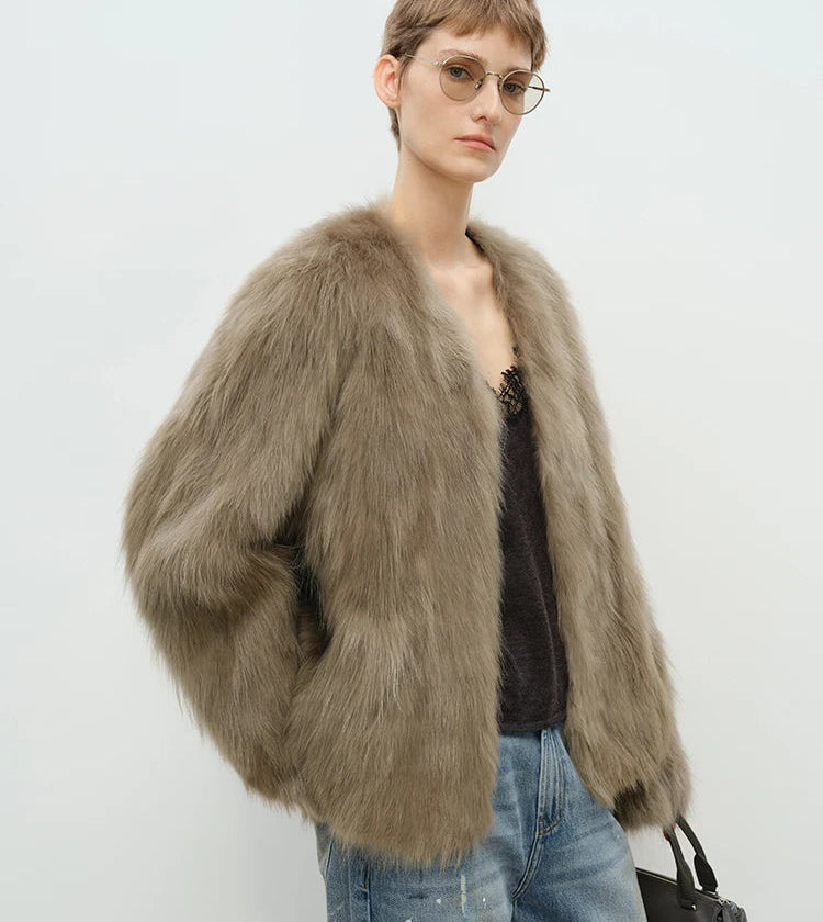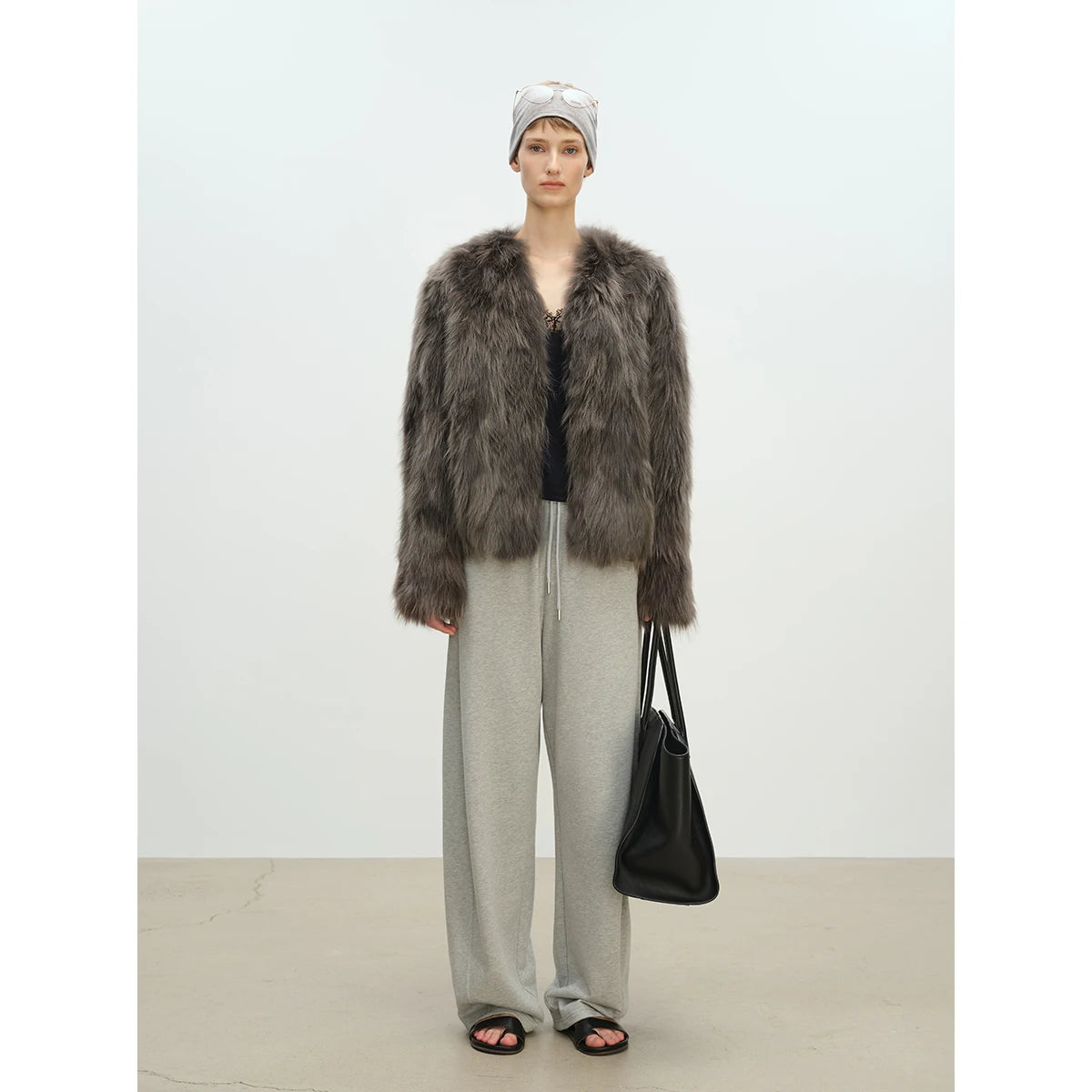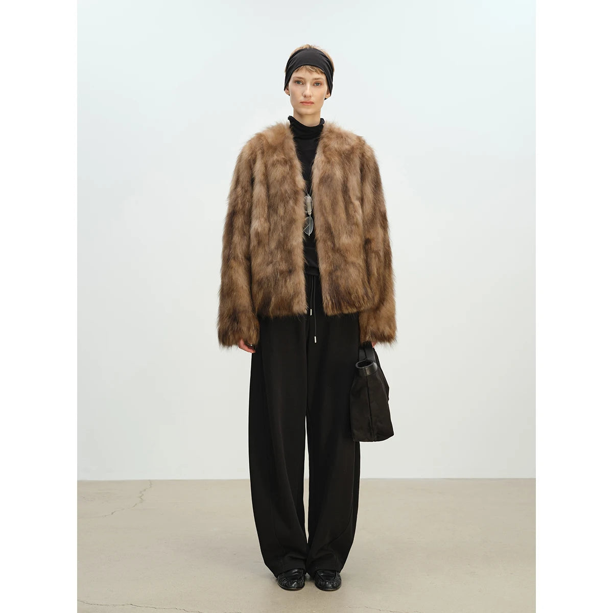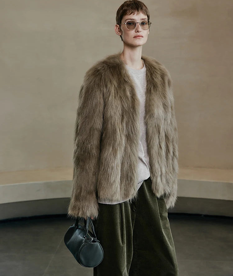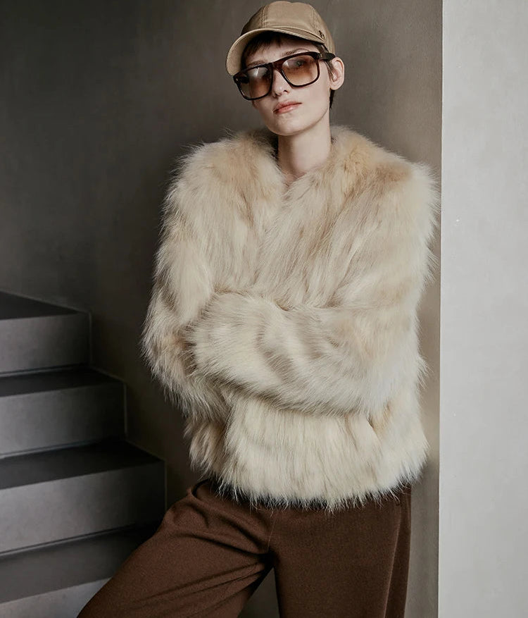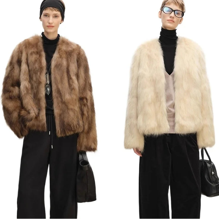 Luxury V-neck Natural Raccoon Dog Fur Winter Coat for Women