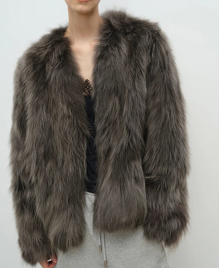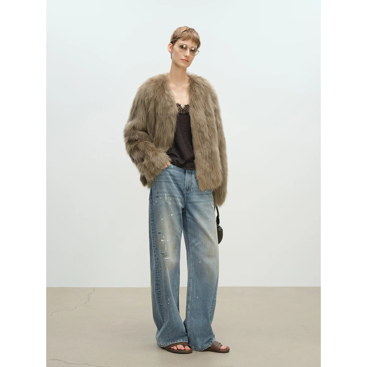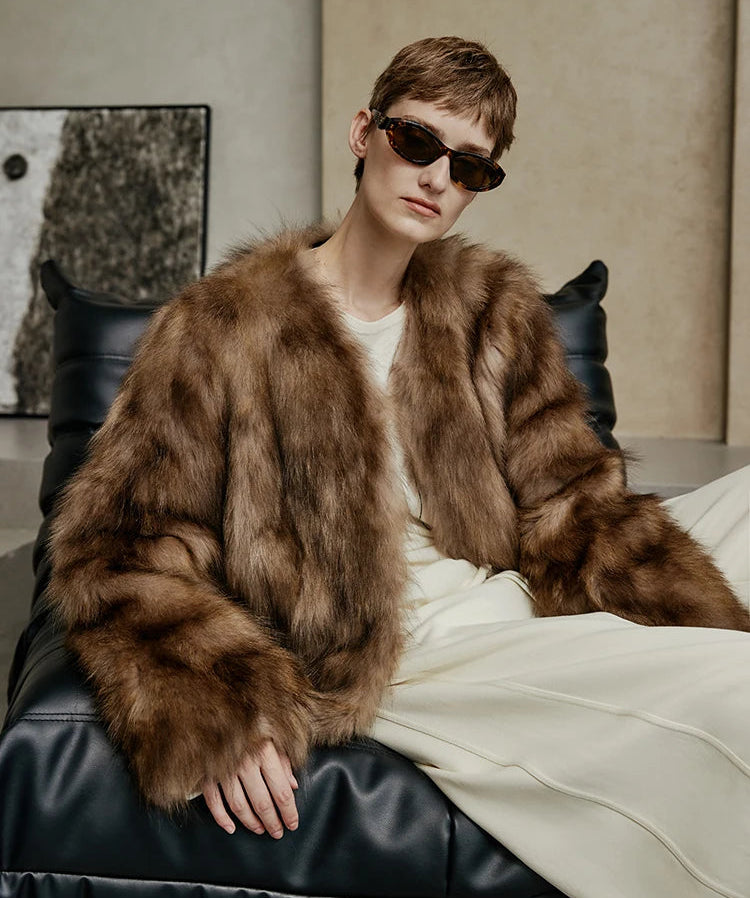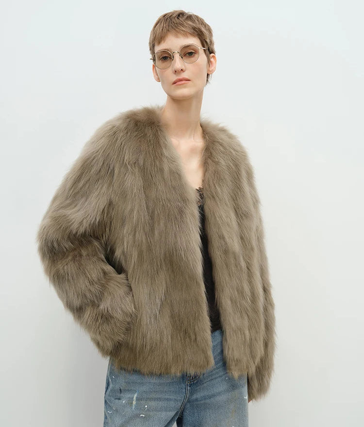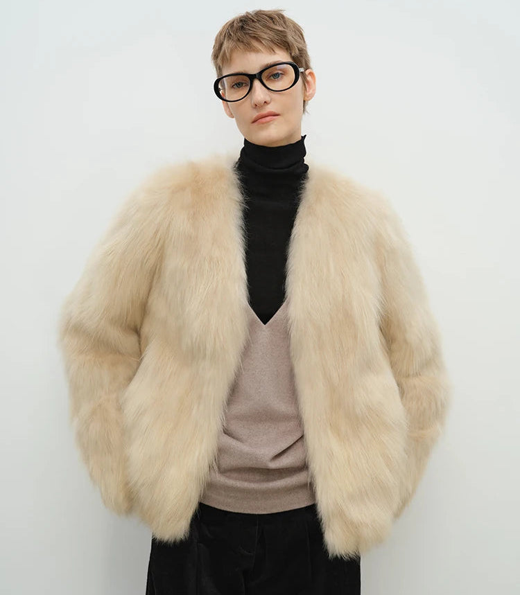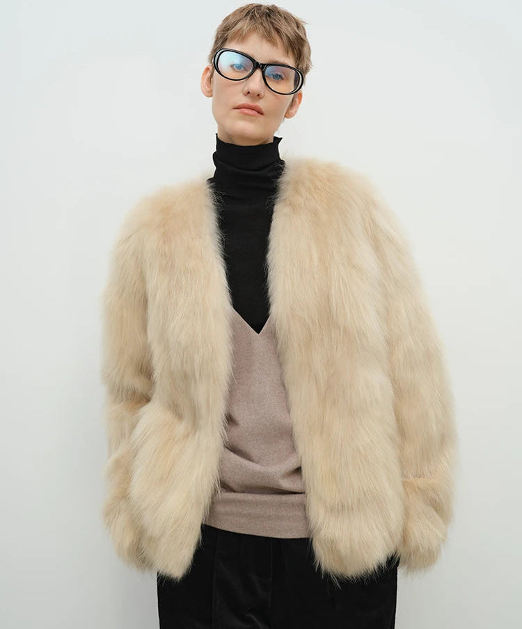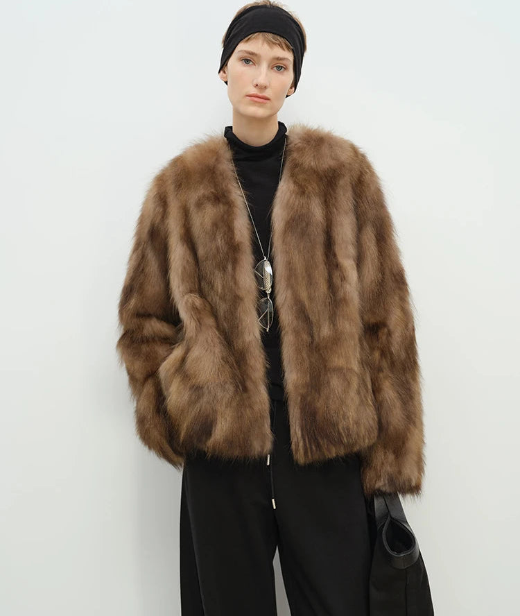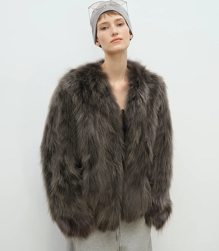 Luxury V-neck Natural Raccoon Dog Fur Winter Coat for Women