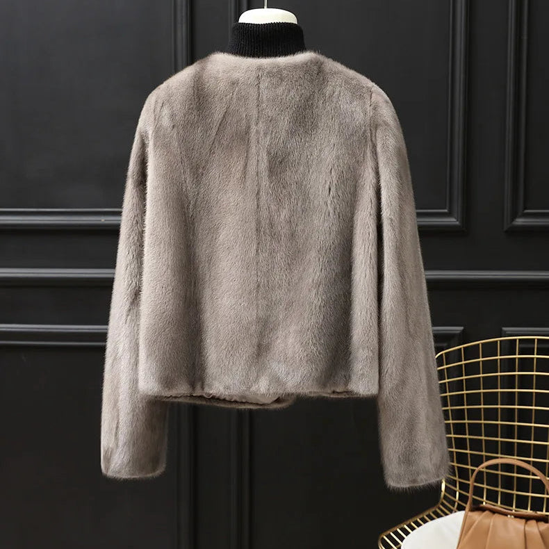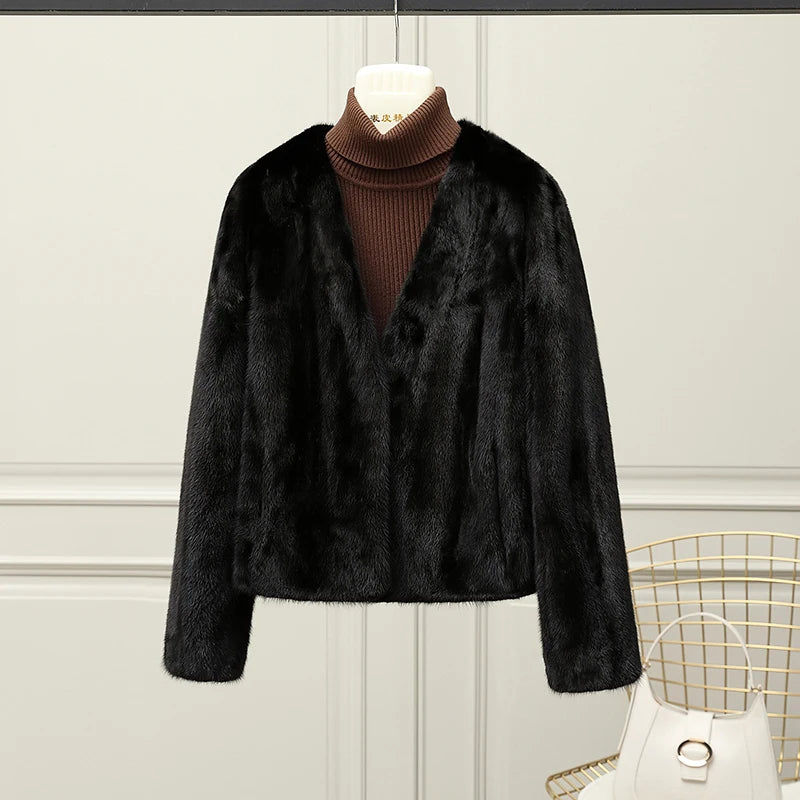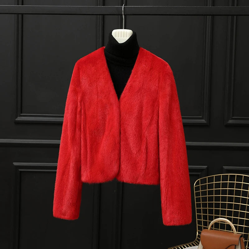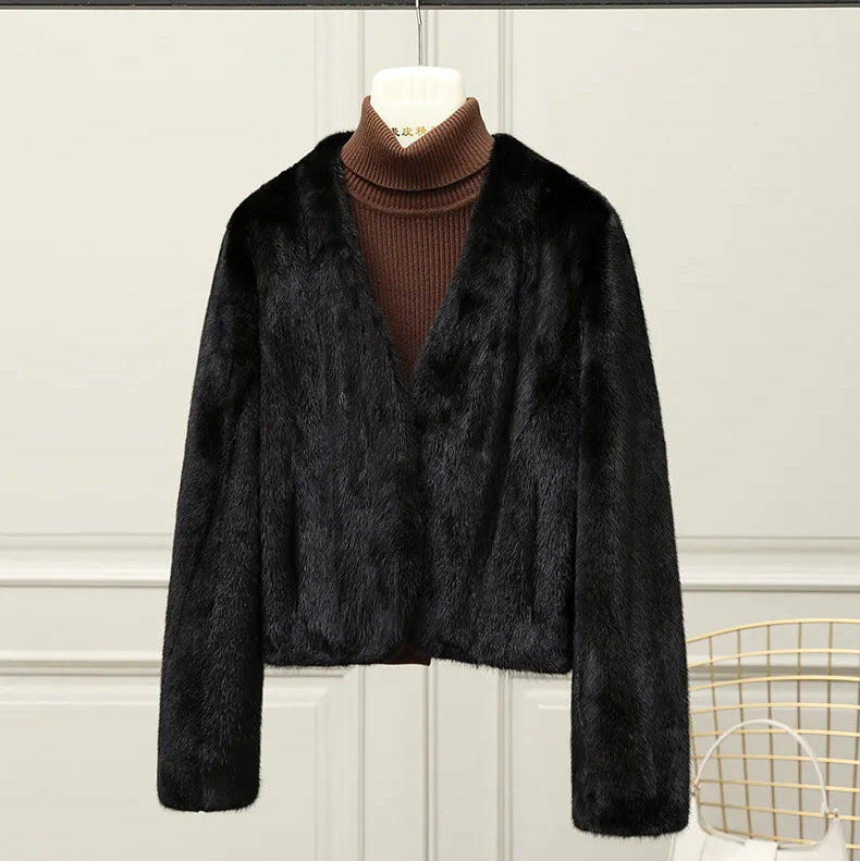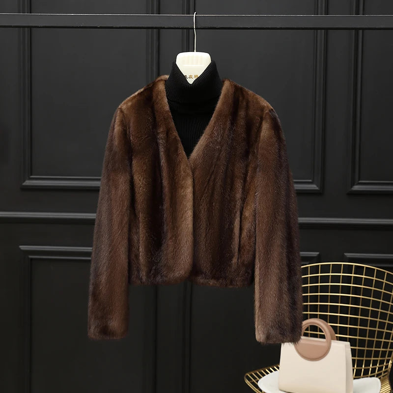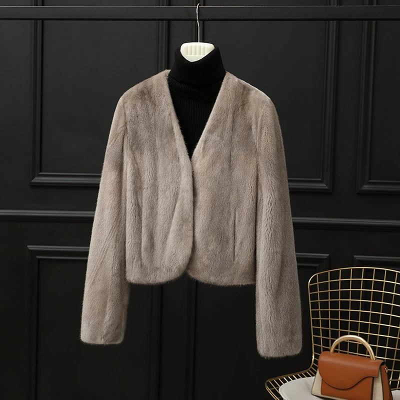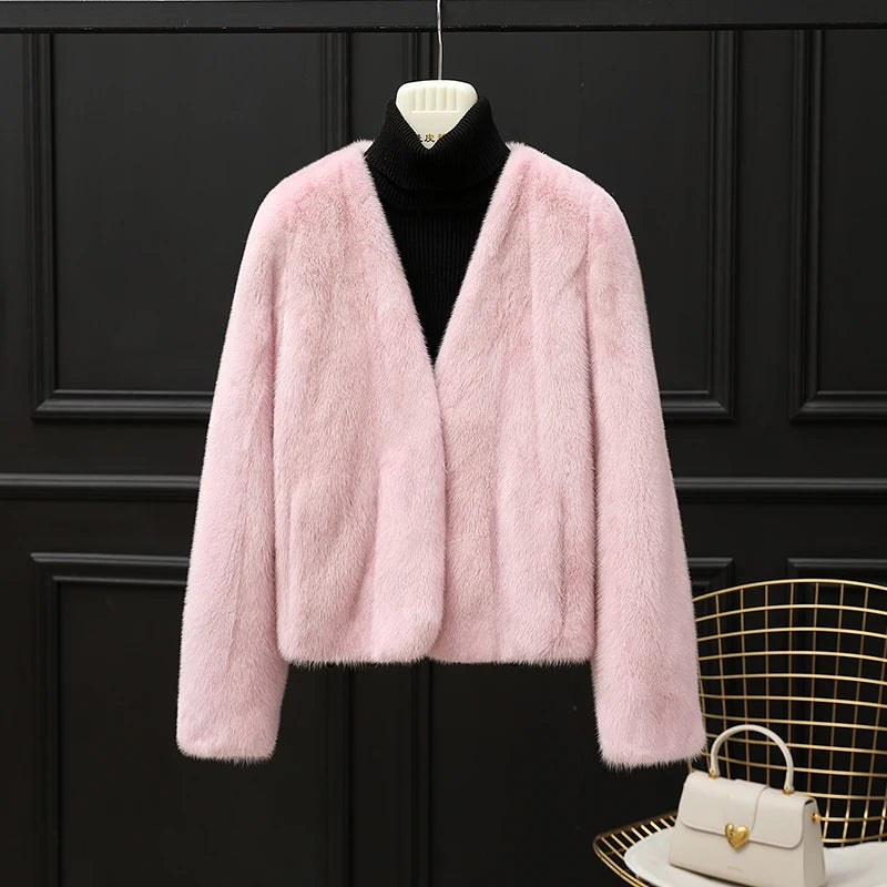 Real Whole Mink Fur Short V-neck Winter Jacket for Women