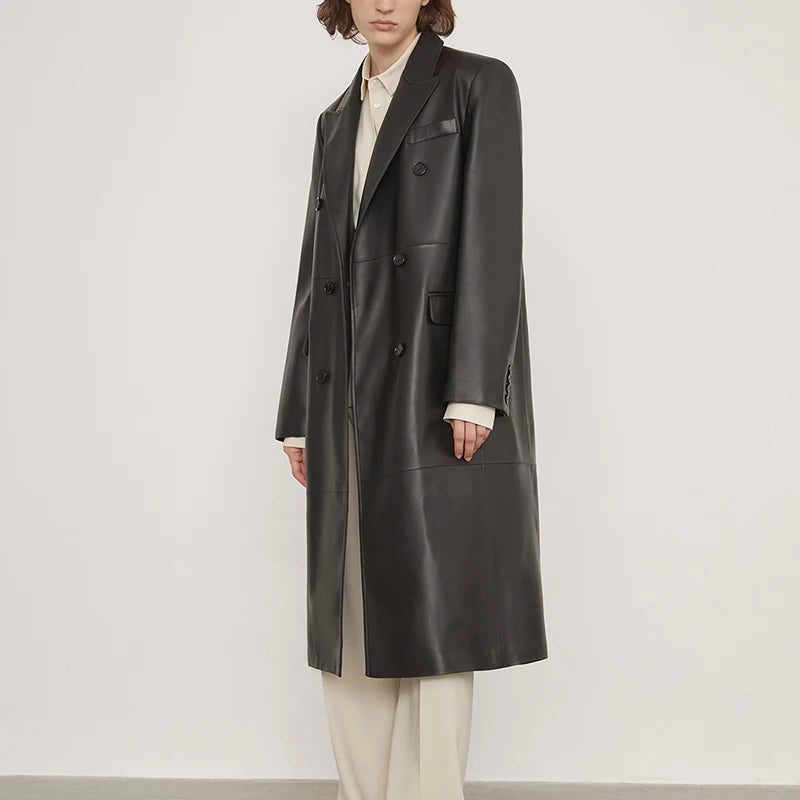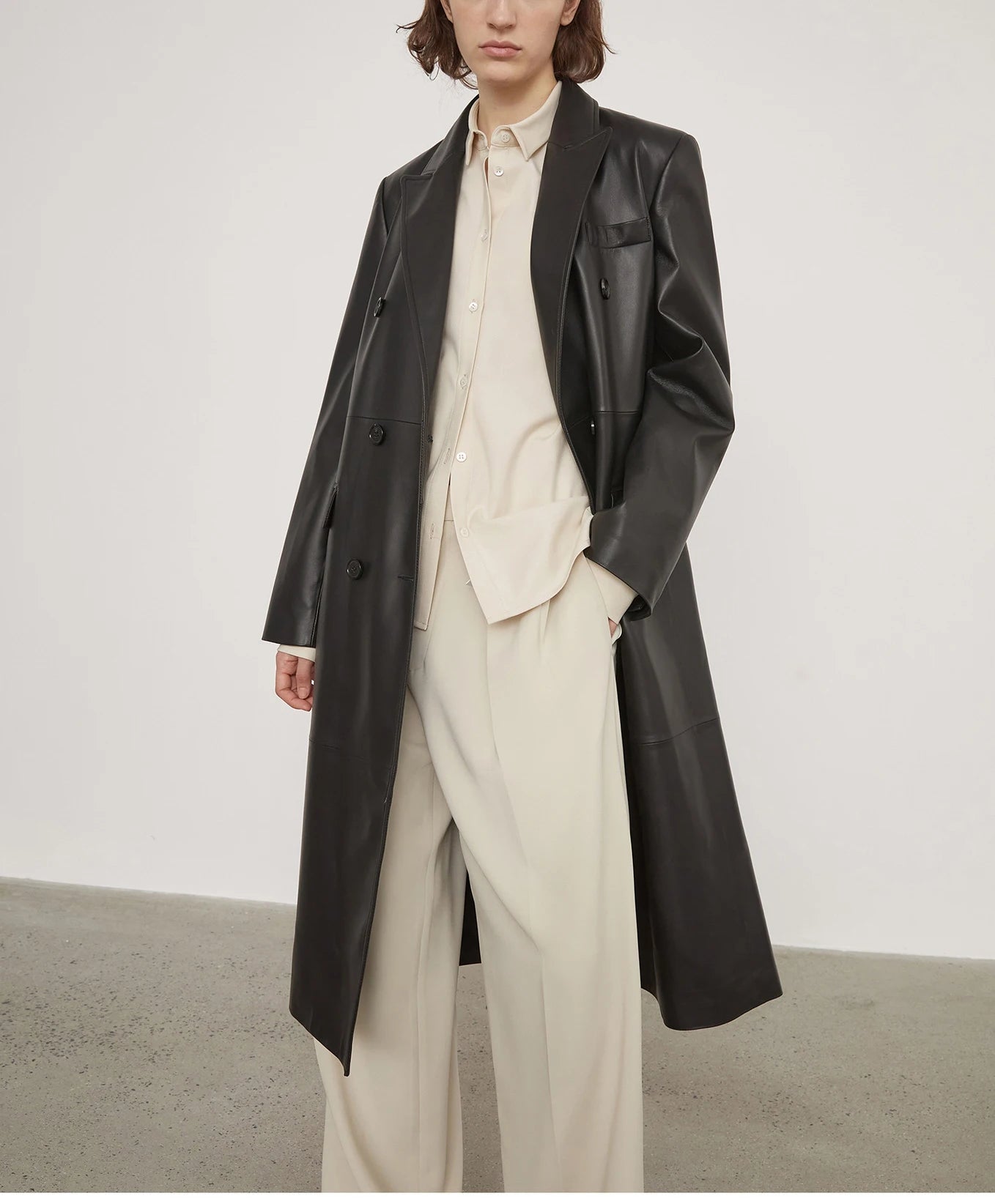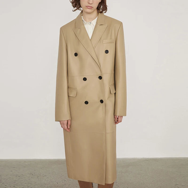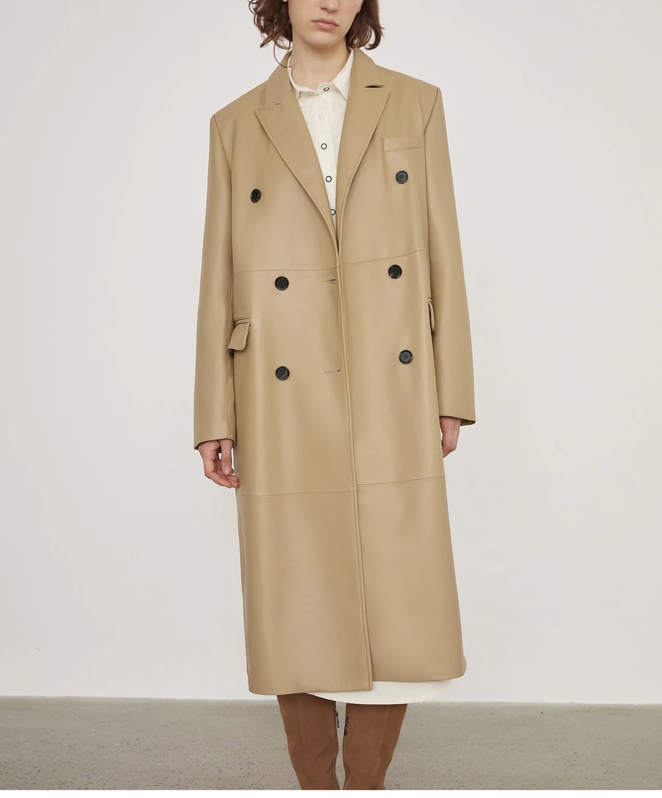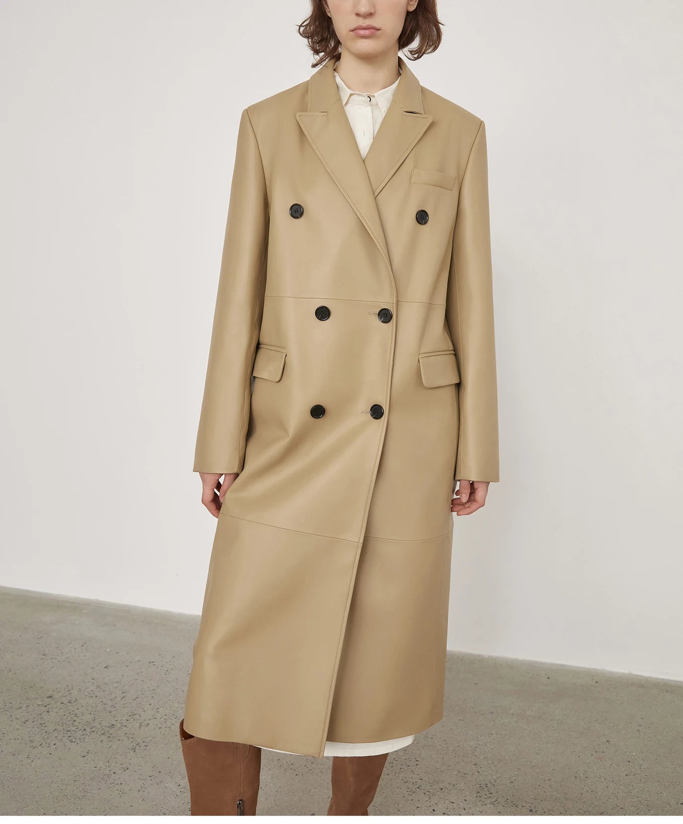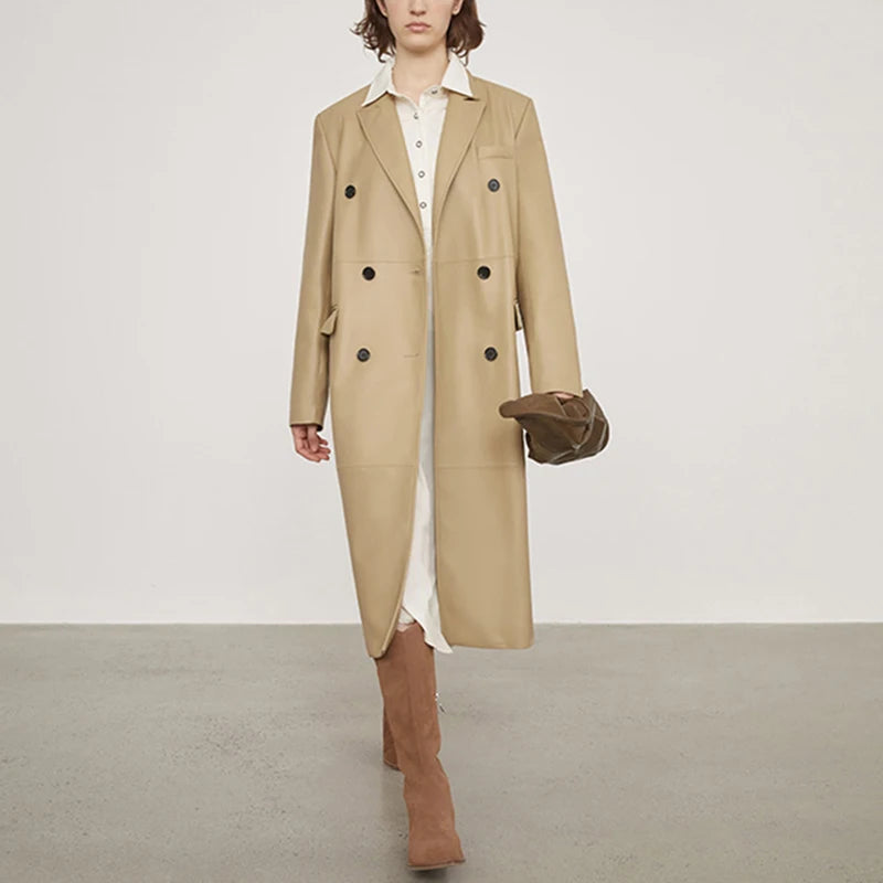 Sheepskin Peak Lapel Double Breasted Long Trench Coat for Women
