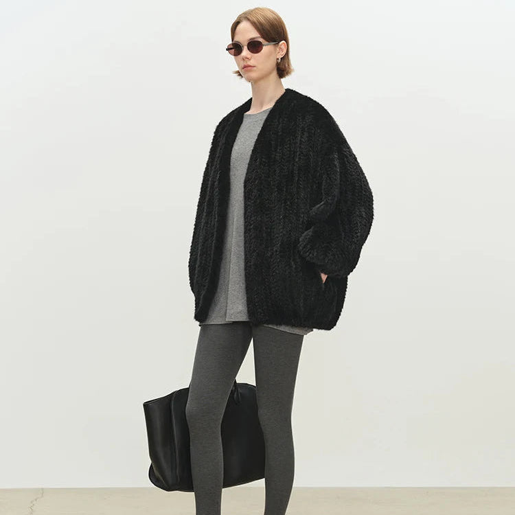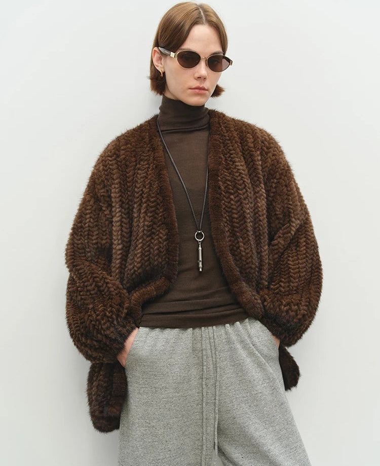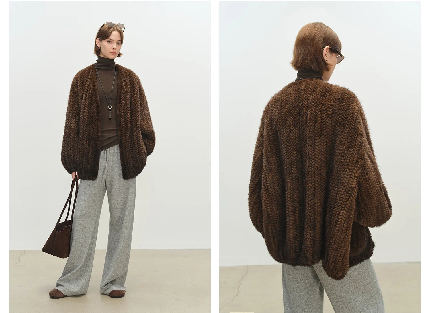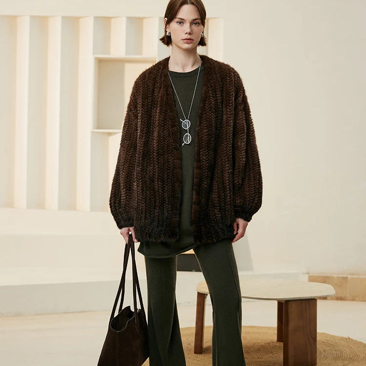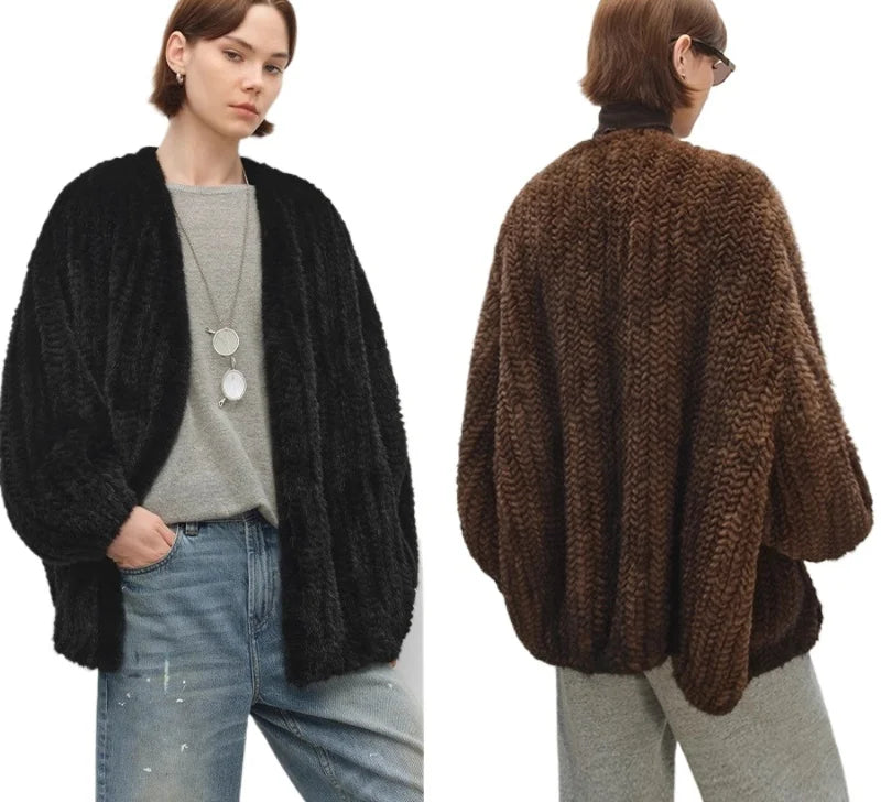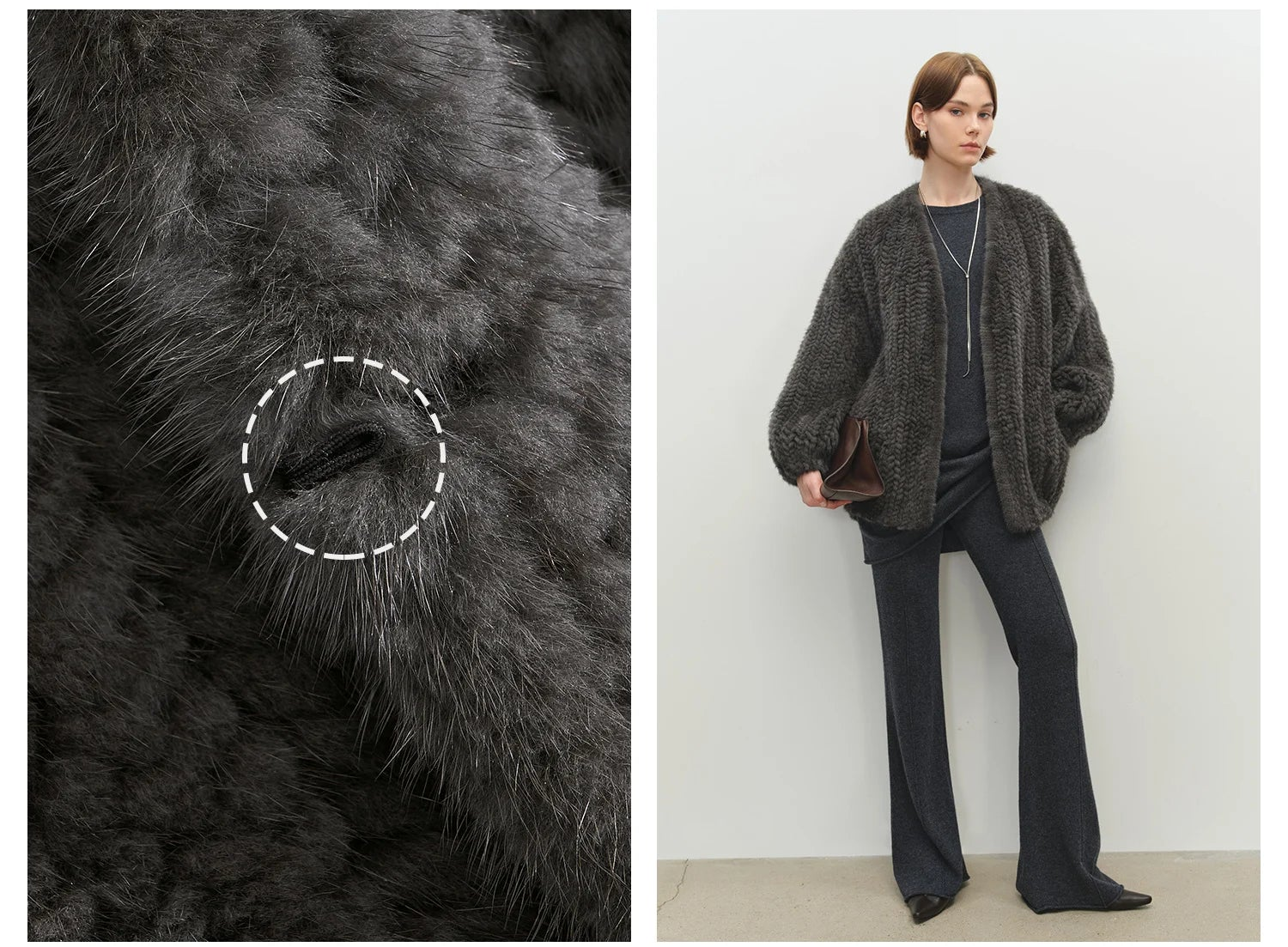 Women's Double-Sided Weaving Real Mink Fur Lantern Sleeves Winter Coat