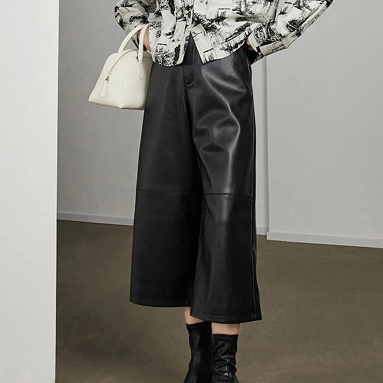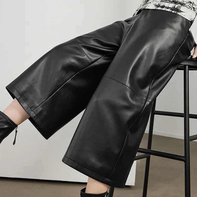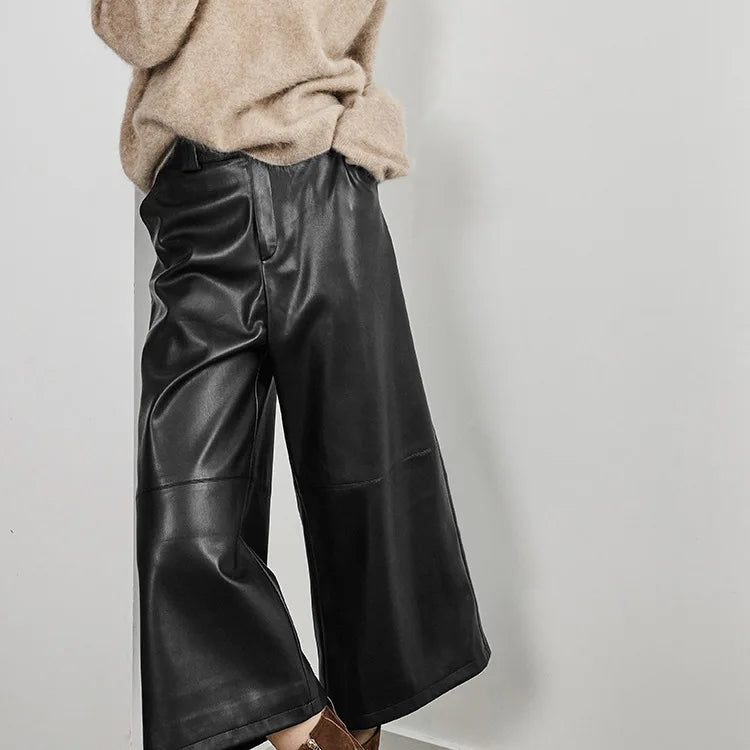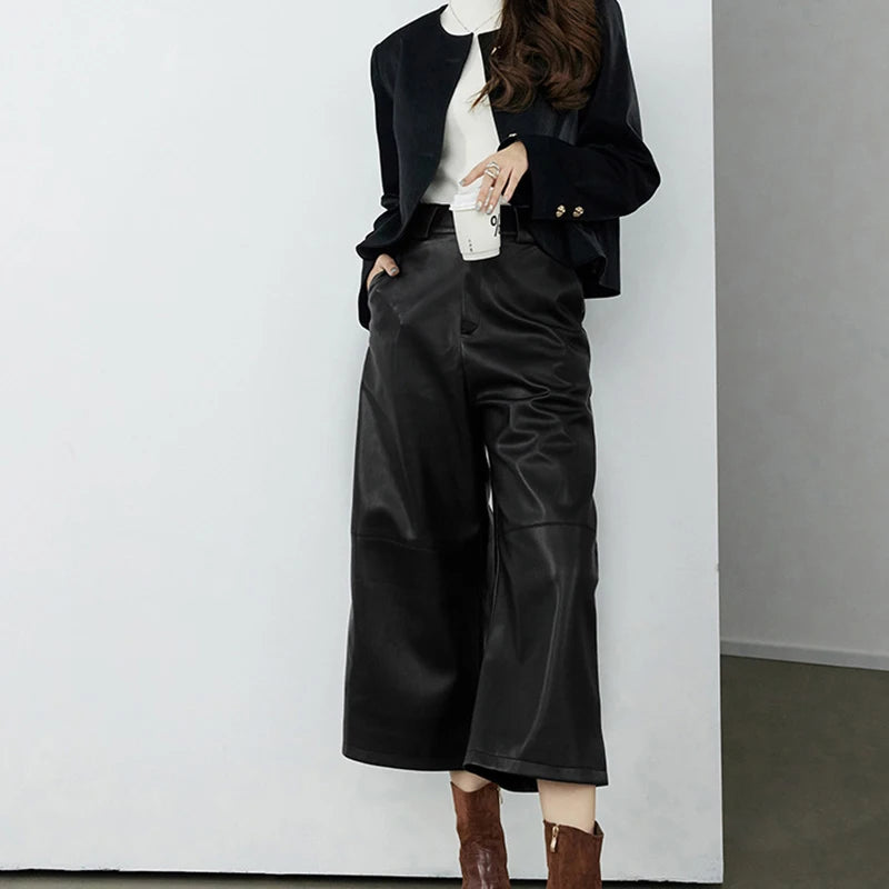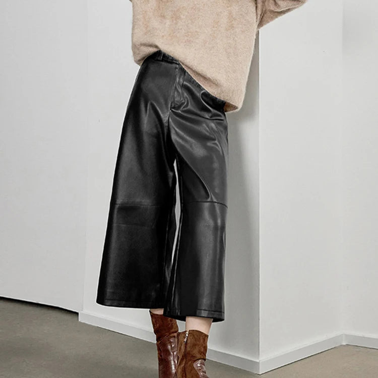 Versatile Loose Wide Leg Pantalon Leather Cropped Pants for Women