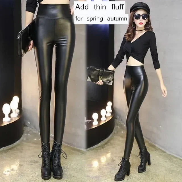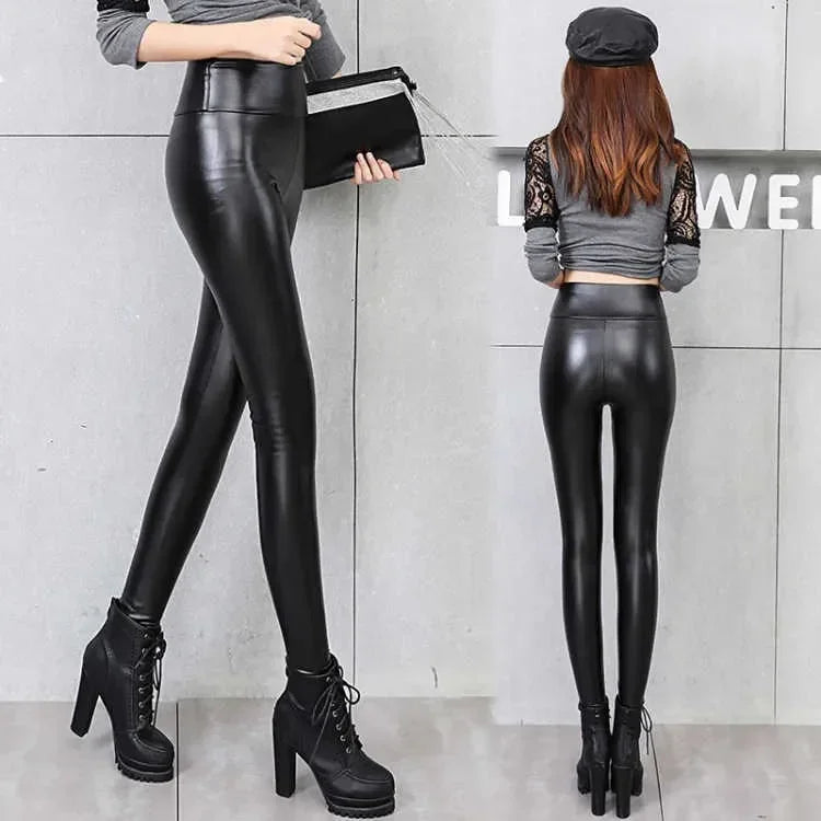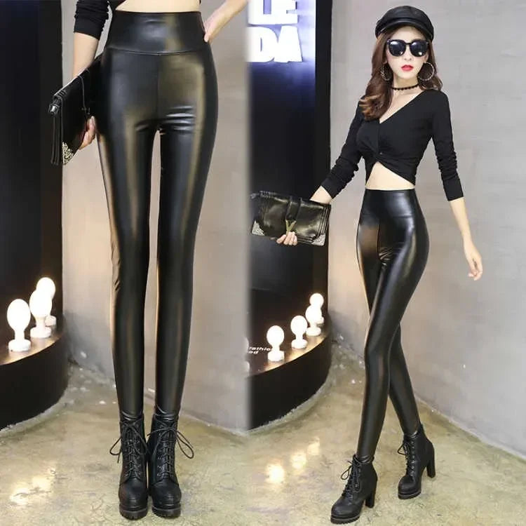 Women's Winter Streetwear Sheepskin Leather High Waist Slim Pants