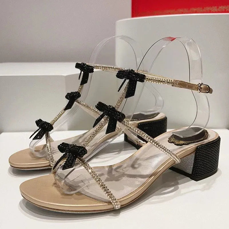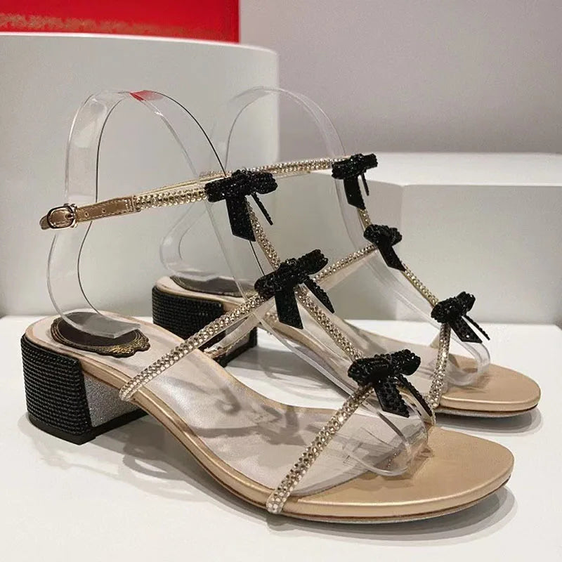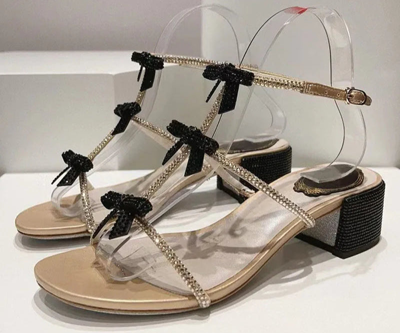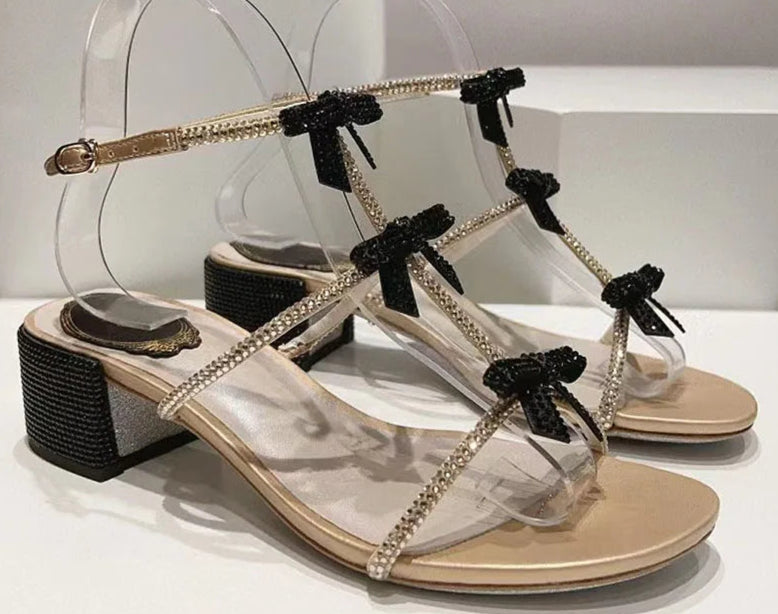 Black Gold Chunky Square Heels Rhinestone Ankle Buckle Strap Sandals for Women