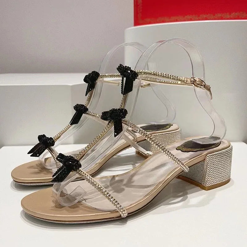 Black Satin Leather Chunky Heels Rhinestone Ankle Buckle Strap Sandals for Women