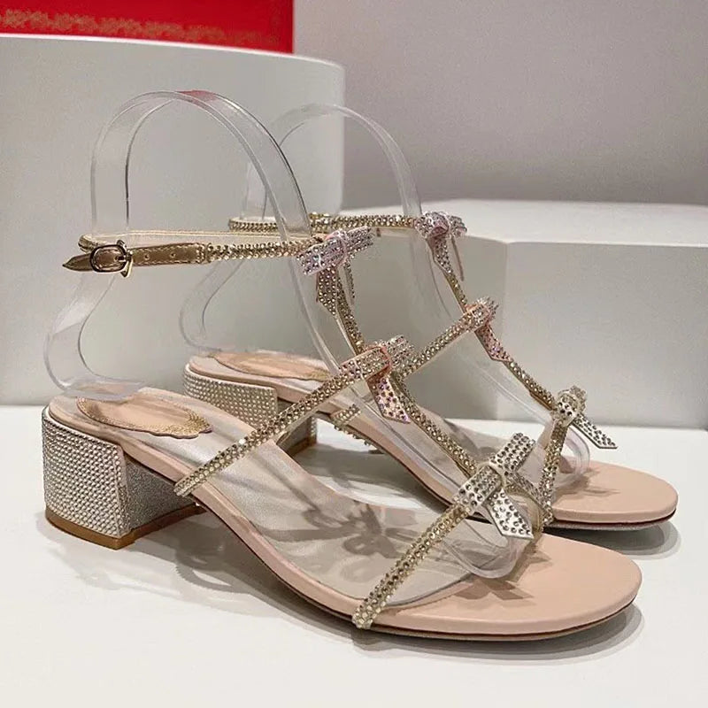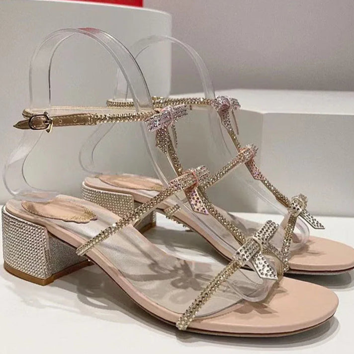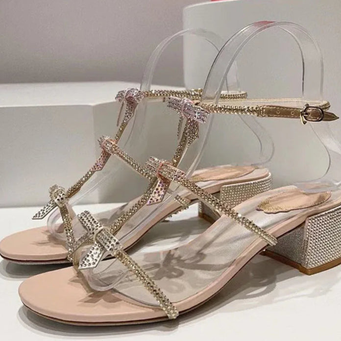Gold Chunky Square Heels Rhinestone Ankle Buckle Strap Sandals for Women
