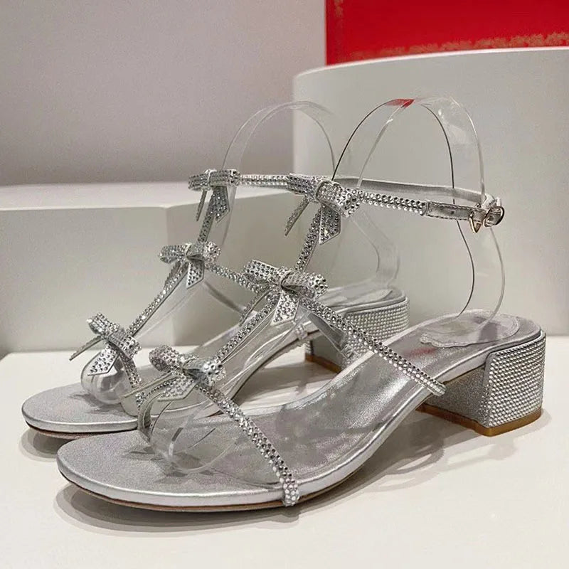 Silver Chunky Square Heels Rhinestone Ankle Buckle Strap Sandals for Women
