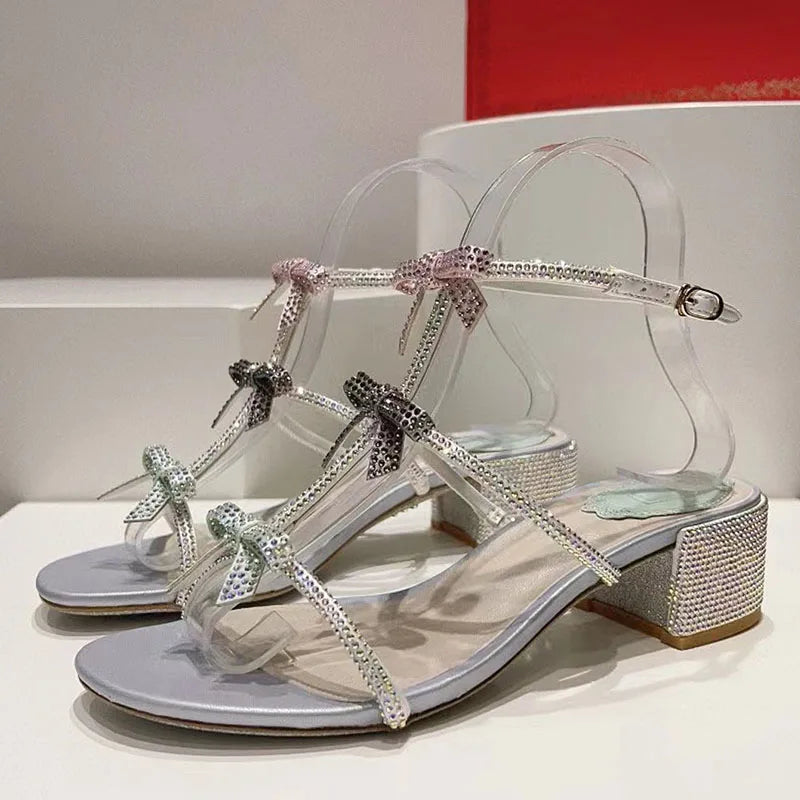 Silver Gray Chunky Square Heels Rhinestone Ankle Buckle Strap Sandals for Women