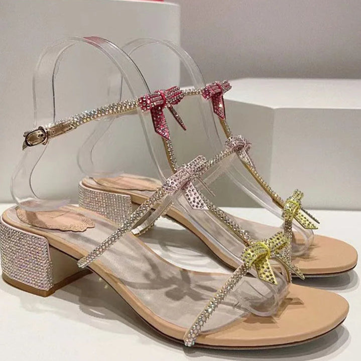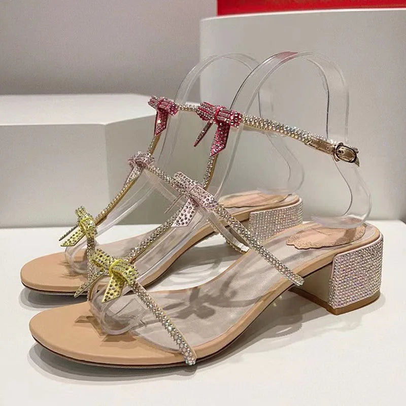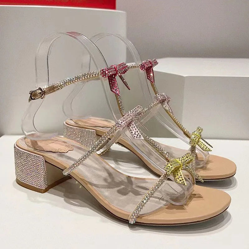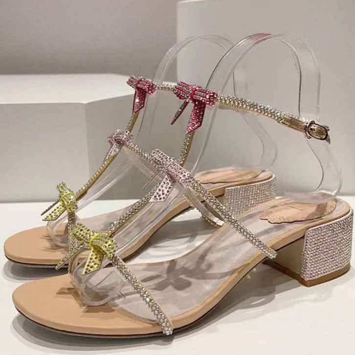 Silver Pink Chunky Square Heels Rhinestone Ankle Buckle Strap Sandals for Women
