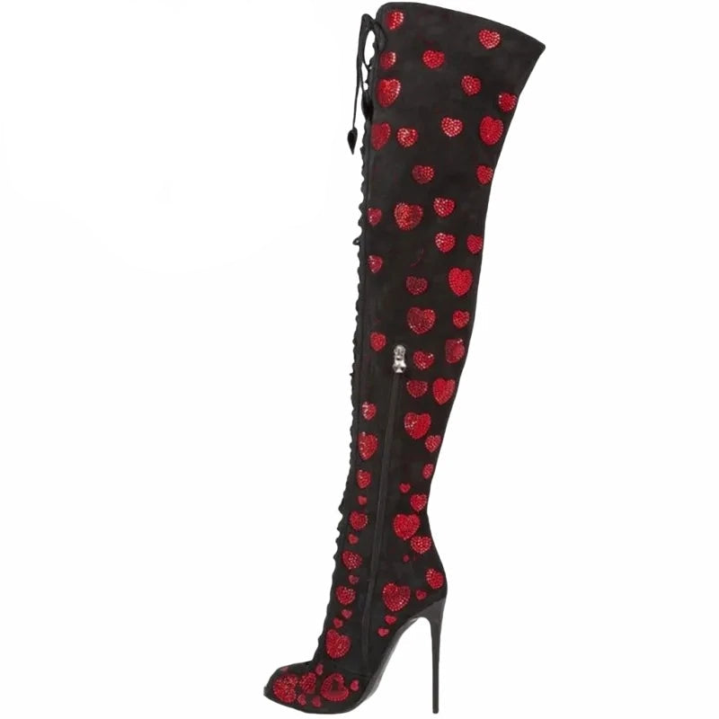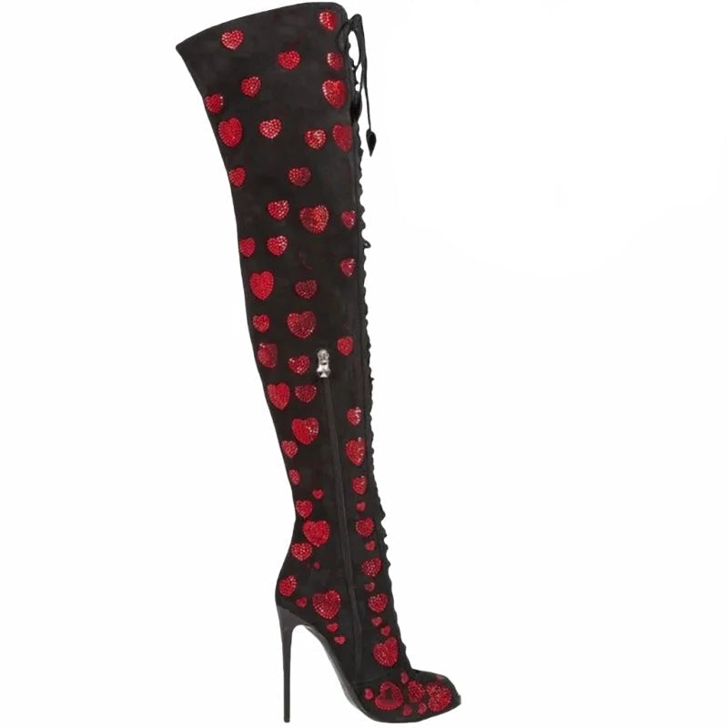 Women's Sexy Crystal Hearts Peep Toe Cross Lace Up Thigh High Boots