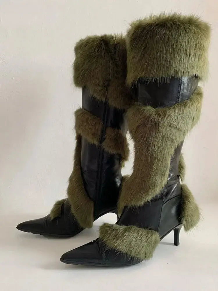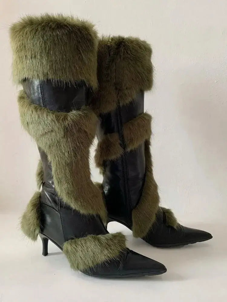 Women's Synthetic Leather Faux Fur Patchwork Pointed Toe Side Zipper Knee-high Boots