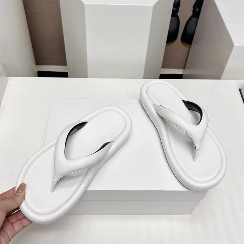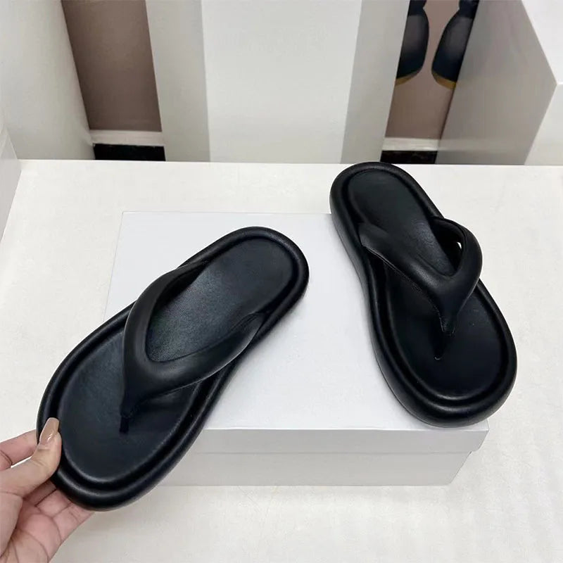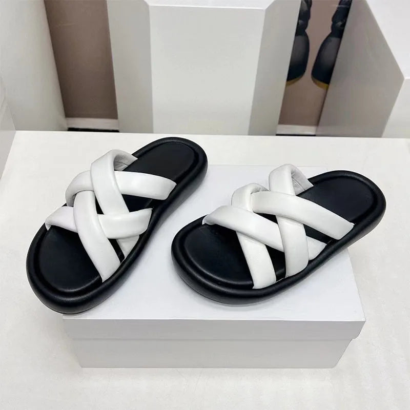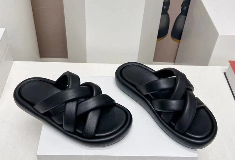 Genuine Leather Cross Strap Thick Flat Sole Flip Flop Slippers for Women