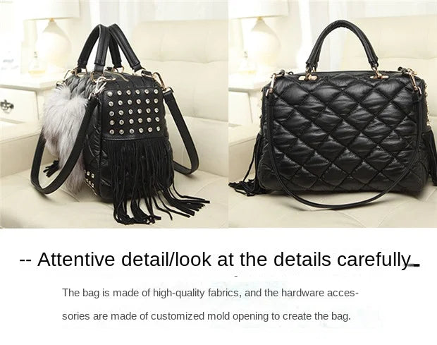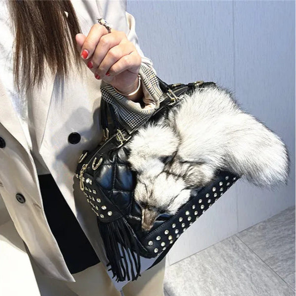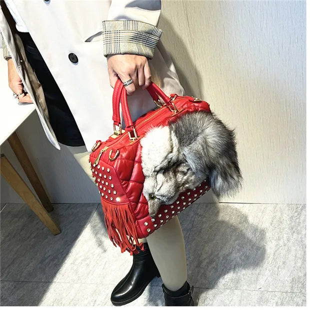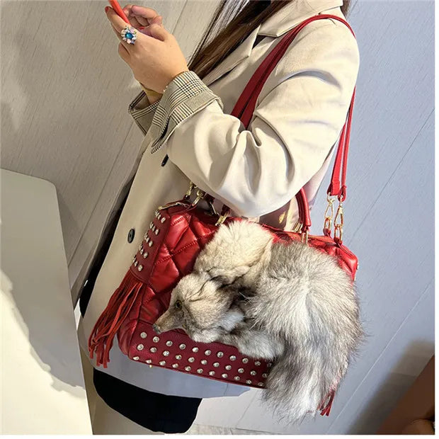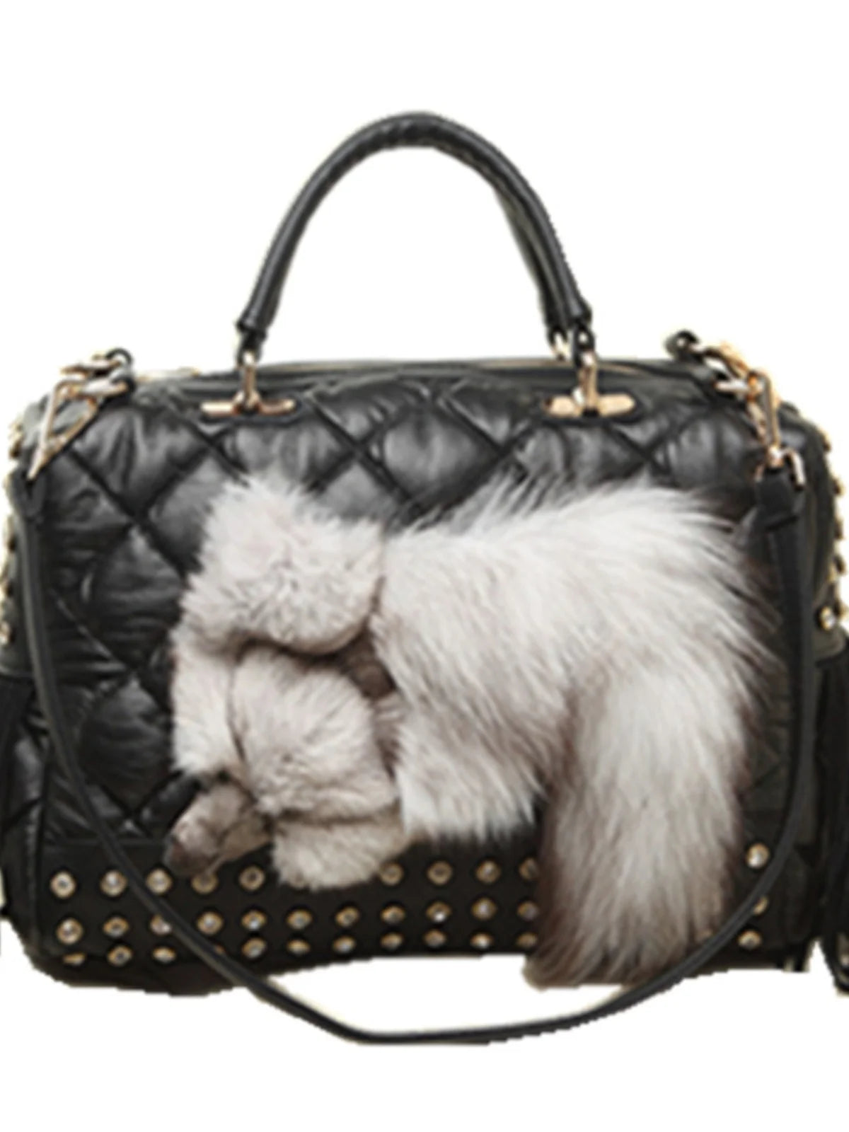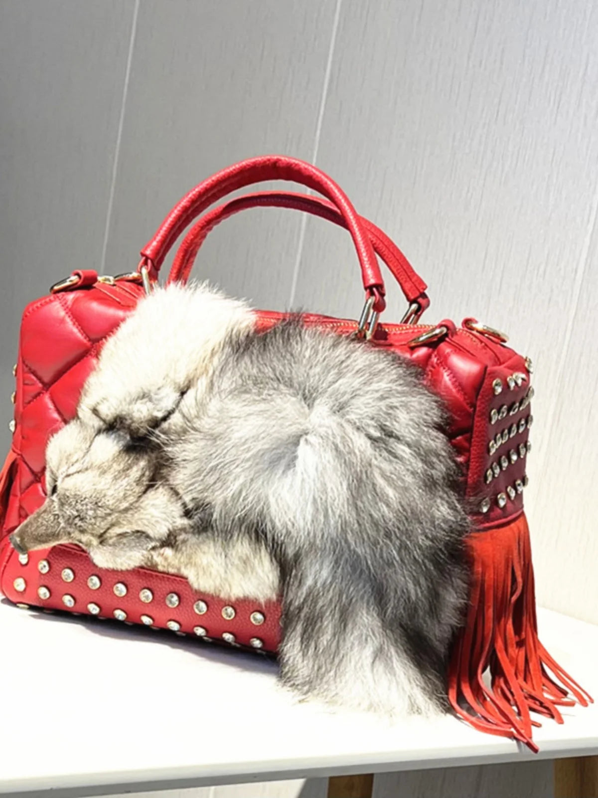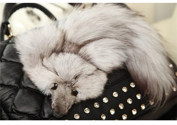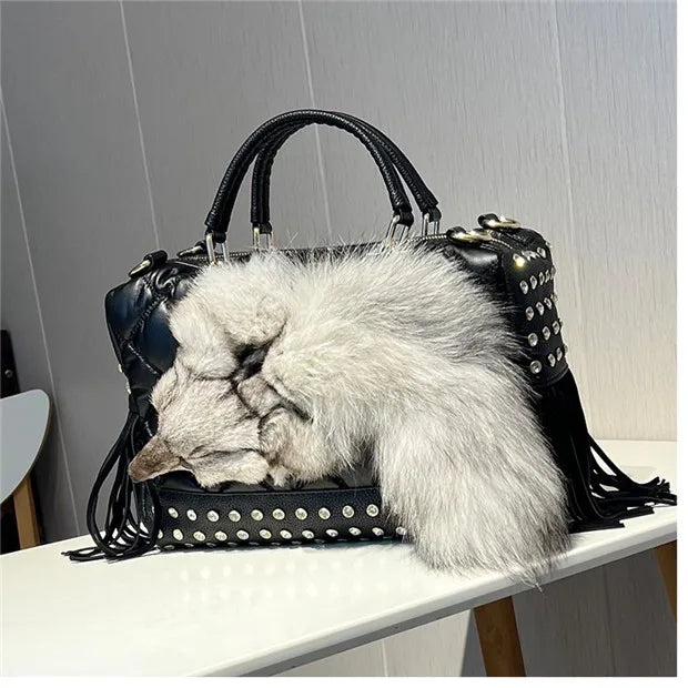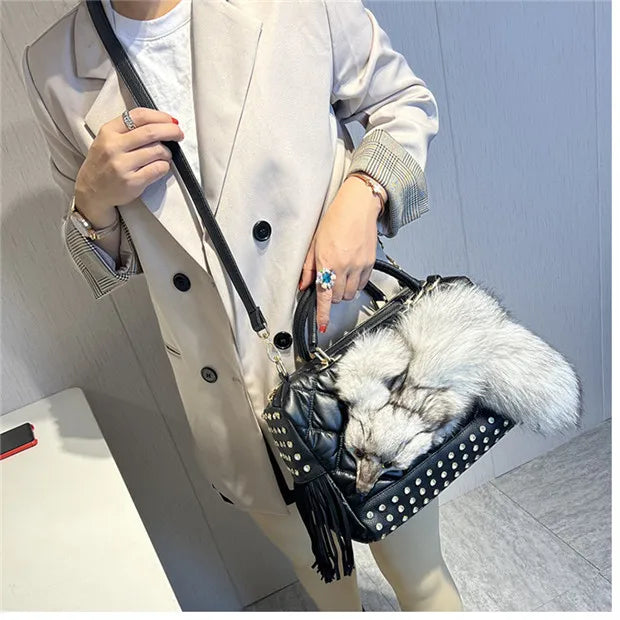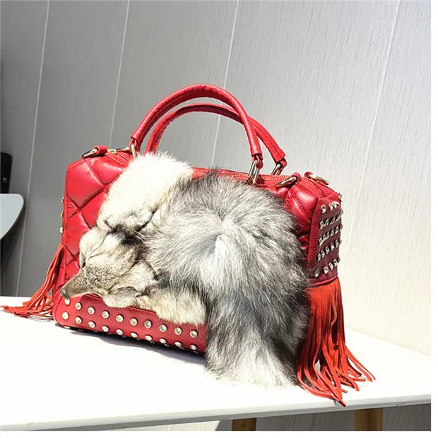 Women's Casual Fashion Soft Leather Fox Hair Fringe Diamond Handbag
