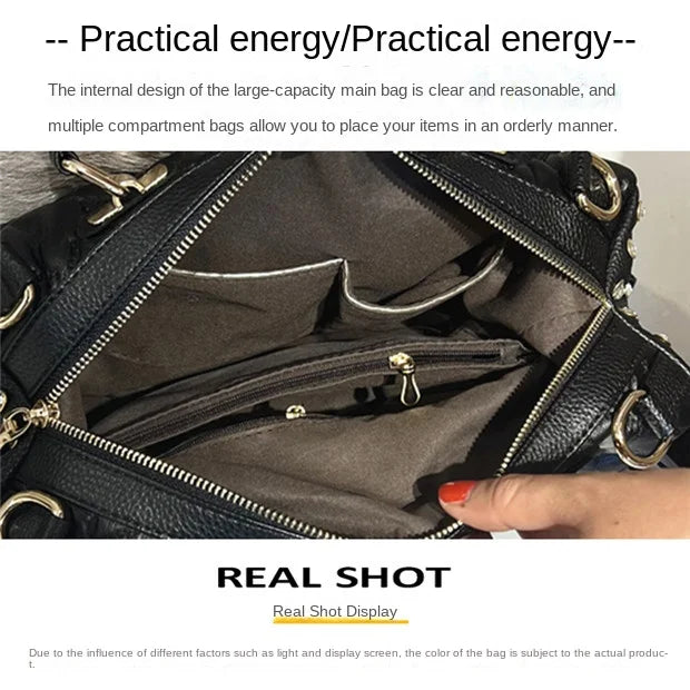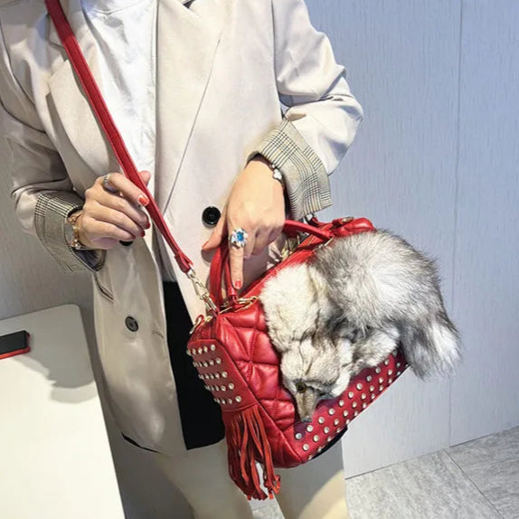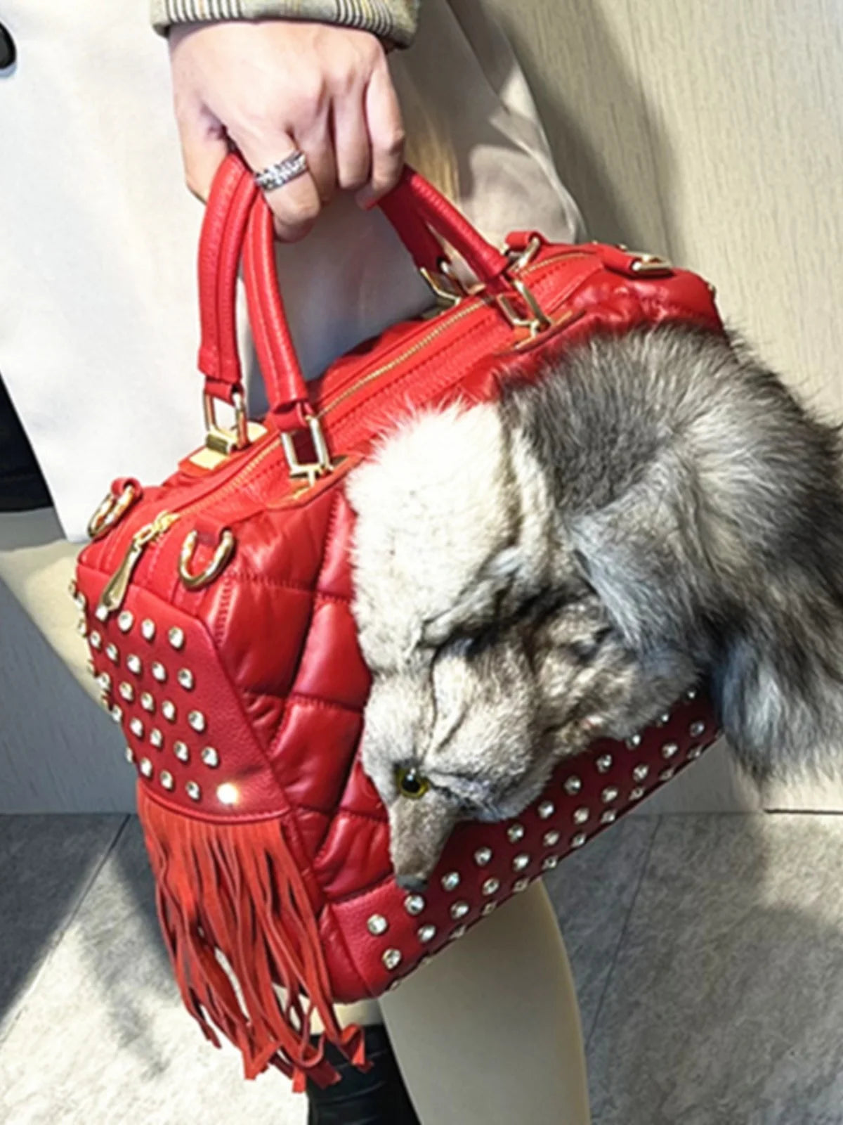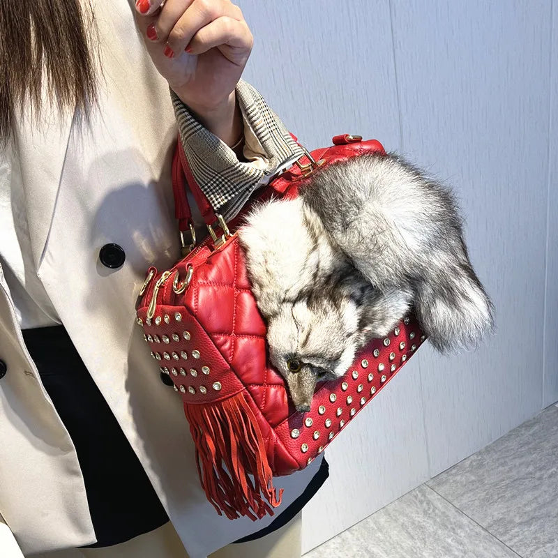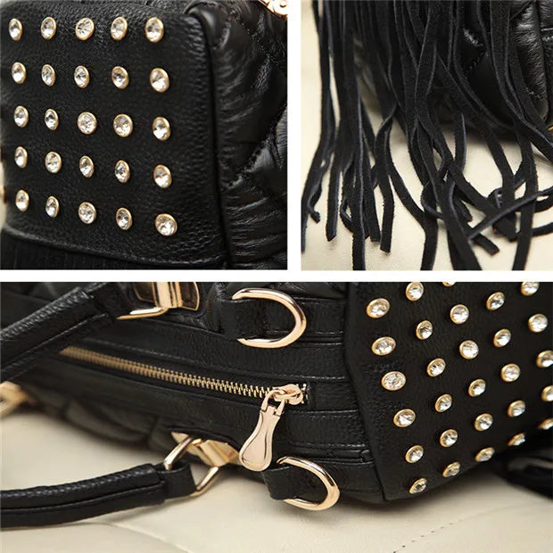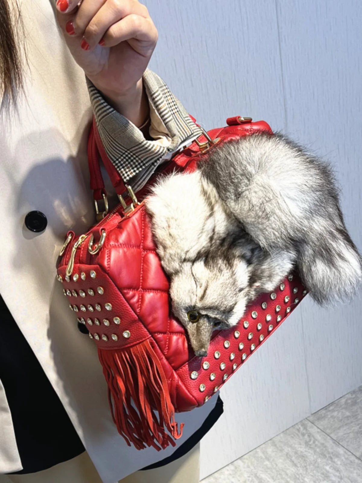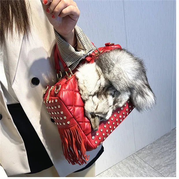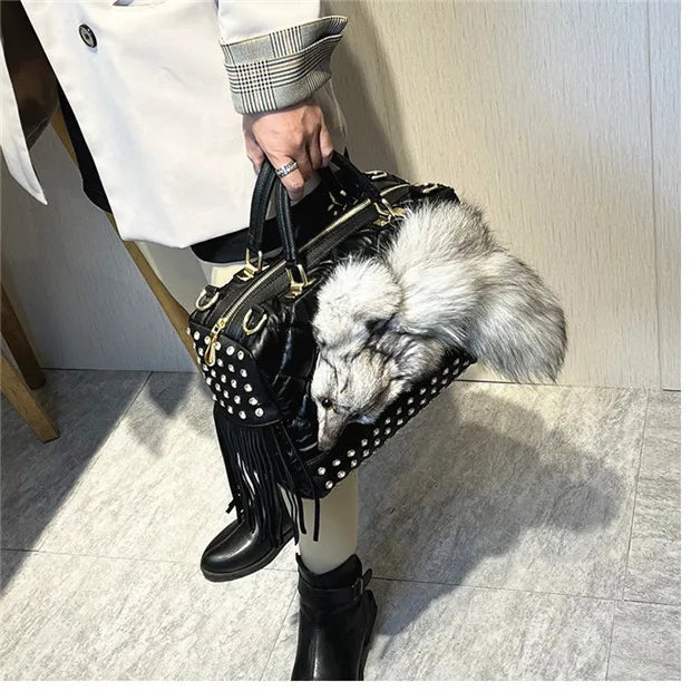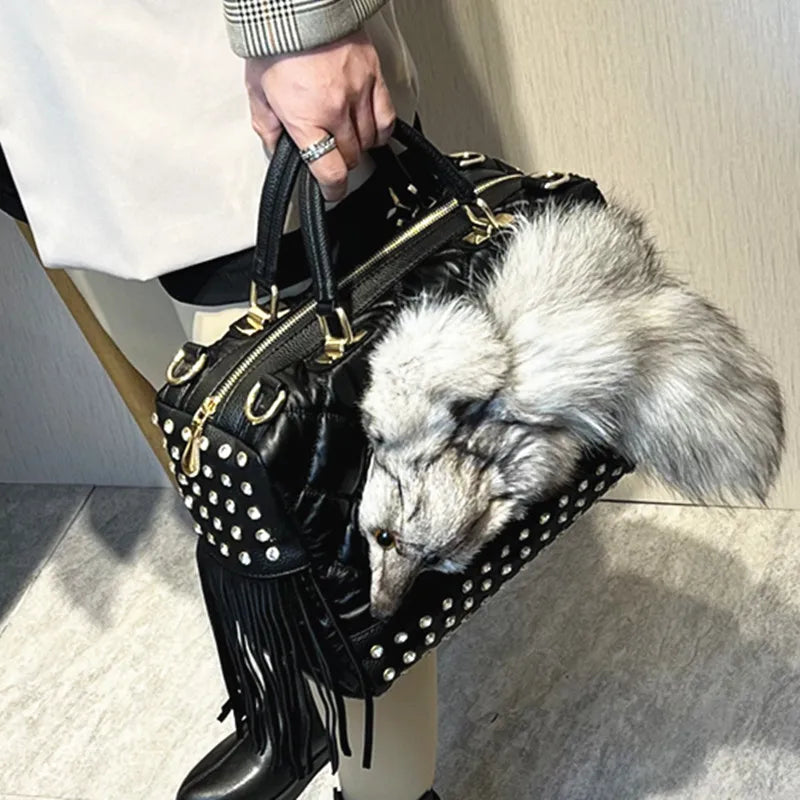 Women's Casual Fashion Soft Leather Fox Hair Fringe Diamond Handbag