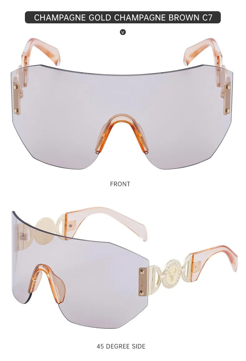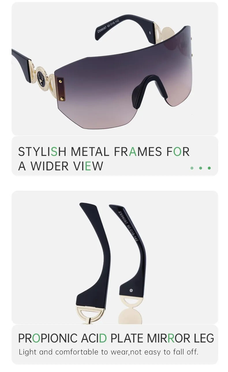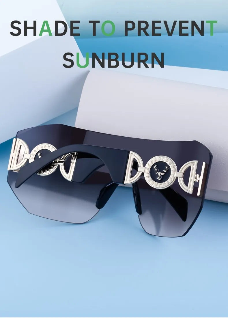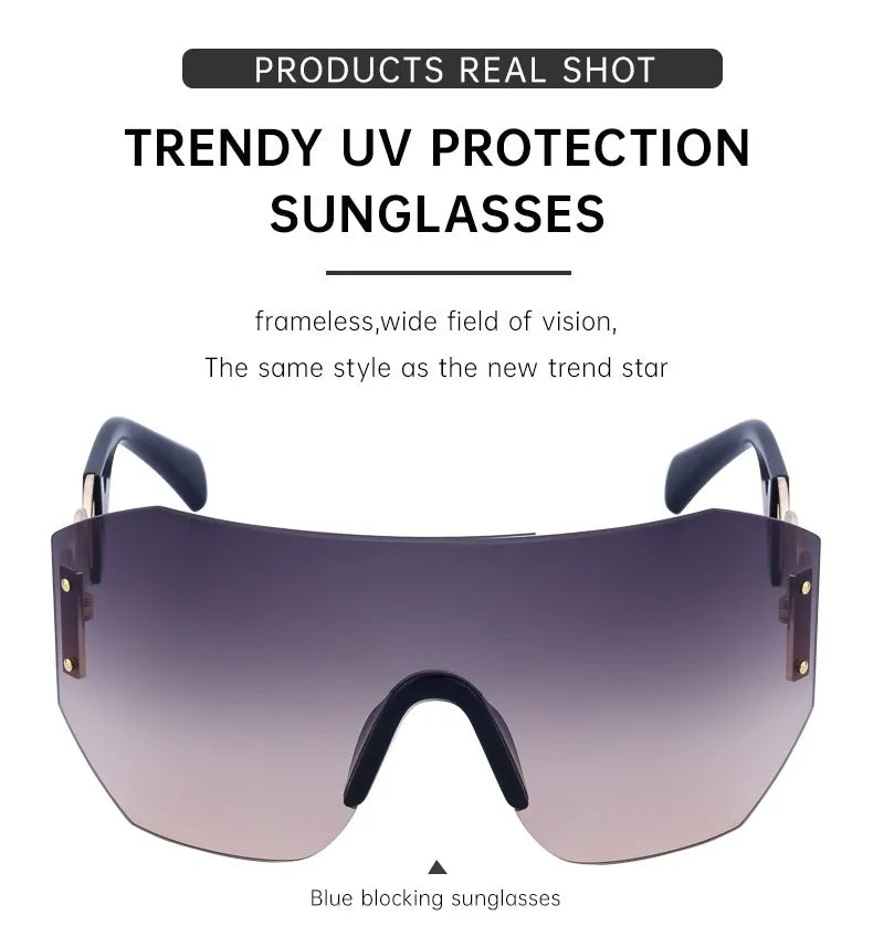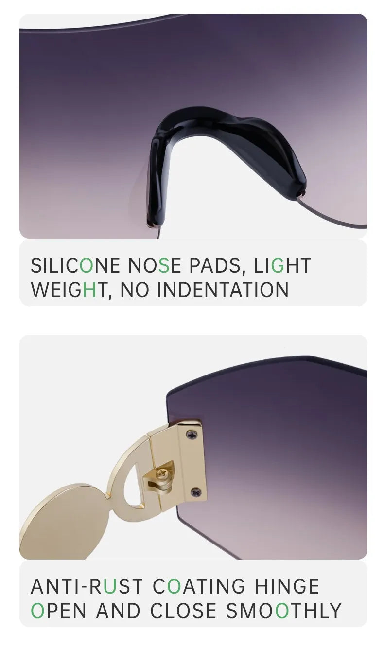 Designed for modern women, these oversized rimless sunglasses combine elegance and functionality. The sleek design with an alloy frame and polycarbonate lenses makes it comfortable and perfect for everyday wear. The UV400, gradient lenses provide protection against harmful UV rays. Offers both practicality and elegance!