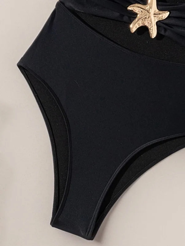 This monokini offers a sexy and contemporary design for fun beach style and everyday swimming. Made with polyester, it is comfortable and durable. The one-piece structure in a bandeau style and hollow out detailing gives a neat look. Its solid black color is highlighted with the starfish-shaped embellishment. Choose this monokini today and update your summer essentials.