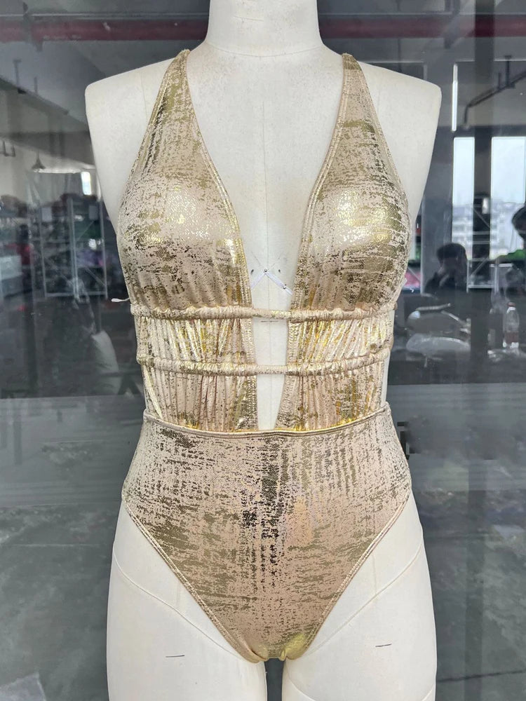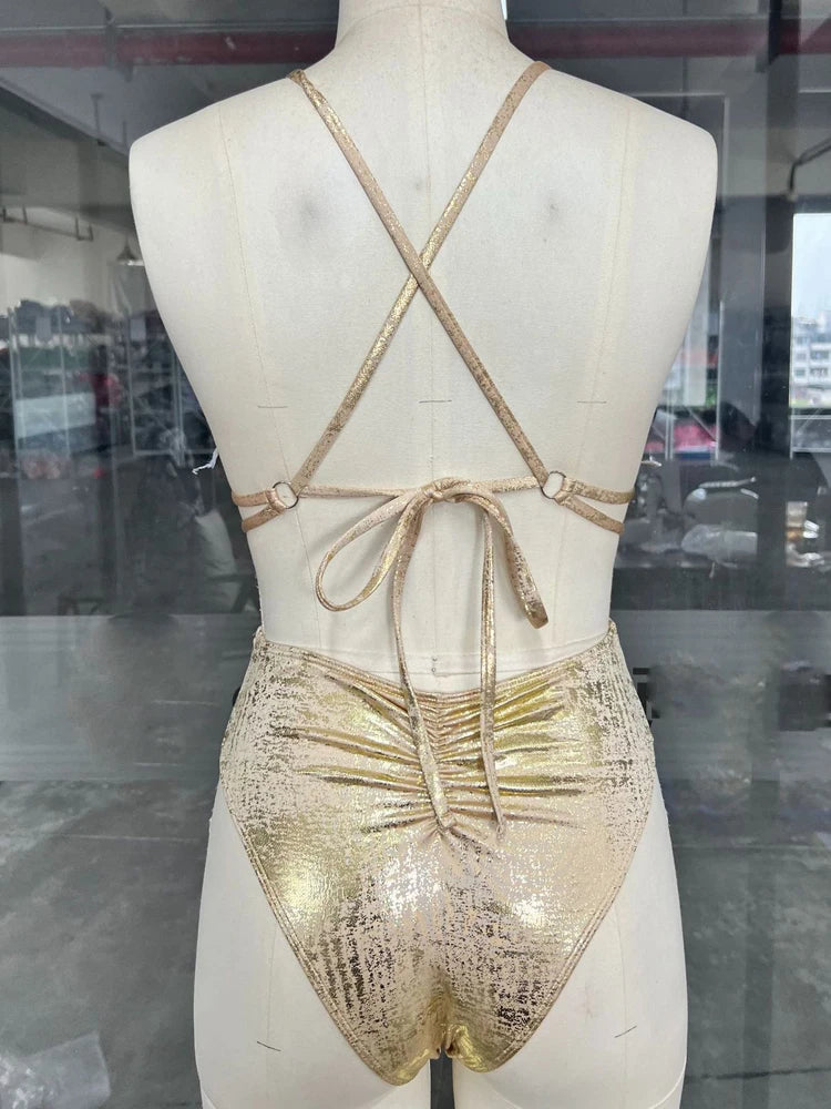 Women's Golden Hollow High Cut Push Up Backless Beach Bathing One Piece Swimwear