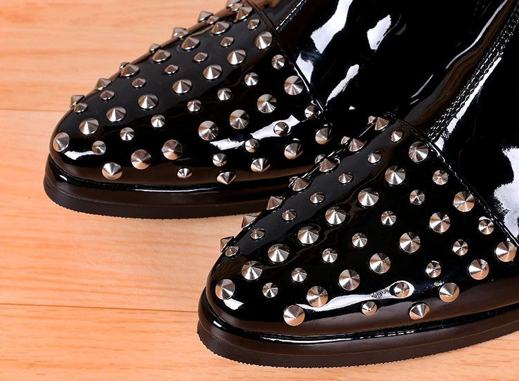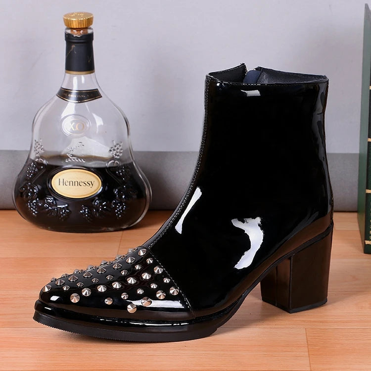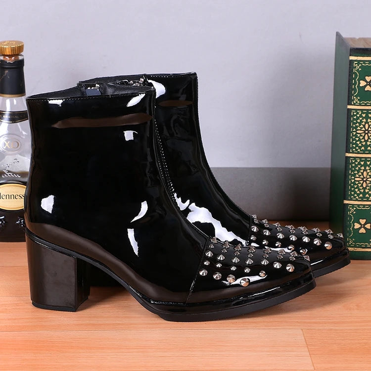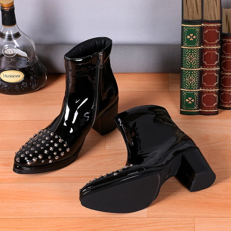 Men's Classic Italian Patent Leather Metal Rivets Pointed Toe Ankle Boots