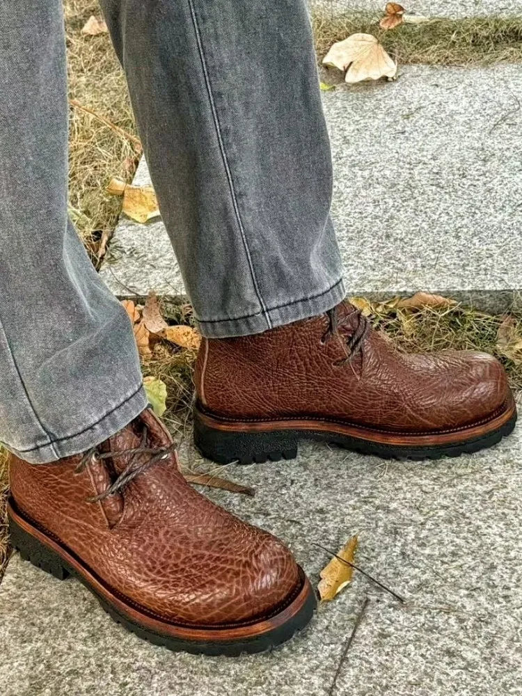 Men's Handmade Retro Style Cowhide Round Toe Mid Heel Hard Wearing Ankle Boots
