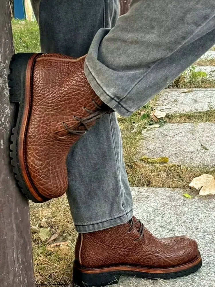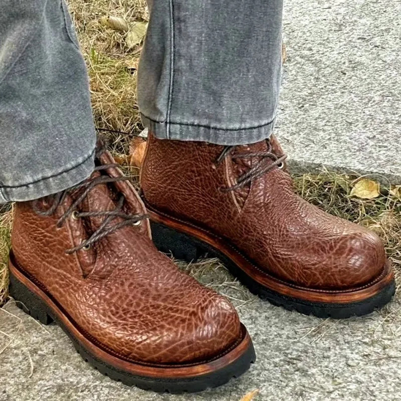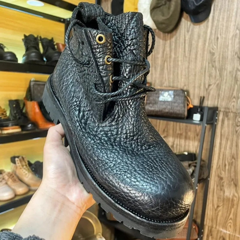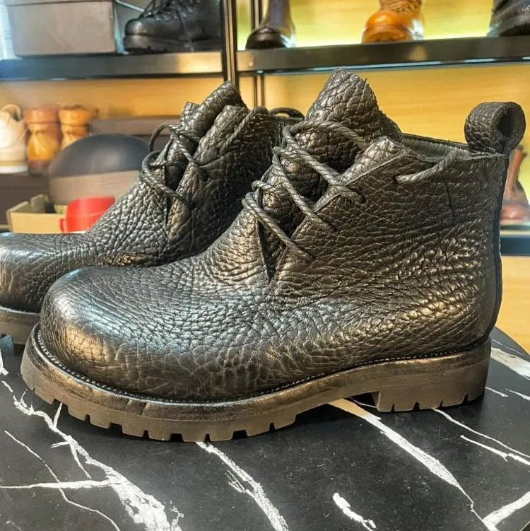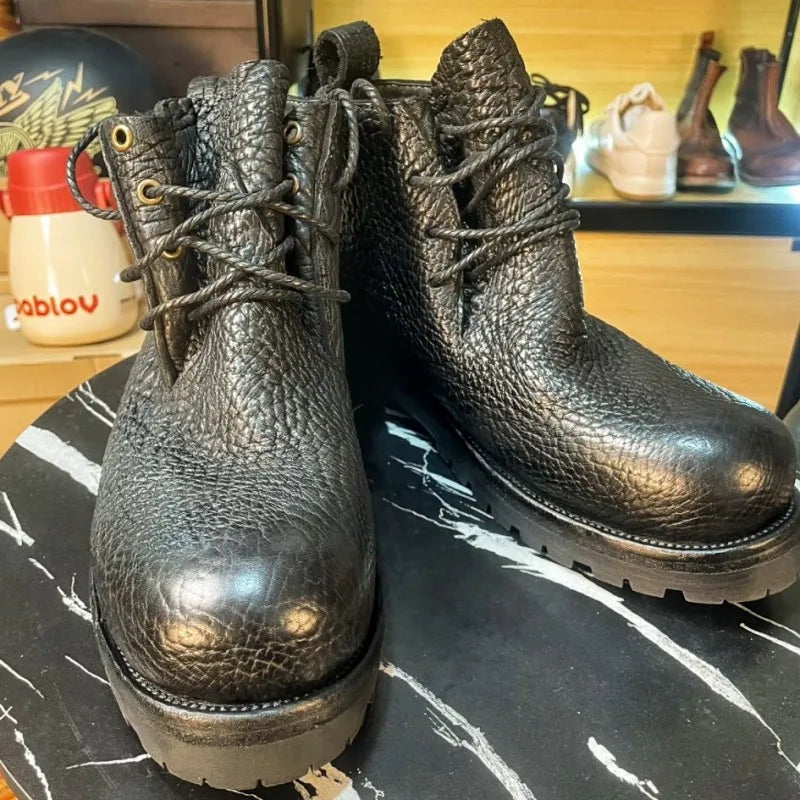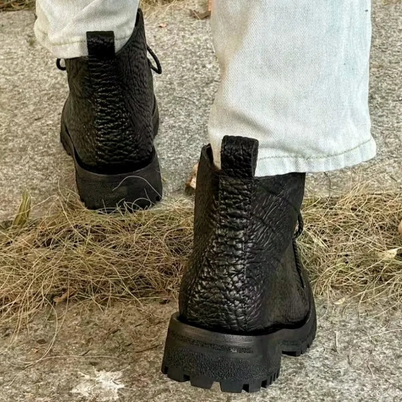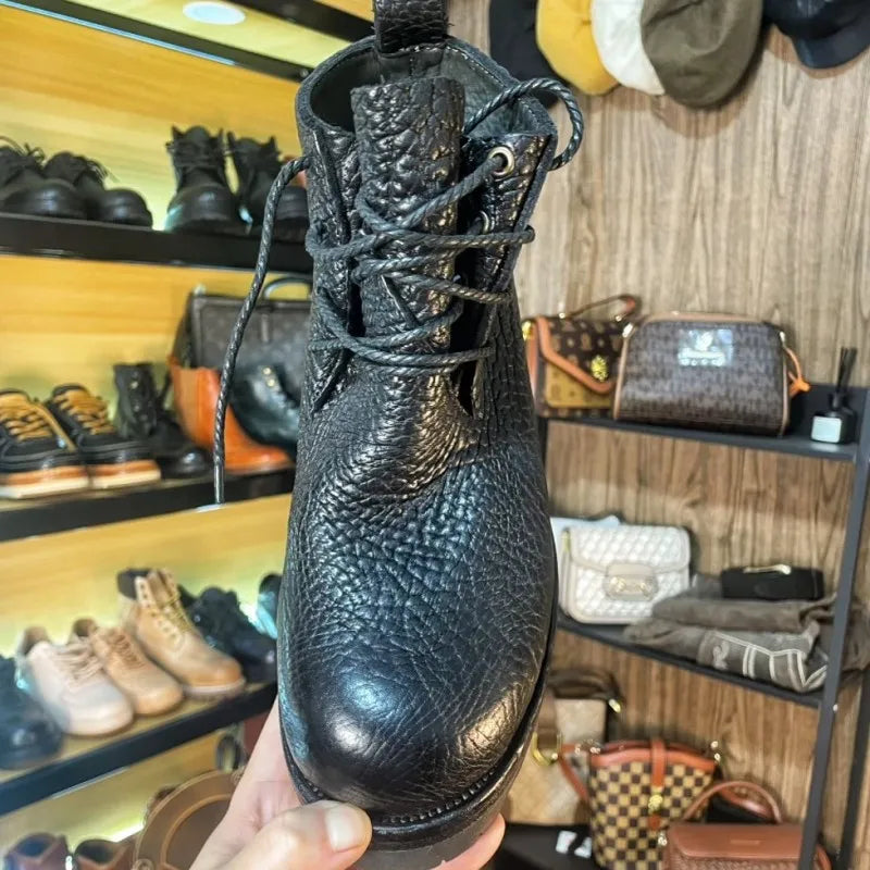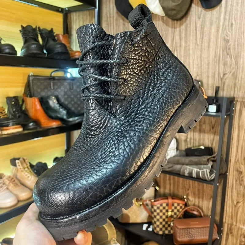 Designed with a genuine leather upper, offering both durability and style, these men's ankle boots are handmade and are perfect for hard wear. It is styled with a round toe shape and retro style to impress retro style lovers. Buy now!