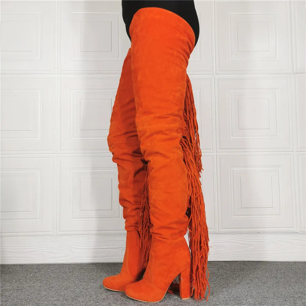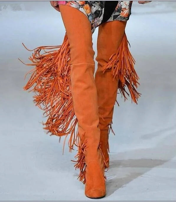Women's Winter Fashion Fringe High Heel Pointed Toe Thigh High Boots