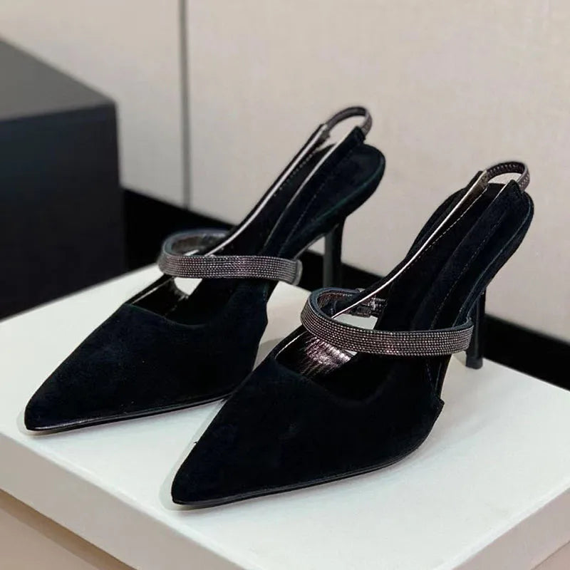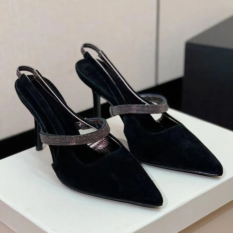 Women's 9cm High Heels Pointed Toe Beaded Suede Leather Black Pumps