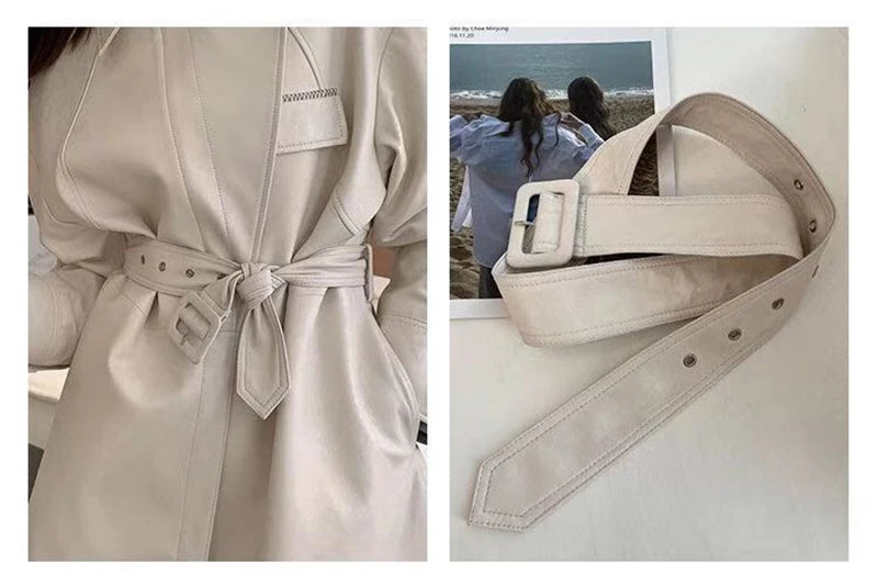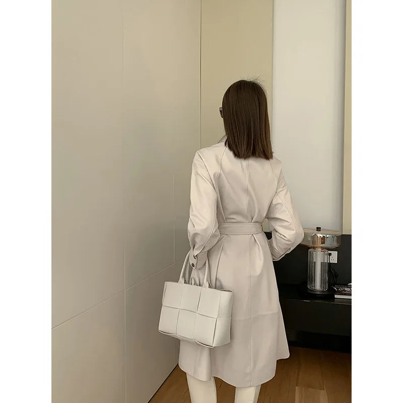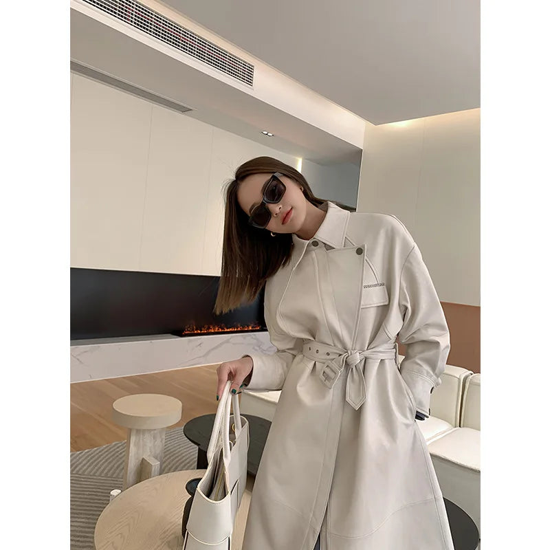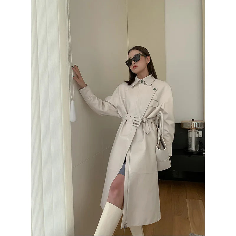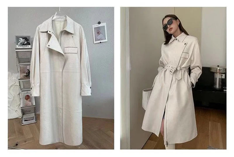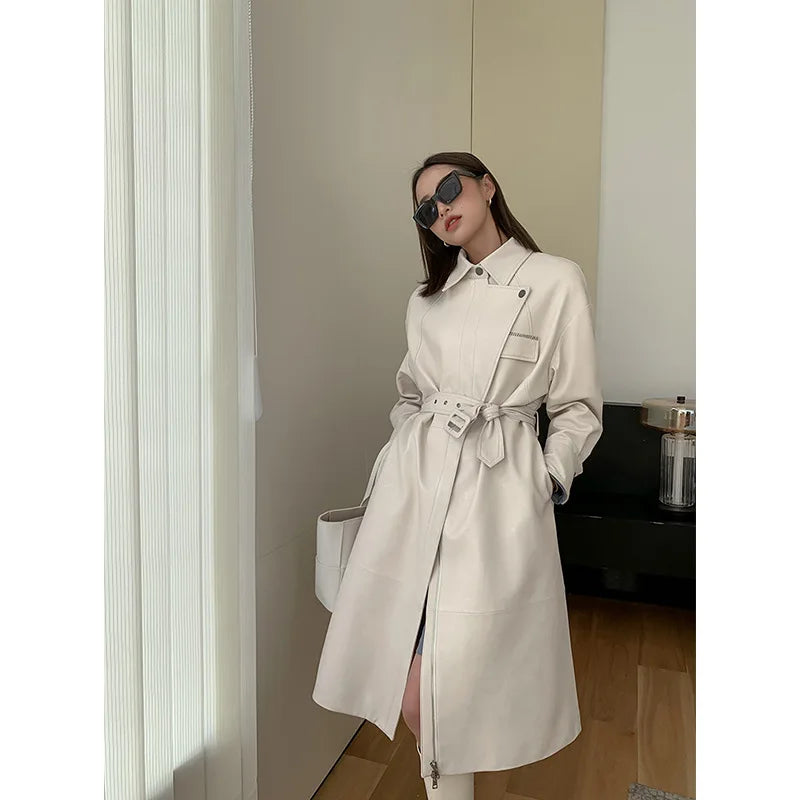 Autumn Winter Women's Sheepskin Slim Belt Zipper Long Trench Coat