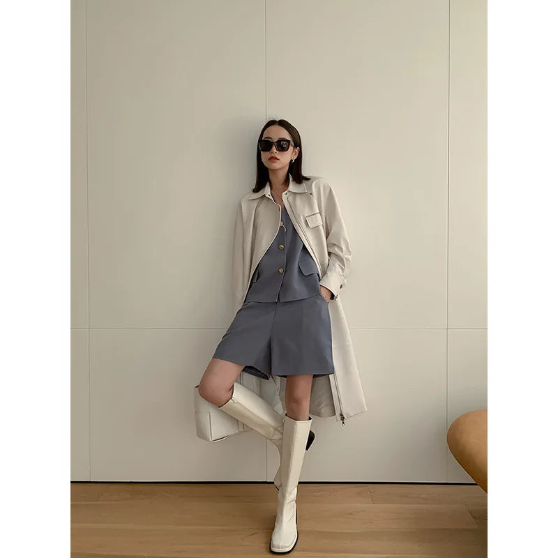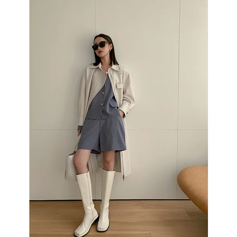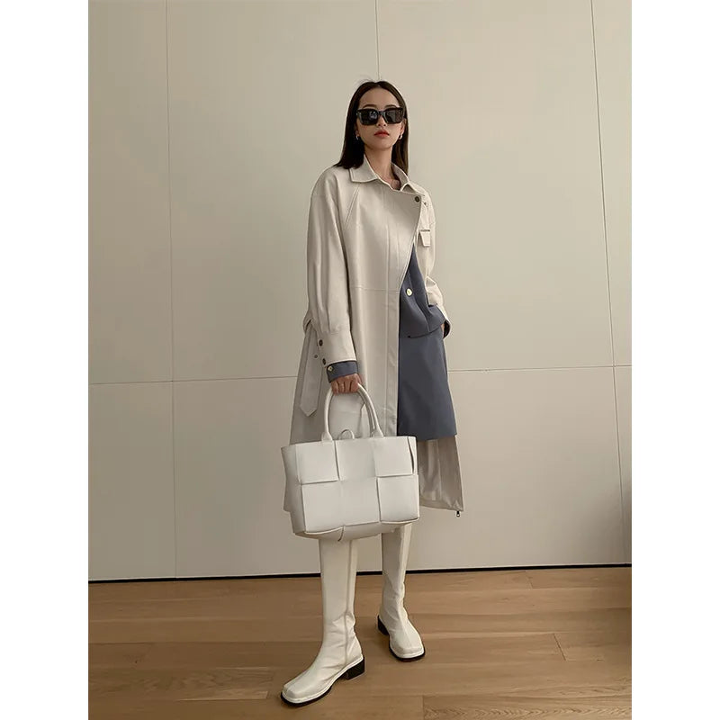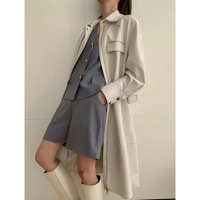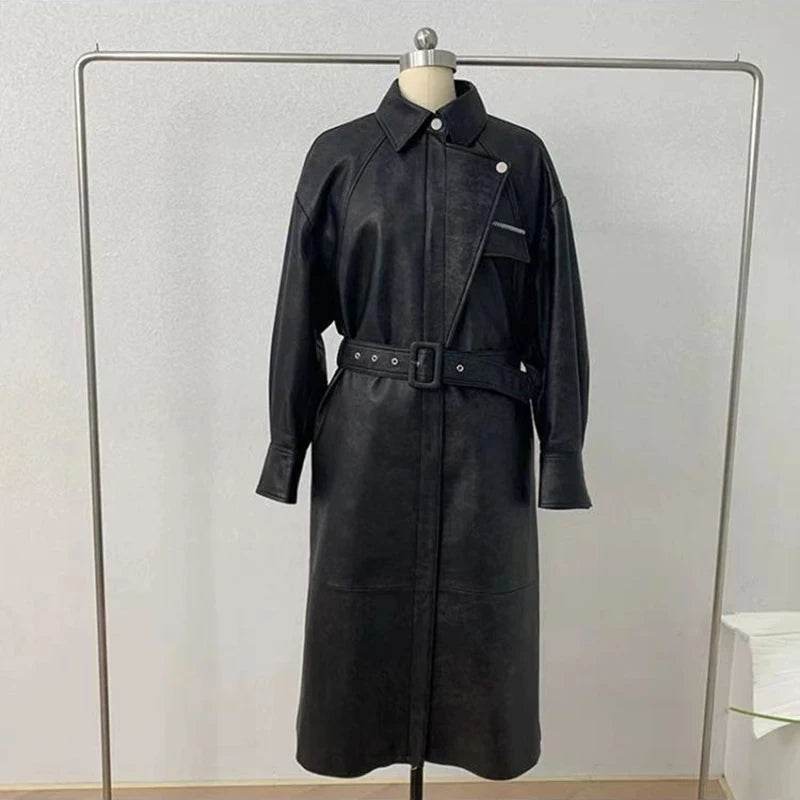 Autumn Winter Women's Sheepskin Slim Belt Zipper Long Trench Coat