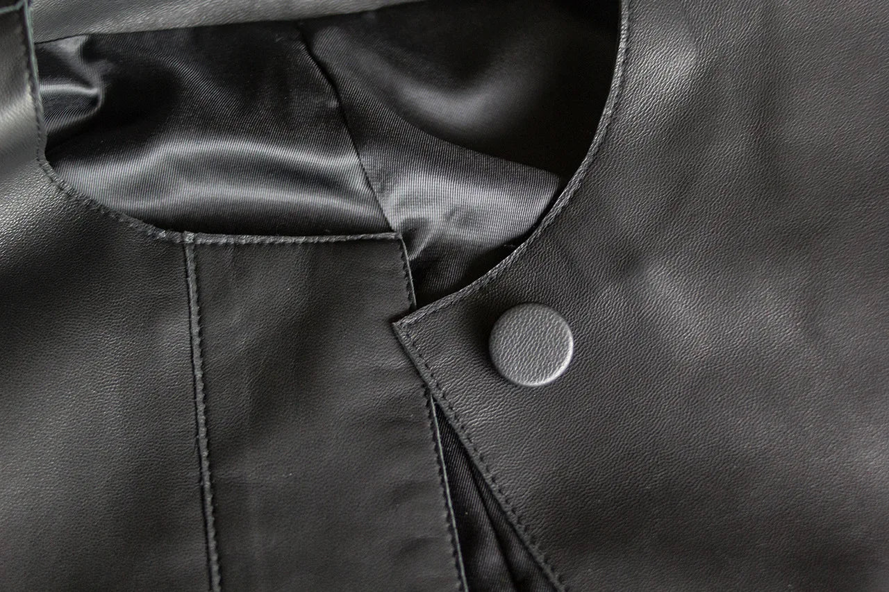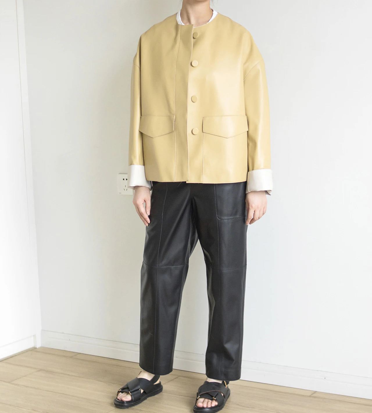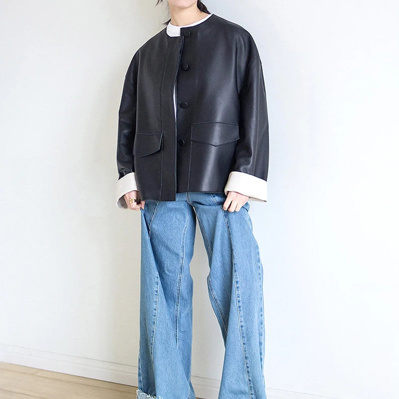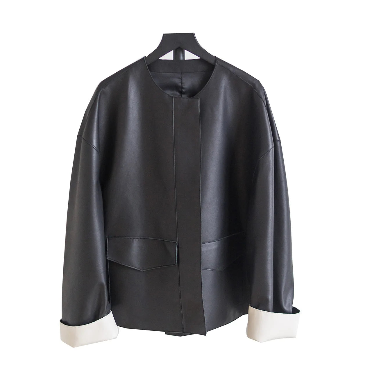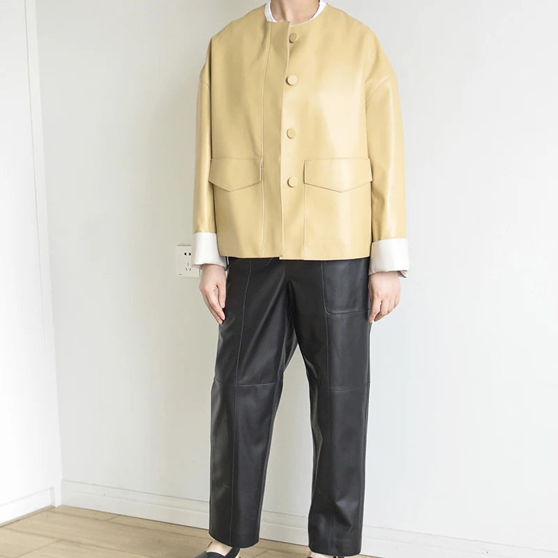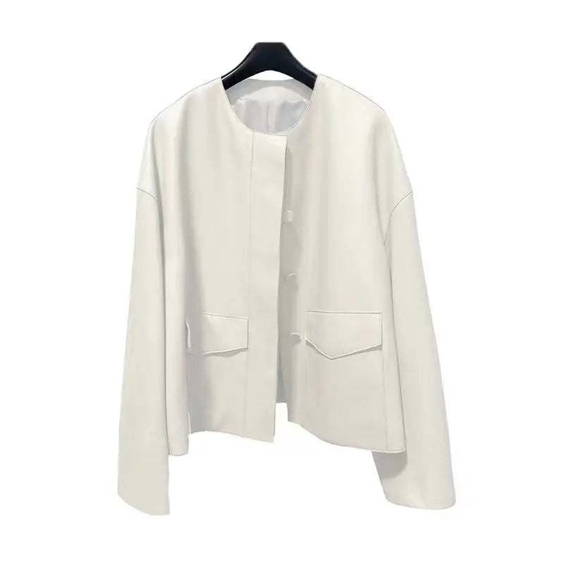 Women's Sheepskin Leather O-Neck Single Breasted Pocket Retro Loose Casual Jacket