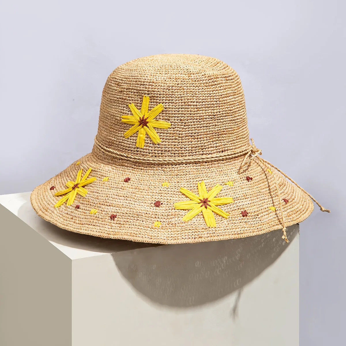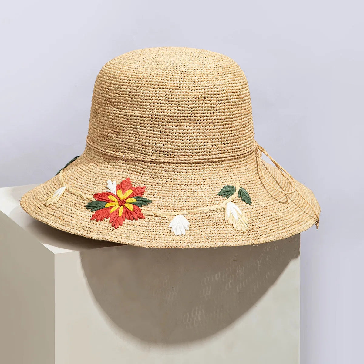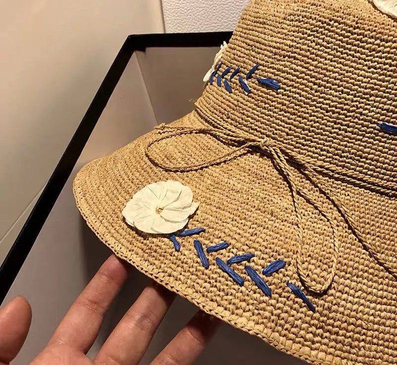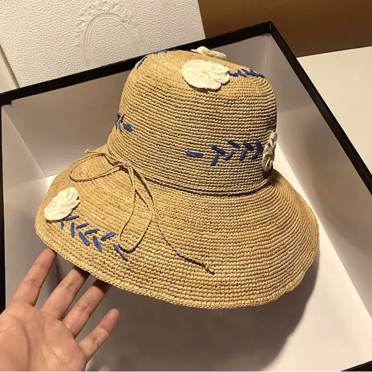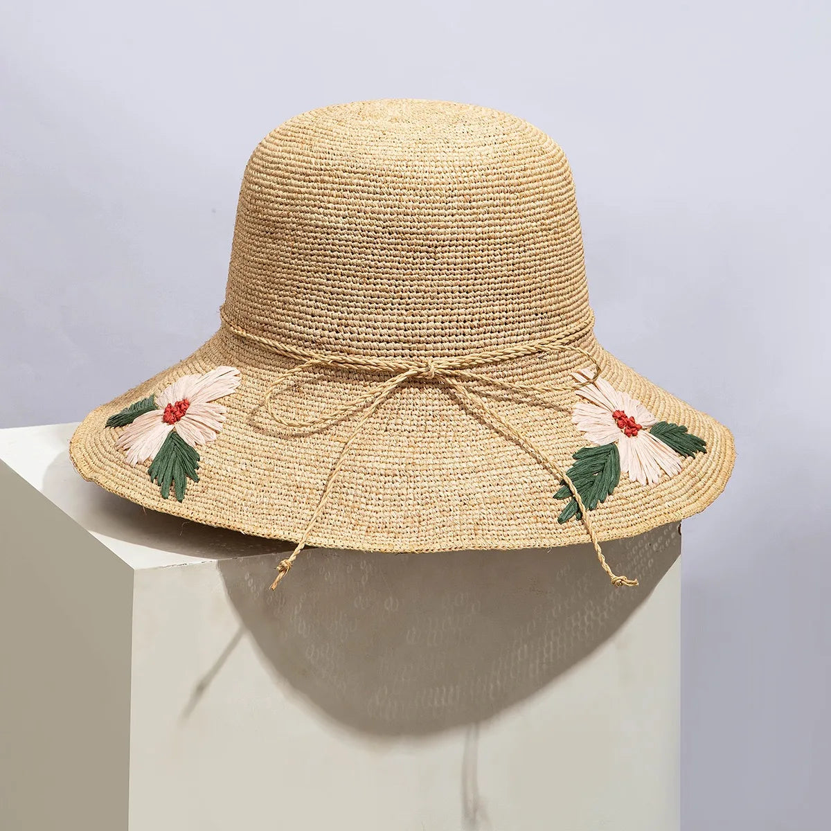 Raffia Straw Embroidery Flowers Sun Protection Big Edge Bucket Beach Sun Hat for Women