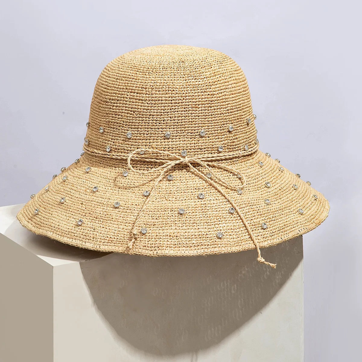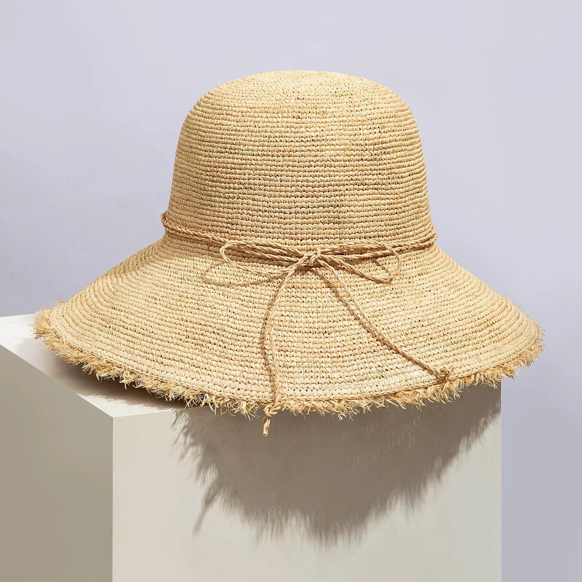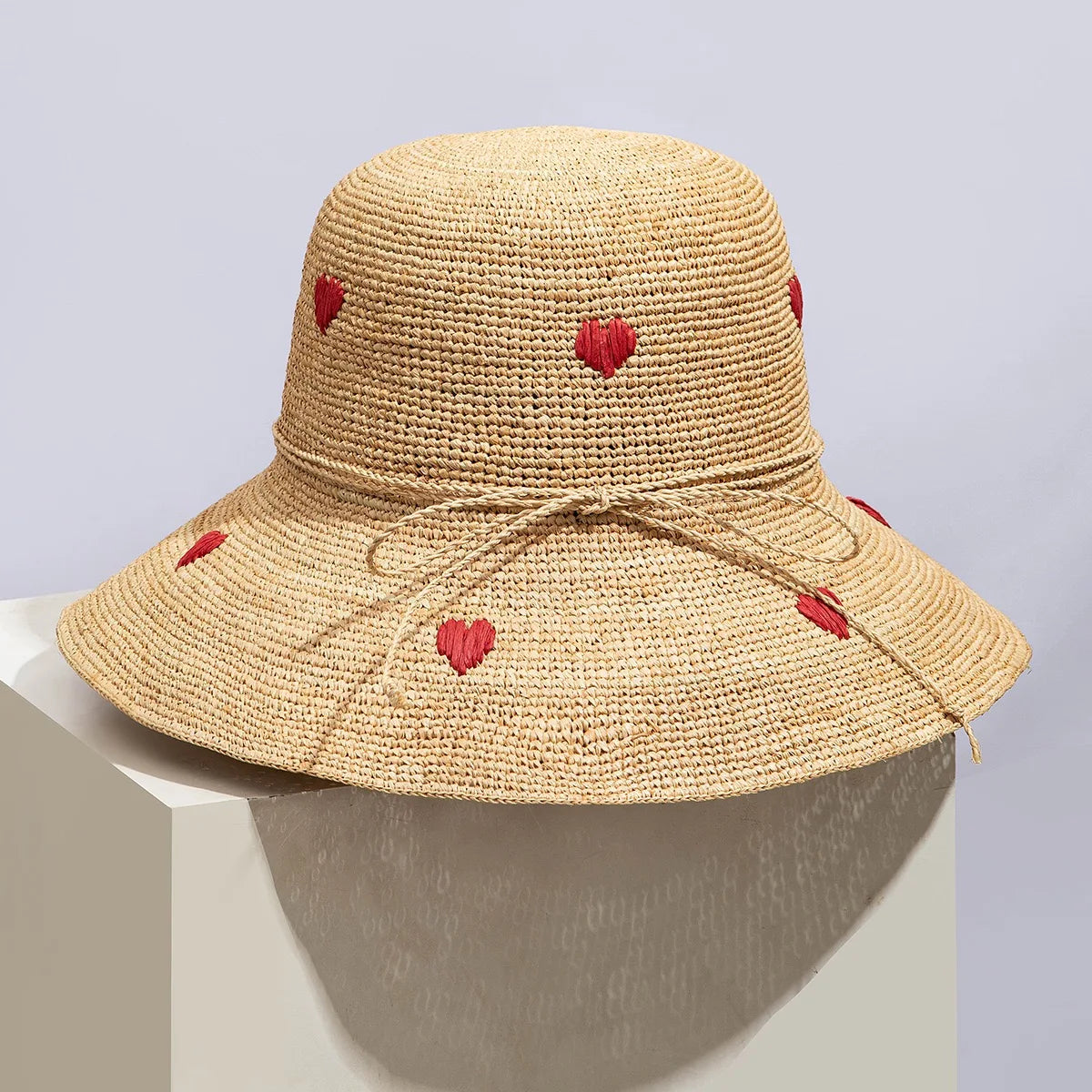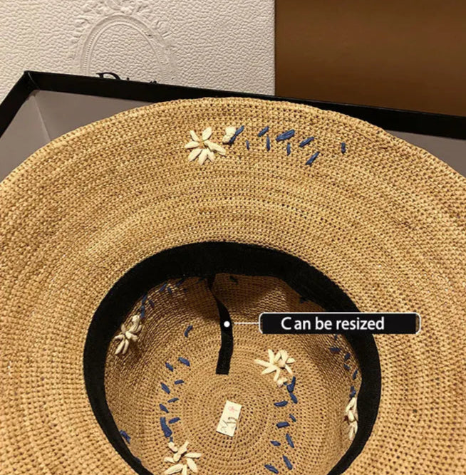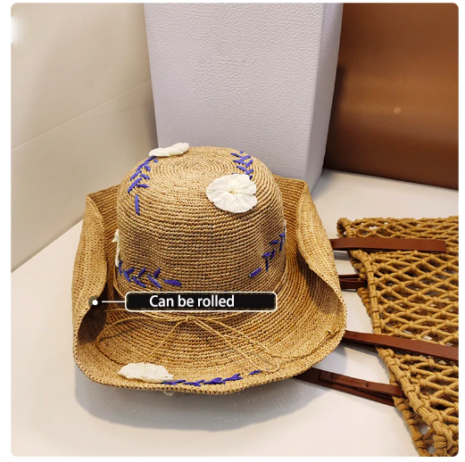 Raffia Straw Embroidery Flowers Sun Protection Big Edge Bucket Beach Sun Hat for Women