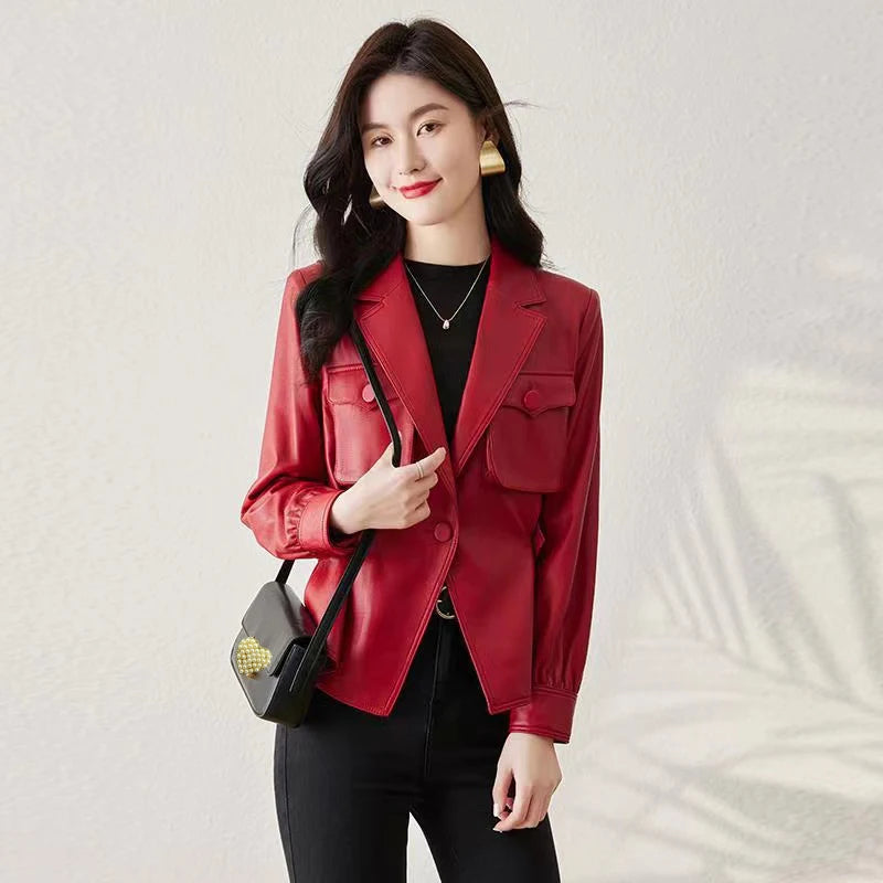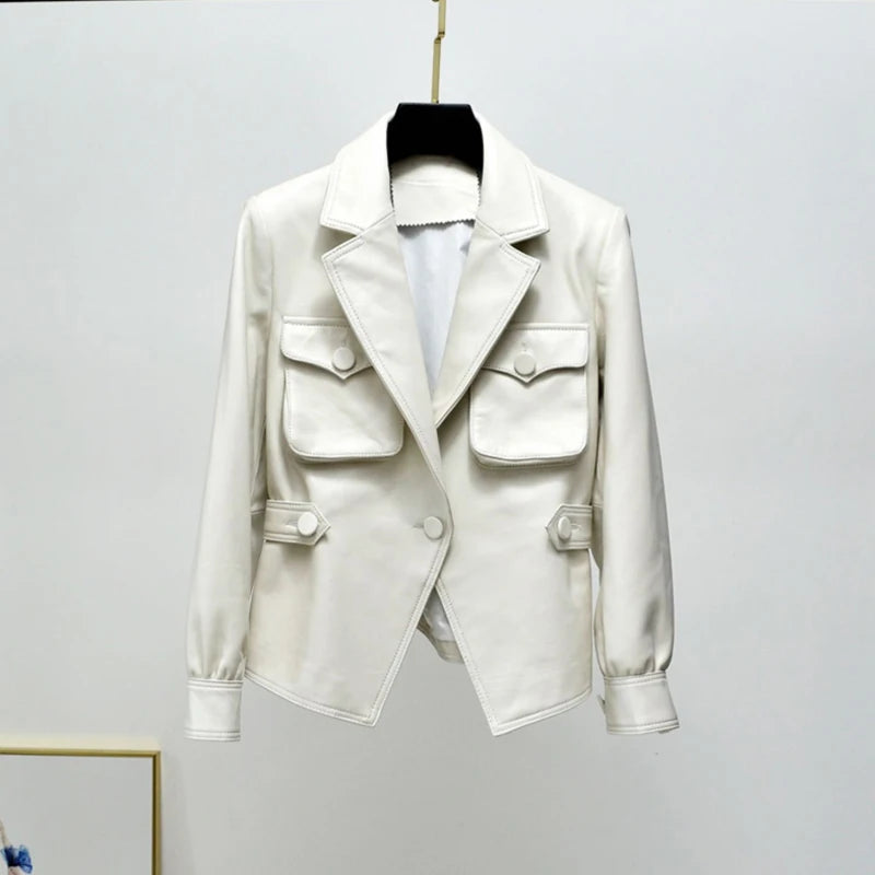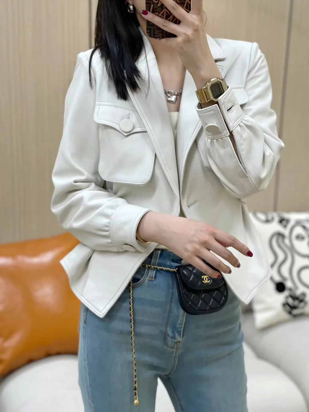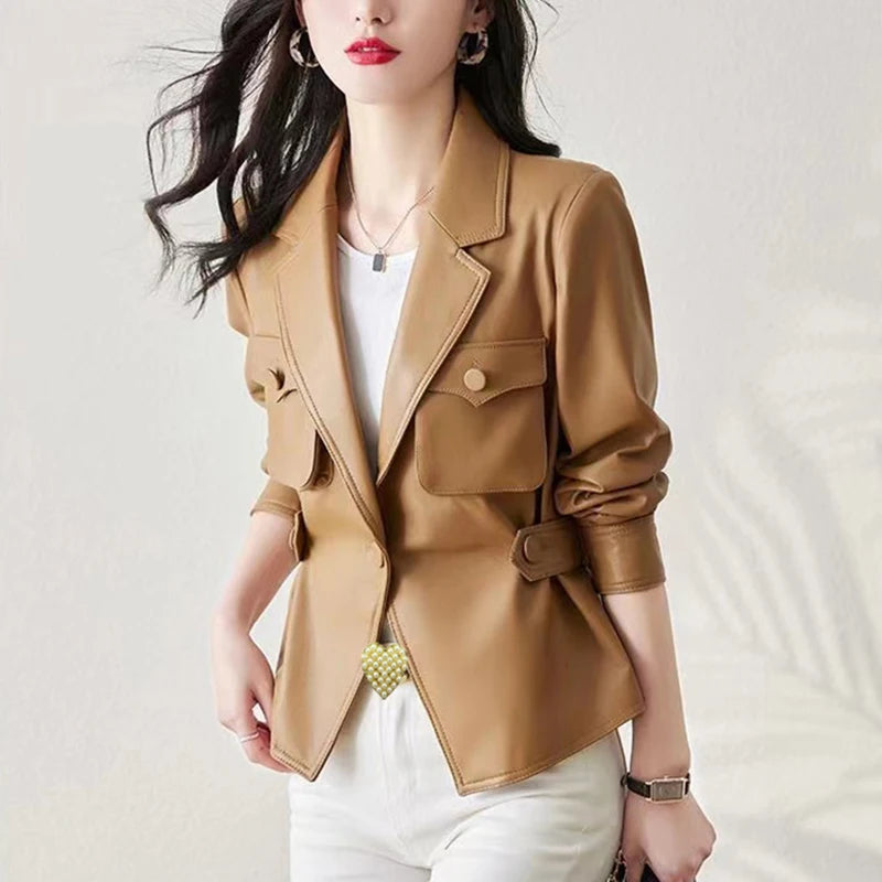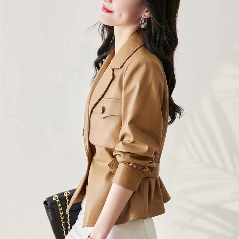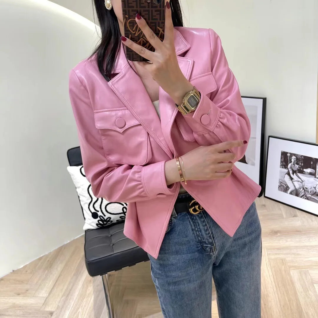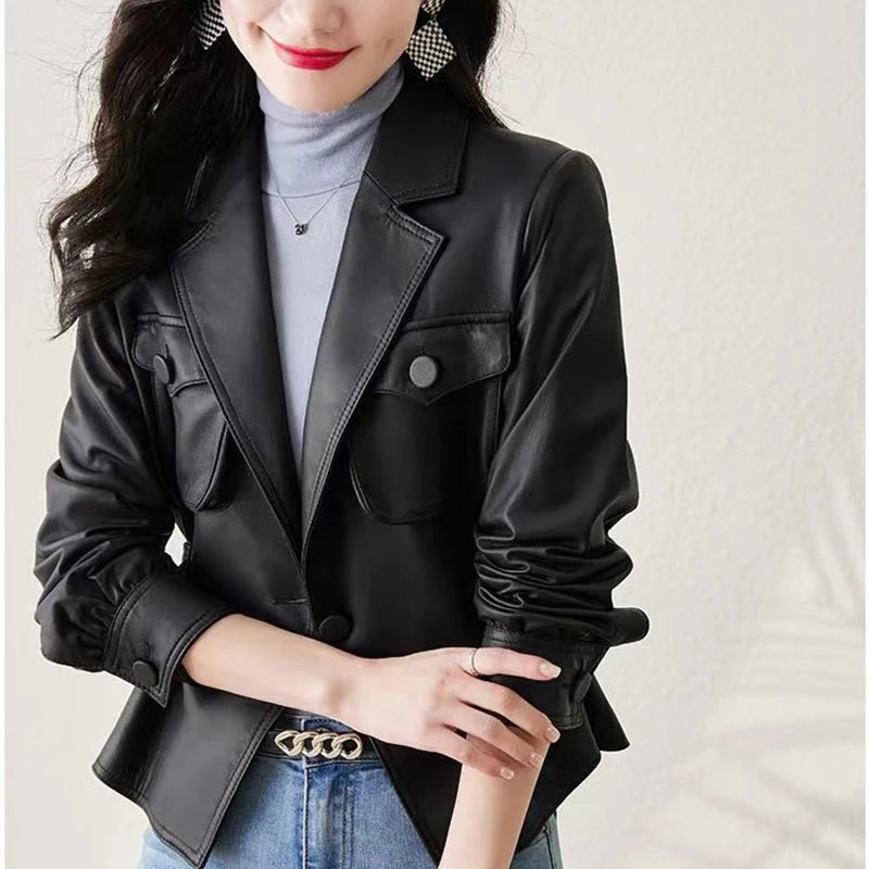Genuine Leather Loose Style Big Pocket Slim Waist Short Blazer Jacket for Women
