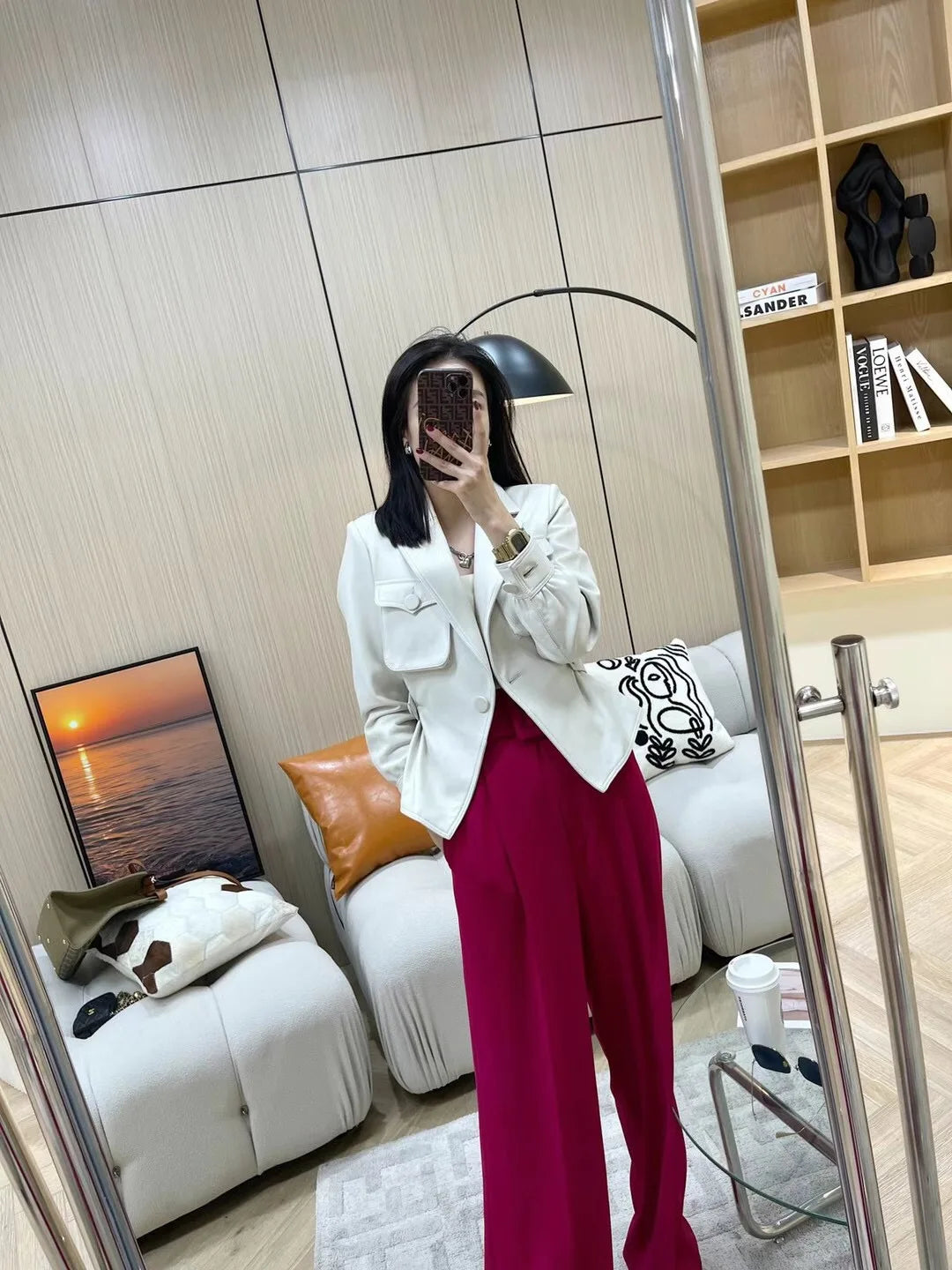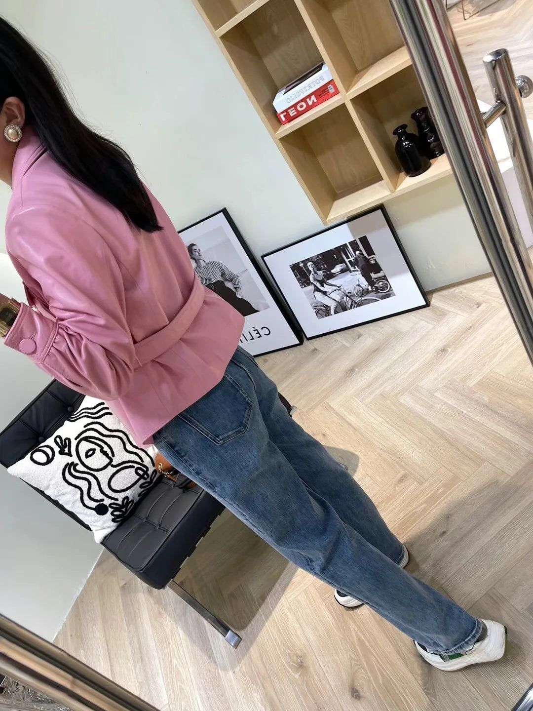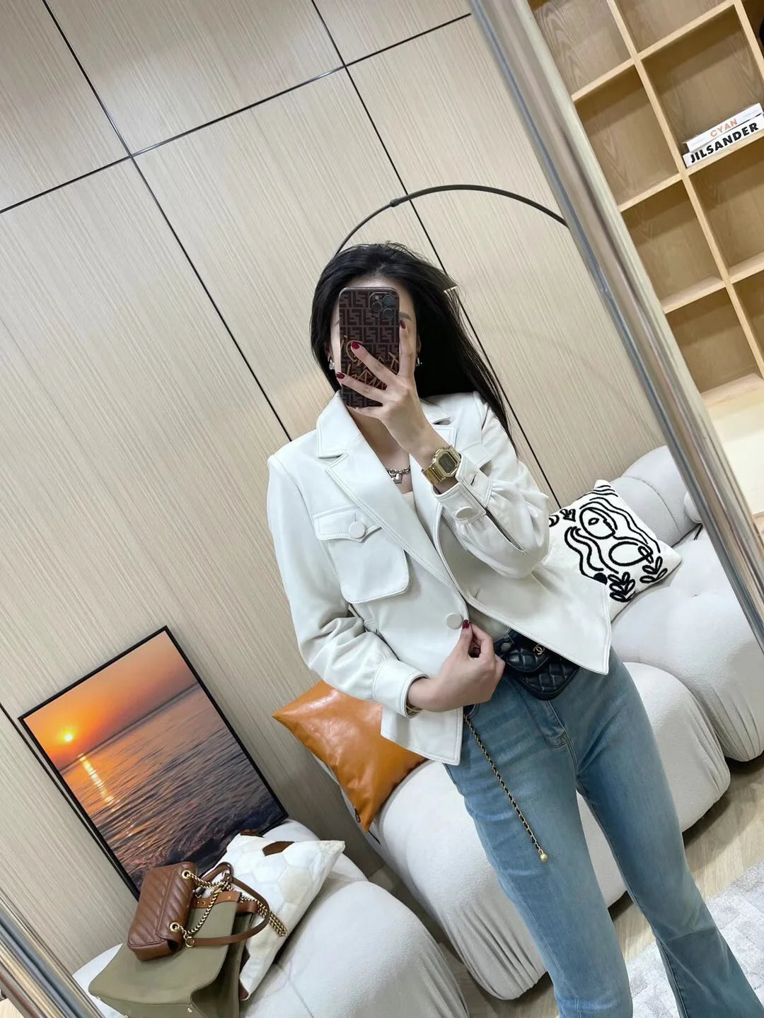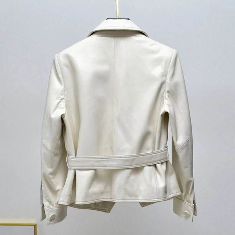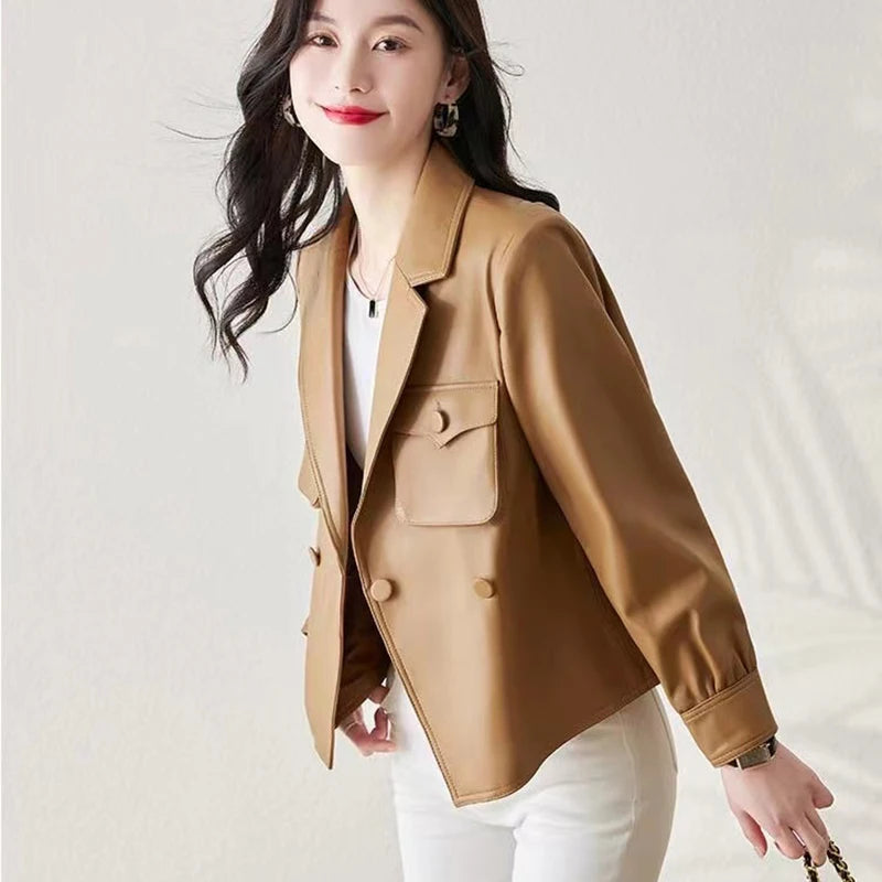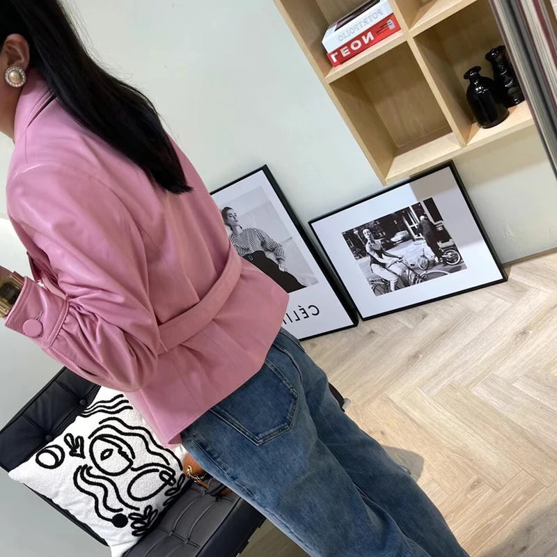 Genuine Leather Loose Style Big Pocket Slim Waist Short Blazer Jacket for Women
