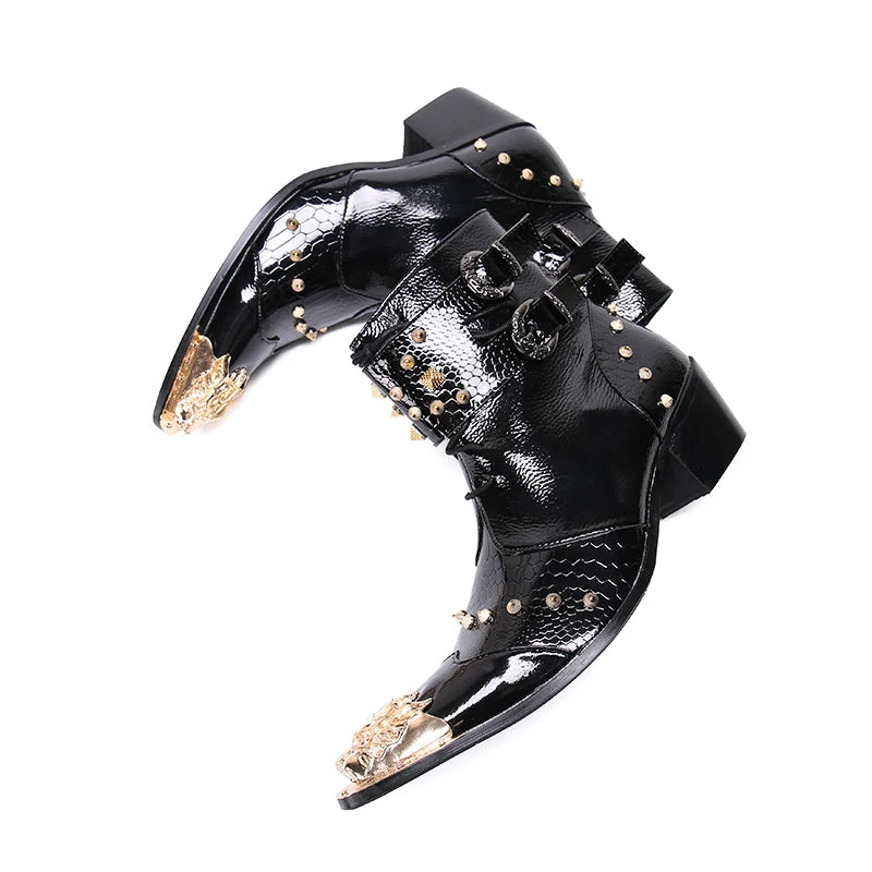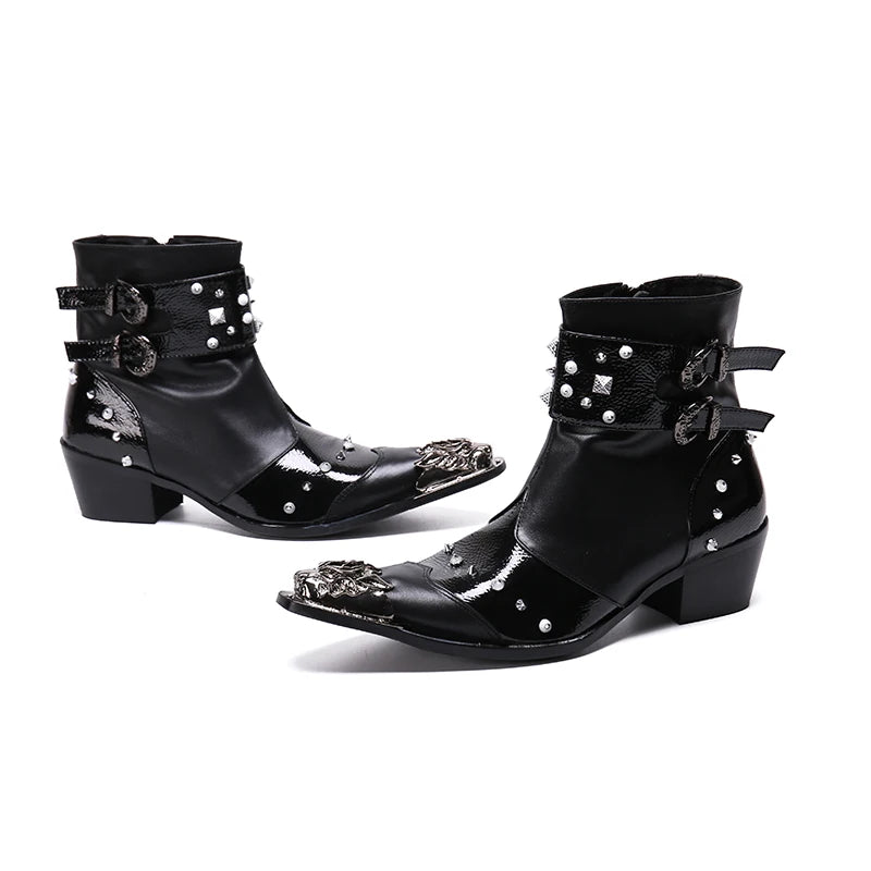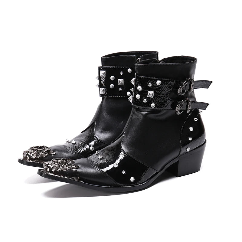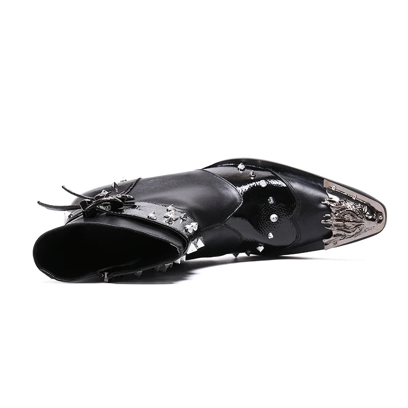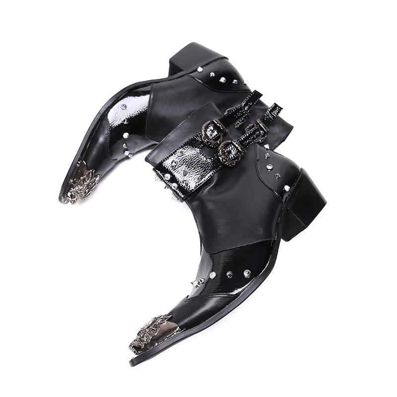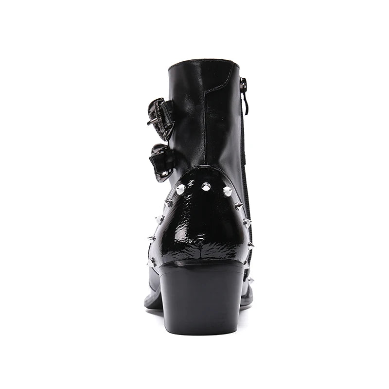 Italian Style Real Leather Pointed Toe Buckle Rivets Ankle Dress Boots