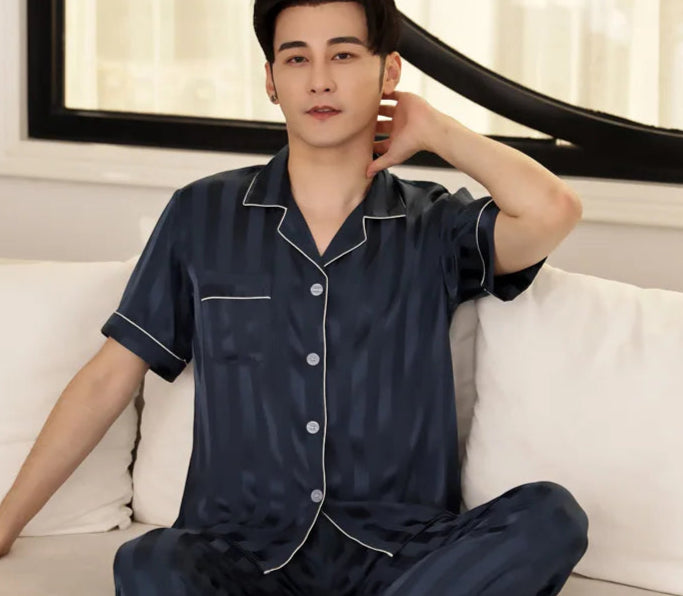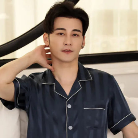 Spring Autumn Thin Blue Polyester Ice Silk Short-sleeved Sleepwear Pajama Set for Men