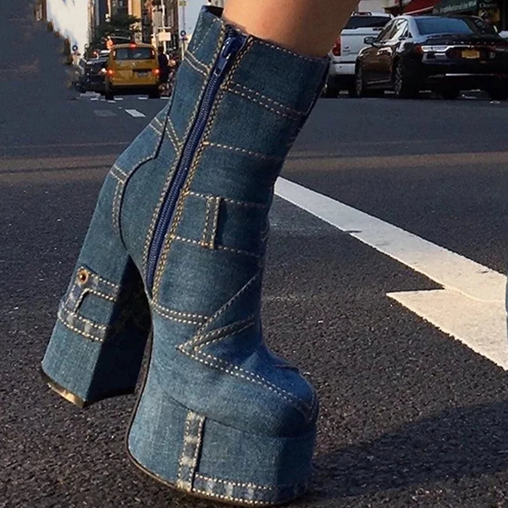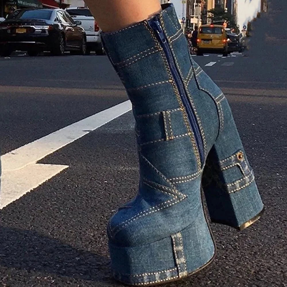 Ladies Blue Denim Zipper Chunky Platform Heel Cowboy Calf Boots