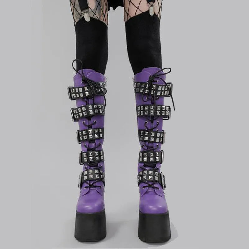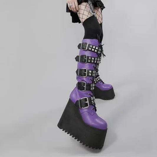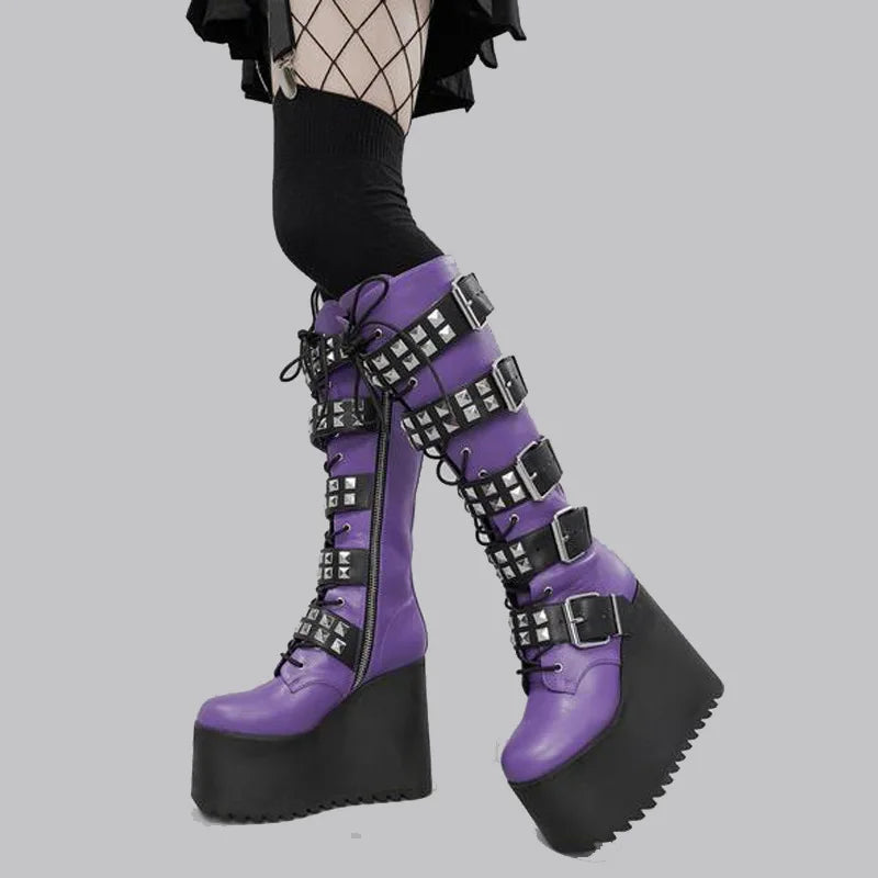 Ladies Purple Gothic Metal Decor Lace-up Knee High Wedge Heel Platform Boots