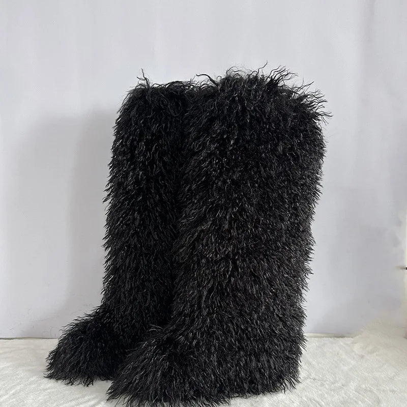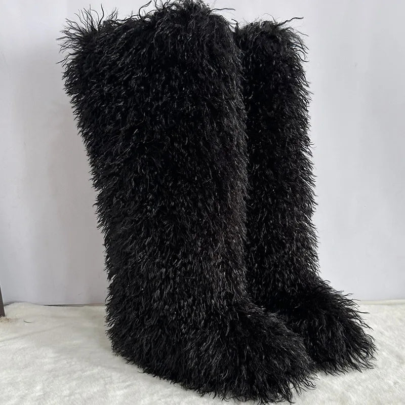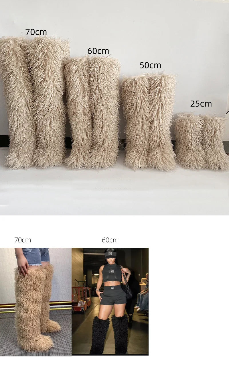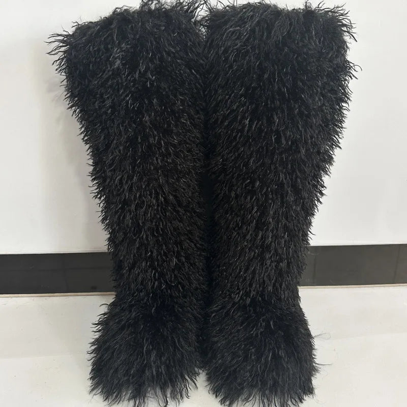 Women's Black Warm Plush Faux Fur 60cm Long Over Knee Snow Boots