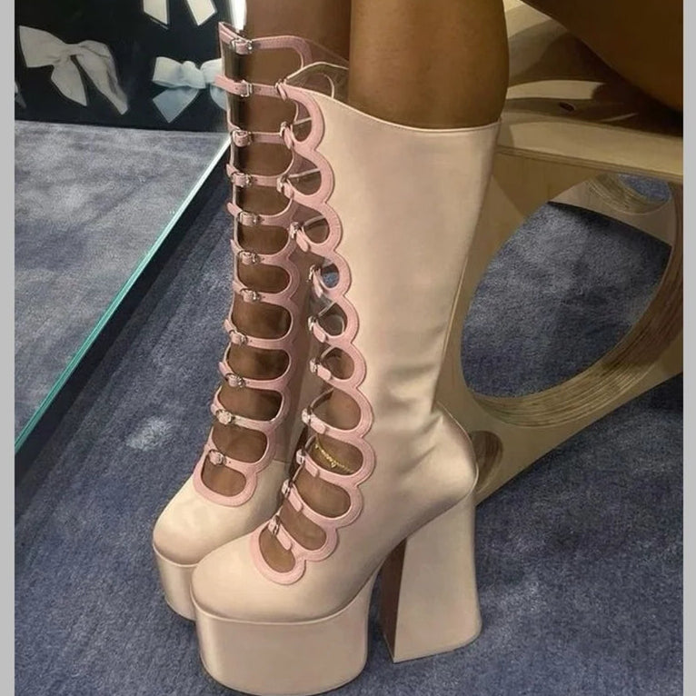 Women's Chunky Platform Heel Multi-Buckle Strap Hollow Cut-Out Boots