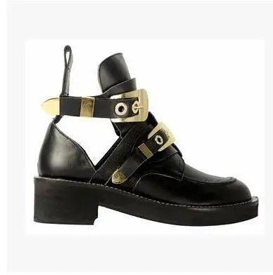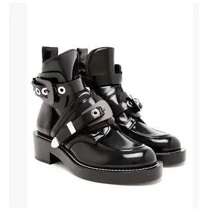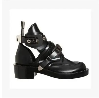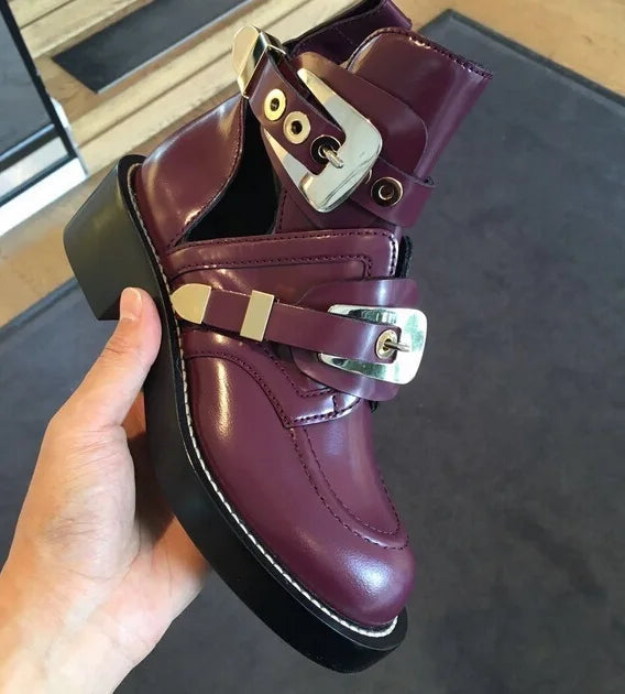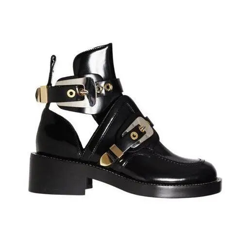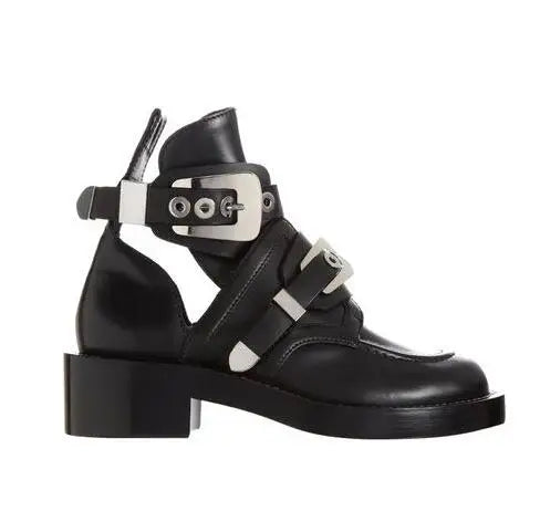 Women's Leather Cut Out Buckle Strap Square Heel Motorcycle Boots